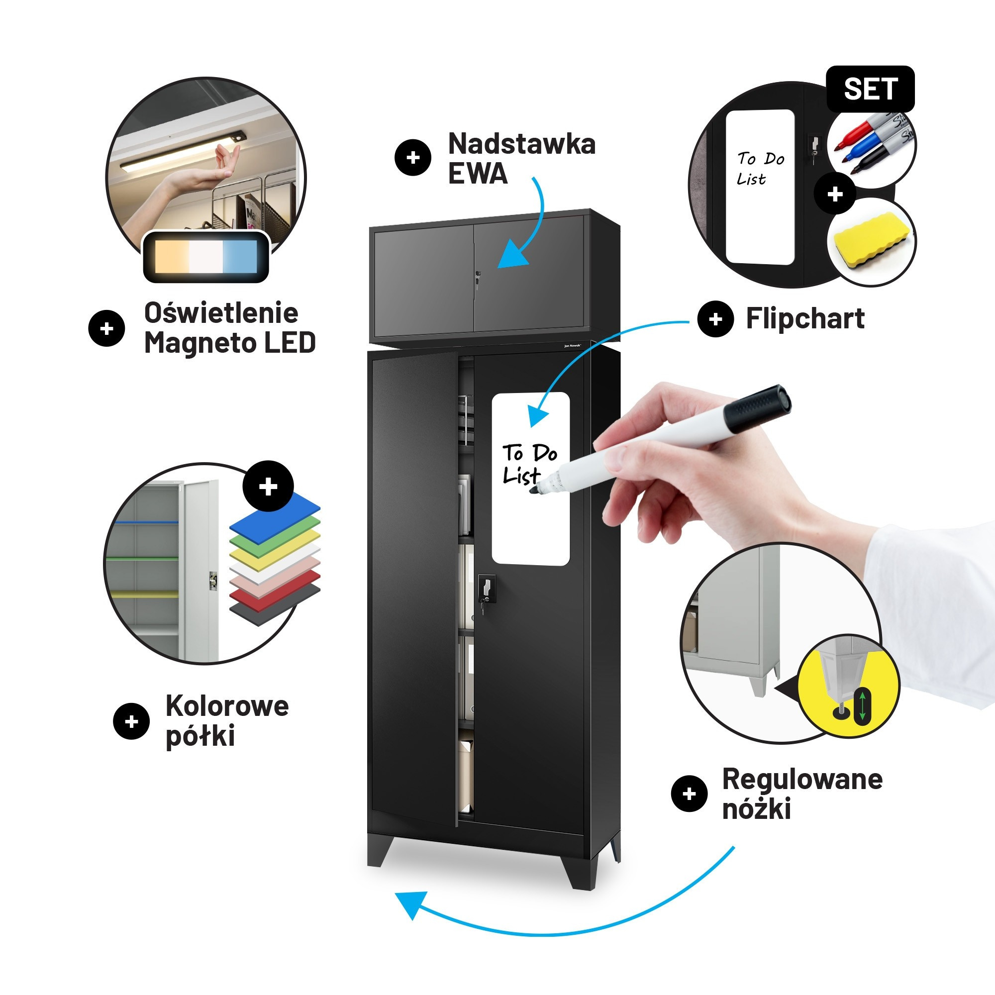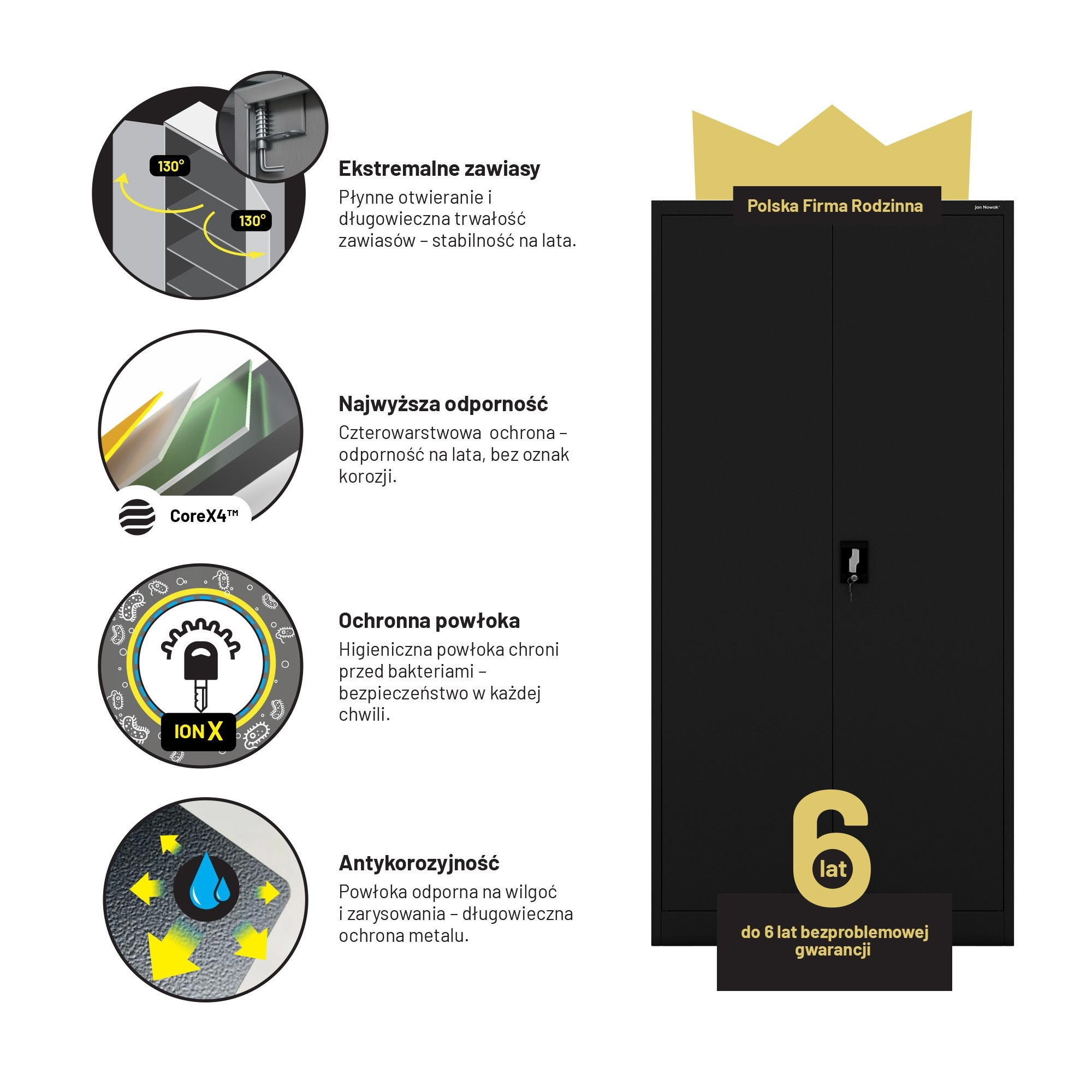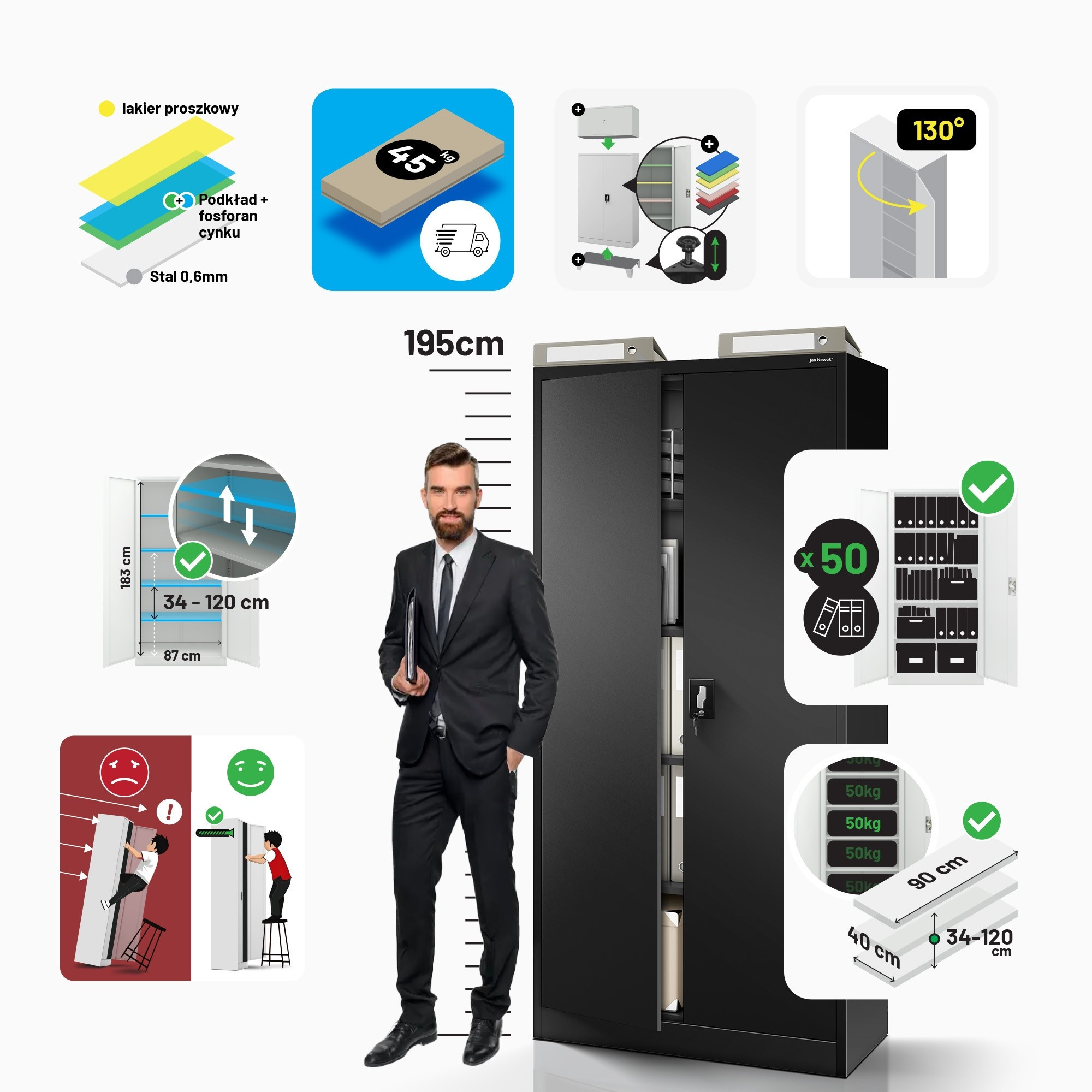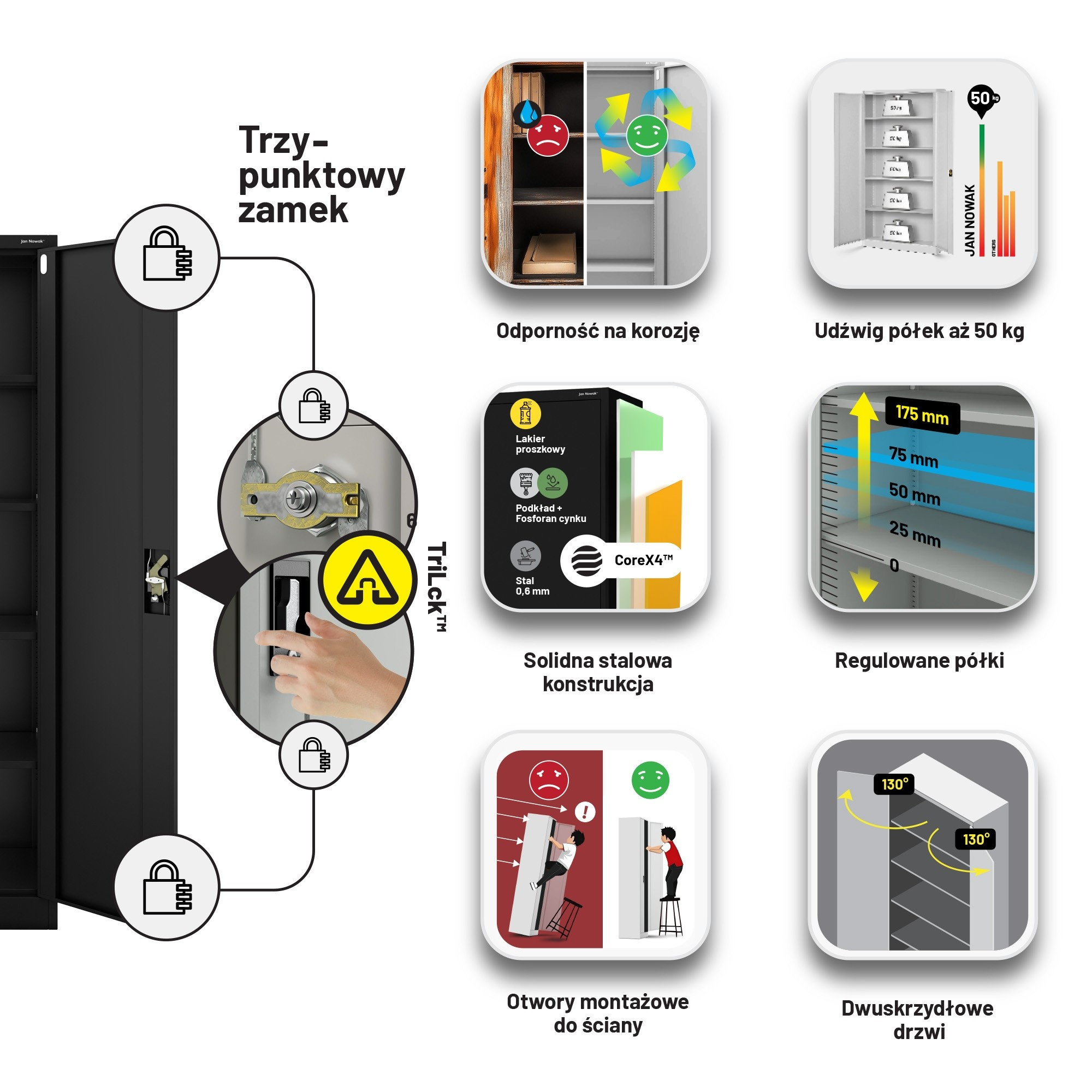 Kovová skříň JAN H – černá JAN H je kancelářská skříň z oceli, která se osvědčí v jakýchkoli podmínkách. Byla vyrobena z nejkvalitnějších materiálů a získala mimořádně prostorný interiér, díky čemuž umožní mnoho let bezpečného a uspokojivého ukládání dokumentů a nejdůležitějších předmětů. Naše ocelová skříň umožní udržet nezbytný pořádek a díky spojení tradiční konstrukce s moderním stylem se skvěle hodí do každého interiéru. Nejčastější použití: kancelářská skříň lékařská skříň skříň na nářadí Model JAN H se osvědčí také ve skladech, archivech, kancelářích nebo dokonce v domácím prostředí. Dokonale doplní jak tradiční, tak avantgardní interiér, a díky univerzální barevnosti se hodí ke všem kusům nábytku. Skříň na dokumenty JAN H – stabilní a odolná Skříň na dokumenty JAN H je trvanlivý a spolehlivý nábytek, který zefektivní každodenní práci na každém místě. Díky možnosti nastavení výšky čtyř polic a kapacitě až 50 šanonů je model JAN H také mimořádně funkční. Dvoukřídlé dveře se zámkem zajištěným ve 3 bodech zajišťují snadný přístup k obsahu a zároveň chrání uložené dokumenty či předměty před přístupem neoprávněných osob. Práškově lakovaná ocel o tloušťce 0,6 mm je odolná proti mechanickému poškození, díky čemuž je kancelářská skříň JAN H produktem poskytujícím mnoho let spokojenosti. Naše kancelářská skříň má otvory na zadní a boční stěně, které umožňují její připevnění ke stěně. Zvýší to bezpečnost každodenního používání. Otvor v horní části skříně umožňuje připevnit nástavec. Parametry: barva: černá RAL 9005 výška: 195 cm šířka: 90 cm hloubka: 40 cm hmotnost: 41 kg Stojí za to vědět: Kancelářská skříň JAN H má záruku kvality — nejlepší materiály a žádné kompromisy ve zpracování. Osvědčení PZH umožňuje bezpečné využití skříně v rámci provozované činnosti. Model JAN H je v souladu s platnými požadavky GDPR. Standardně dodáváme skříň v částech, takže vyžaduje vlastní montáž. Kolekce Kancelářský nábytek – kvalita a trvanlivost od jednoho z největších dodavatelů kovových skříní v Polsku a Evropě.