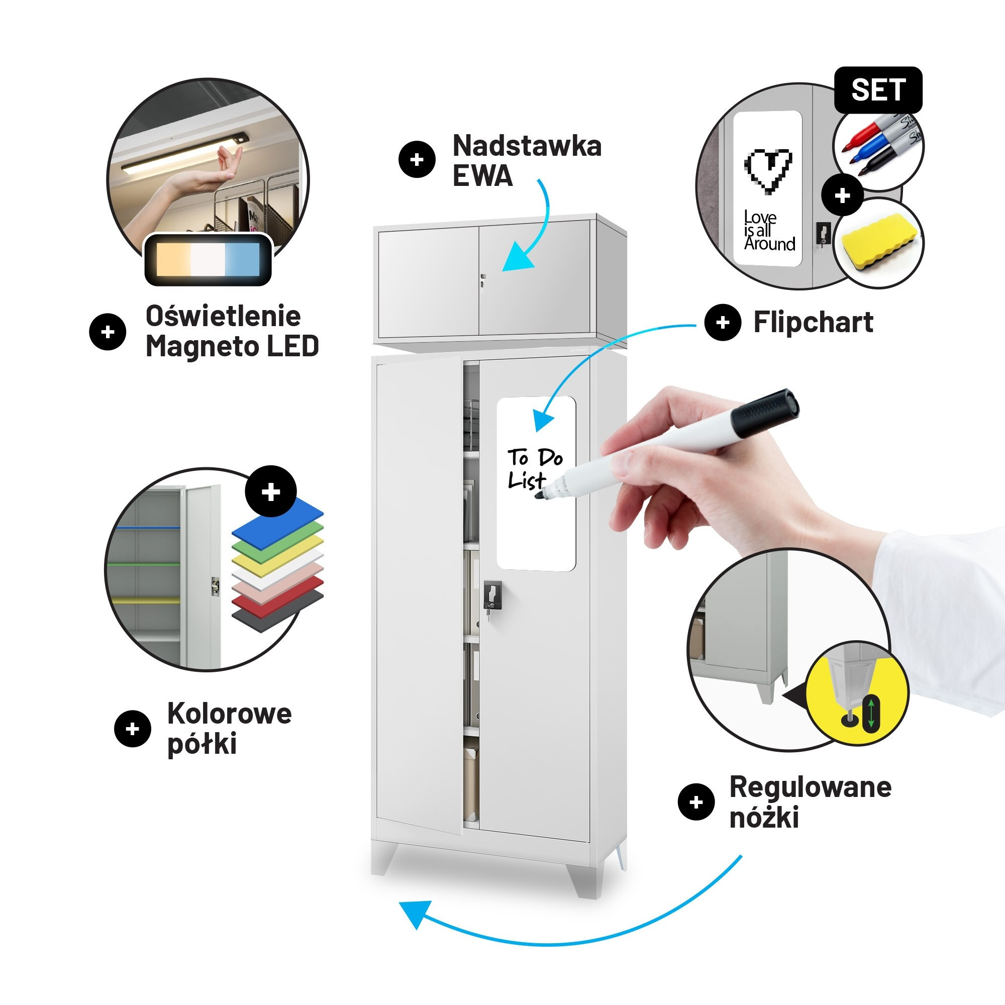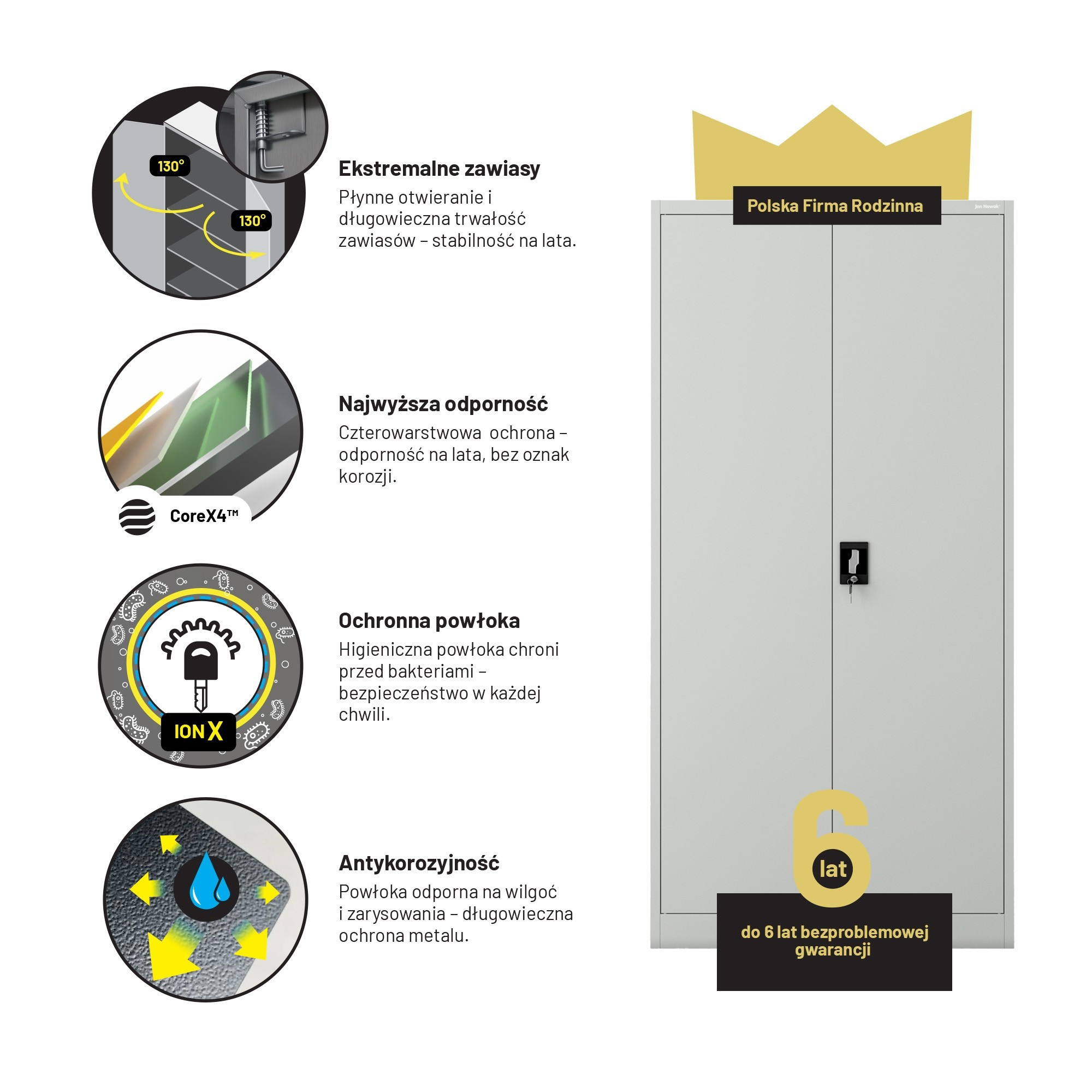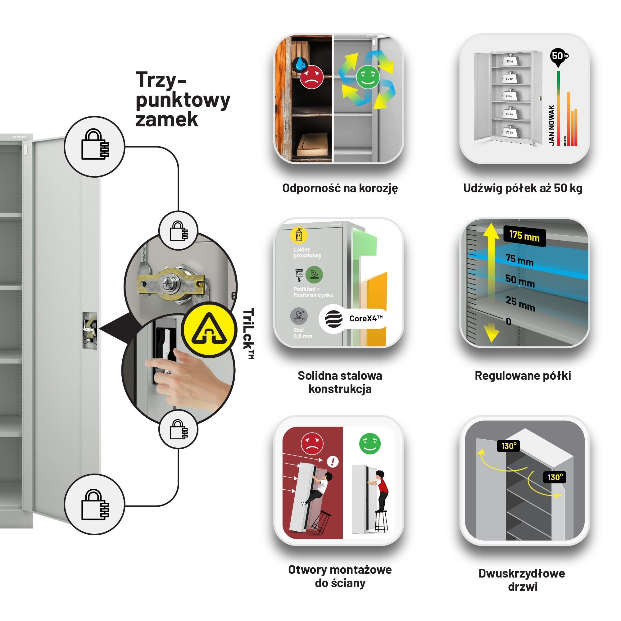 Kancelářská skříň JAN H – šedá Skříň model JAN H – šedá, kovová, na dokumenty, spisy, nástroje Skříň JAN H – kovová, uzamykatelná, univerzální Kancelářská skříň JAN H se osvědčí na sto procent, bez ohledu na to, co v ní chcete uchovávat. Může to být kancelářský nábytek nebo sloužící k vybavení profesionální dílny. A pokud hledáte něco do domácího interiéru s industriálním charakterem, pak se k tomu také skvěle hodí ocelová, šedá skříň. Skříň s různorodým využitím: na dokumenty na léky na nástroje Skříň na spisy JAN H – Hlavní vlastnosti produktu Skříň na spisy JAN H v šedé barvě představuje industrialismus a minimalismus, který se hodí do každého interiéru. Navíc spojuje funkčnost a odolnost. Byla propracována do každého detailu. Pojme až 50 šanonů! Bezpečné dvoukřídlé dveře, zámek zajištěný ve třech bodech, dva klíče v sadě. Navíc je naše kovová skříň vybavena otvory na zadní a boční stěně, které umožňují její připevnění ke zdi. Zvýší to bezpečnost každodenního používání. Otvor v horní části skříně umožňuje připevnit nástavec. Odolná silná ocel (0,6 mm), práškově lakovaná, odolná proti mechanickému poškození. Funkční 4 přestavitelné police s nastavením po 25 mm. Celková nosnost do 200 kg. Kovová skříň JAN H – rozměry výška 195 cm šířka 90 cm hloubka 40 cm hmotnost 44 kg barva šedá RAL 7035 Využijte: Záruka kvality - Pevné provedení a nejlepší materiály. To je hodnota, kterou je těžké najít jinde na trhu! Certifikát PZH – používejte certifikované produkty! GDPR 2018 – kancelářský nábytek přizpůsobený právním požadavkům. Podrobnosti o dodání samostatná montáž Kolekce Vyzkoušejte kvalitu, která stojí za jedním z největších dodavatelů kovových skříní v Evropě. Nákup u renomovaného prodejce je zárukou vyšší kvality produktů a služeb.