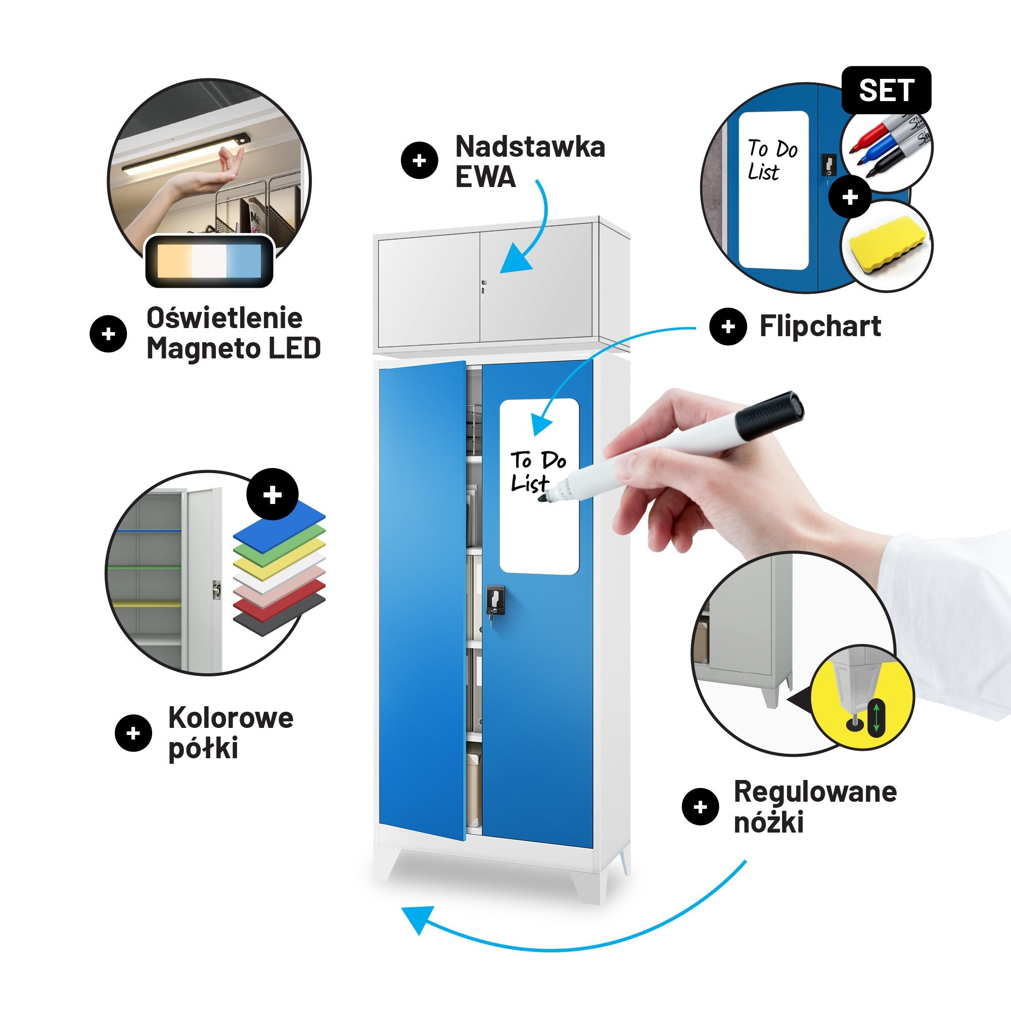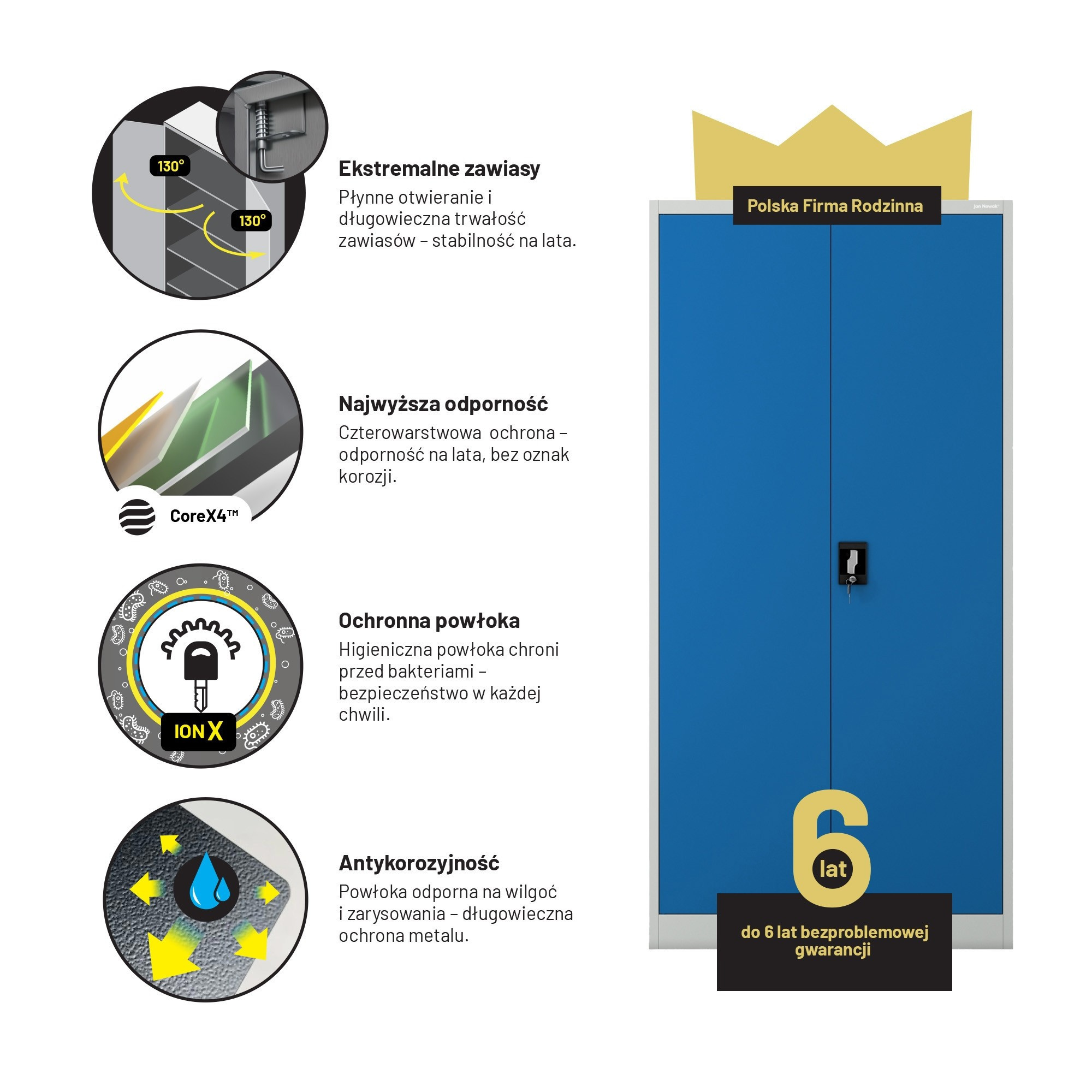 Skříň JAN H – šedo-modrá Skříň model JAN H – kovová, šedo-modrá, pro různé použití, na spisy, léky, nástroje Kovová skříň na dokumenty JAN H Kovová skříň na dokumenty JAN H je produkt navržený s ohledem na mnoho různých použití. Dokonale se osvědčuje jako uzamykatelný kancelářský nábytek, ale rády ho volí i zdravotnická zařízení. Uzamykatelnou, ocelovou skříň JAN H vyberte, pokud hledáte: kancelářskou skříň (firmy, úřady, školy, kanceláře) lékařskou skříň na léky (zdravotnická zařízení) skříň na nářadí (výrobní firmy, dílny) Pokud byste však chtěli skříň JAN H využít u sebe doma, není to žádný problém! Mezi našimi zákazníky je mnoho lidí, kteří obohatili své interiéry právě našimi ocelovými produkty, které se dokonale hodí k novým trendům v interiérové architektuře. Kovová skříň JAN – vlastnosti produktu Kovová skříň JAN v šedo-modré barvě – stylová a spolehlivá za všech podmínek. Navržena s ohledem na trvanlivost a funkčnost – uložíte do ní cokoliv, co si přejete, pohodlně a bezpečně. Naše kovová skříň byla vybavena otvory na zadní a boční stěně, které umožňují její připevnění ke stěně. Zvýší to bezpečnost každodenního používání. Otvor v horní části skříně umožňuje připevnit nástavec. kapacita až 50 šanonů dvoukřídlé dveře, zámek uzamykatelný ve 3 bodech (2 klíče v sadě) odolná ocel (tloušťka 0,6 mm), práškově lakovaná (odolná proti mechanickému poškození) 4 nastavitelné police (celková nosnost až 200 kg, nastavení po 25 mm) Skříň kovová JAN – parametry produktu výška 195 cm šířka 90 cm hloubka 40 cm hmotnost 44 kg barva šedo-modrá RAL 7035 – RAL 5017 Proč stojí za to? Záruka nejvyšší kvality - Pevné provedení a nejlepší materiály. To je hodnota, kterou je těžké najít jinde na trhu! Produkt certifikovaný - zvolte ocelovou skříň s certifikátem PZH. GDPR 2018 - vyberte produkt navržený v souladu s GDPR 2018. Ocelová skříň na dokumenty k vlastní montáži. Doručována po částech. Kolekce Kolekce kancelářského nábytku je známá nejen v Polsku, ale také v zahraničí. Vyberte si produkty jednoho z největších dodavatelů kovových skříní v Evropě.