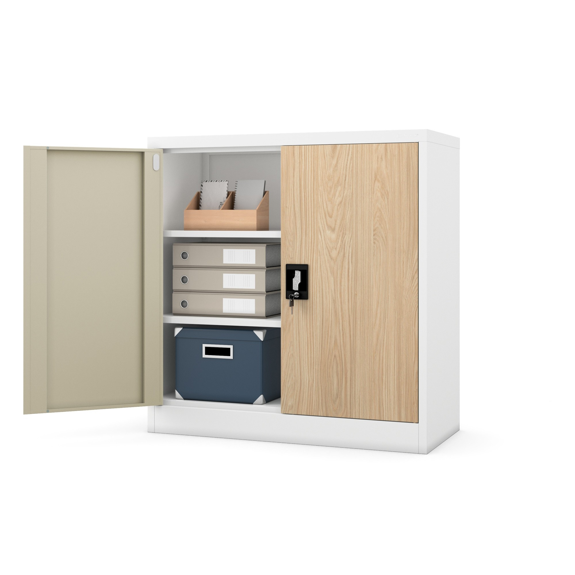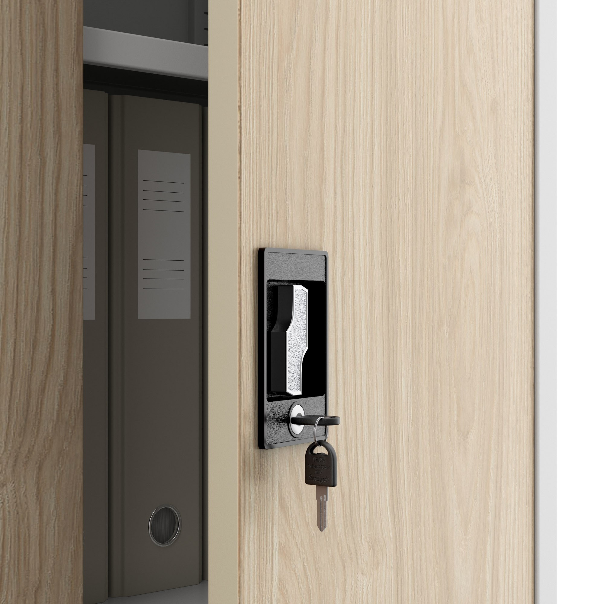 Kancelářská skříňka, loft BEATA, 900 x 930 x 400 mm, Eco Design, bílá/dub sonoma Kancelářská skříňka uzamykatelná na klíč BEATA je kompaktní model, který se vyznačuje kapacitou a originálním loftovým stylem. Osvědčí se jak v malých, tak i ve velkých místnostech. Dvoukřídlé dveře zajišťují snadný přístup k obsahu loftové skříňky a silný zámek poskytuje uloženým dokumentům bezpečnost - v souladu s platnými předpisy GDPR.Eco Design – kovová skříňka loft Když jsme vytvářeli kolekci Eco Design, inspirovali jsme se přírodou a péčí o životní prostředí. Ačkoli čela dvířek skříňky loft připomínají dřevěnou strukturu, nepřispěli jsme k pokácení žádného stromu. Kancelářské skříně loft BEATA jsou vyrobeny výhradně z kovu. Originální vzhled nábytku vděčí unikátní technologii a ekologické, odolné proti oděru barvě. Kolekce Eco Design umožňuje vytvořit elegantní prostor, a přitom stále zaručuje odolnost a bezpečnost, které poskytují kovové skříně Jan Nowak. Skříňka loft BEATA vybaví: kanceláře, úřady, školy, družstva, logistické firmy, dopravní společnosti, dílny, výrobní závody, účetní kanceláře, lékařské ordinace, kosmetické salony, domácí kancelář. Kancelářská skříňka - malá a velká Kancelářská skříňka BEATA je vyrobena z tlustého ocelového plechu, proto je pevná a odolná proti poškození. Její rozměry jsou kompaktní, avšak uvnitř pohodlně uložíte až 25 šanonů. Poličky nejsou namontovány napevno, kdykoli je můžete nastavit na jinou výšku (nastavení po 25 mm). Dává ti to maximální svobodu při vytváření vnitřního prostoru a plnou spokojenost s dobře uspořádanou loftovou skříňkou. Nábytek je bezpečný pro vás i vaše okolí - potvrzuje to certifikát PZH. Kancelářská skříňka v loftovém stylu - nejdůležitější údaje: Výška: 93 cm Šířka: 90 cm Hloubka: 40 cm Hmotnost: 24 kg Barva: korpus: bílá (RAL 9003) / dveře: dub sonoma Maximální zatížení: 200 kg Zatížení police do 50 kg Konstrukce: ocel s práškovým nástřikem Montáž kancelářské skříňky: Jednoduchá samostatná montáž Dostupný papírový návod a ve formátu videa Montáž za 10-30 minut