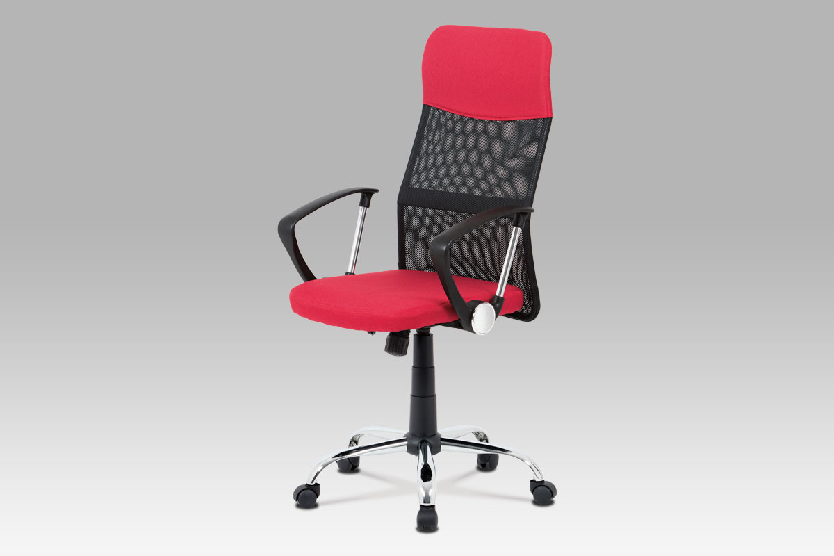 Stylová kancelářská židle červené barvy do moderní doby je díky kvalitnímu pístu výškově nastavitelná, s houpacím mechanismem, zesíleným kovovým křížem s chromovou úpravou a plastovými kolečky vhodnými na koberce. Pohodlný sedák je potažený příjemnou červenou látkou. Na naprostém pohodlí přidá i prodyšný opěrák potažený černou síťovinou a látkou červené barvy, a to především díky zesílené výztuži v bederní oblasti. Vrcholem komfortu jsou designově dokonalé pevné plastové područky černé barvy, které obsahují kovové vzpěry a další prvky s chromovou úpravou, což přidá na super moderním vzhledu židle. Díky houpacímu mechanismu dosáhne židle maximálního pohodlí pro svého uživatele. Tuhost houpaní lze regulovat velkým plastovým šroubem, který je umístěn pod sedákem. Nosnost židle je až 110 kg.