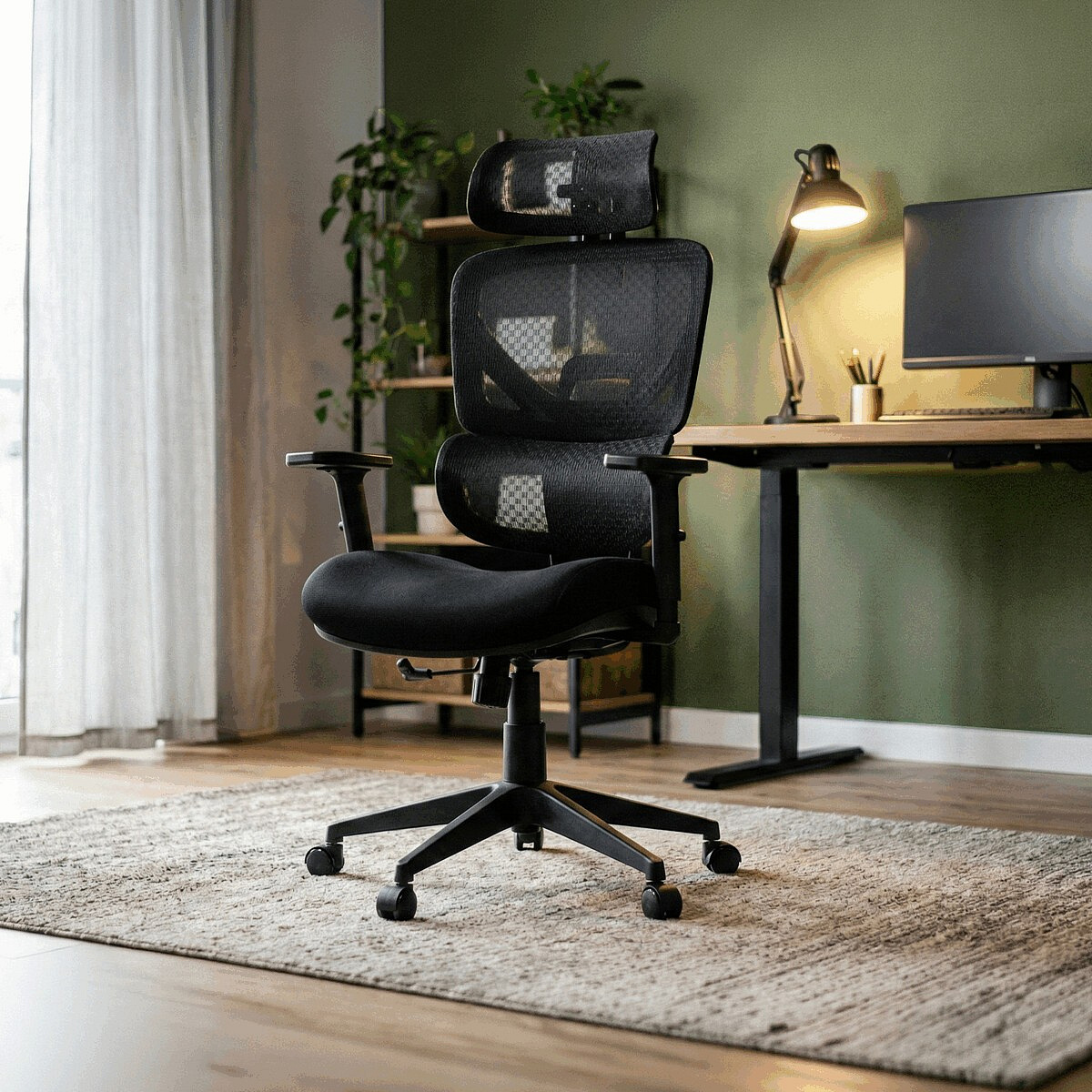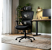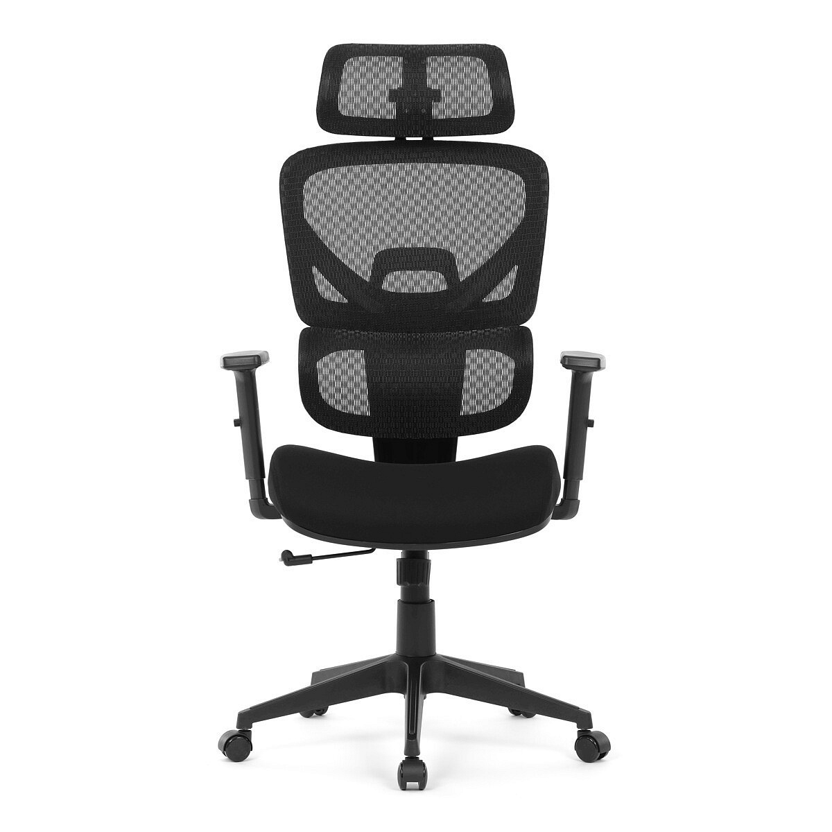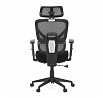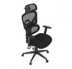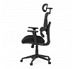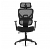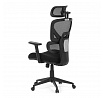 Kancelářská židle s černým mesh potahem nabízí vysoký komfort díky synchronnímu mechanismu, který umožňuje plynulé nastavení opěradla v závislosti na pohybu těla. Výškově nastavitelná bederní opěrka a opěrka hlavy podporují správné držení těla během dlouhých hodin sezení. Sedák je čalouněný látkou v jemném světle modrém odstínu s vyměkčenou vrchní částí pro lepší pohodlí. Područky jsou 1D typu s možností jednoduchého vertikálního nastavení, což umožňuje přizpůsobení individuálním potřebám uživatele. Stabilní plastový kříž s kolečky zajišťuje snadnou mobilitu a pevnost celé židle.