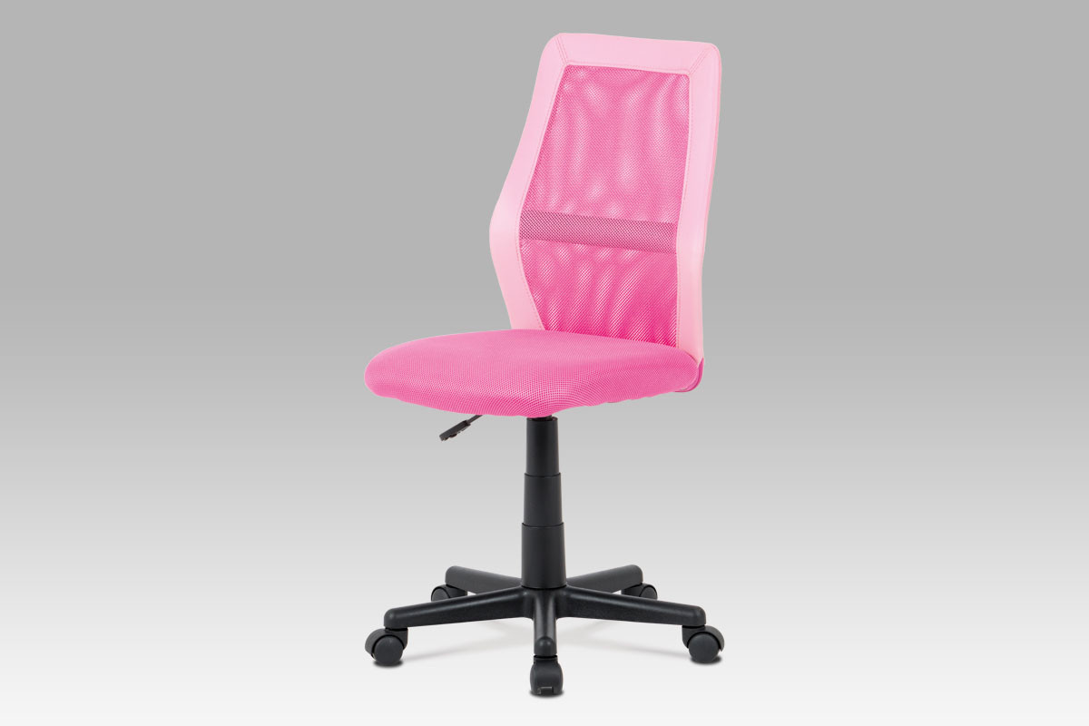 Stylová dětská kancelářská židle růžové barvy je výškově nastavitelná, se zesíleným plastovým křížem černé barvy a plastovými kolečky vhodnými na koberec. Sedák čalouněný látkou MESH růžové barvy je díky svému polstrování mimořádně pohodlný. Opěrák se zesílením v bederní oblasti je tvořen prodyšnou síťovinou MESH a lemem čalouněným ekokůží světle růžové barvy. Nosnost židle je až 80 kg.