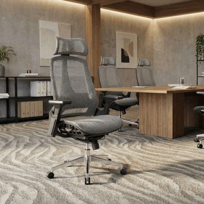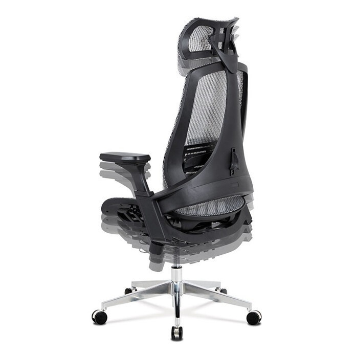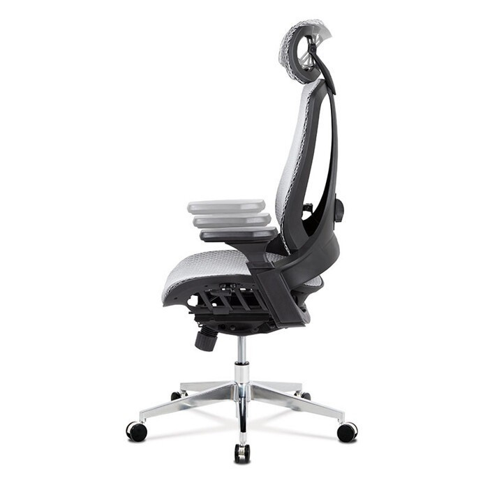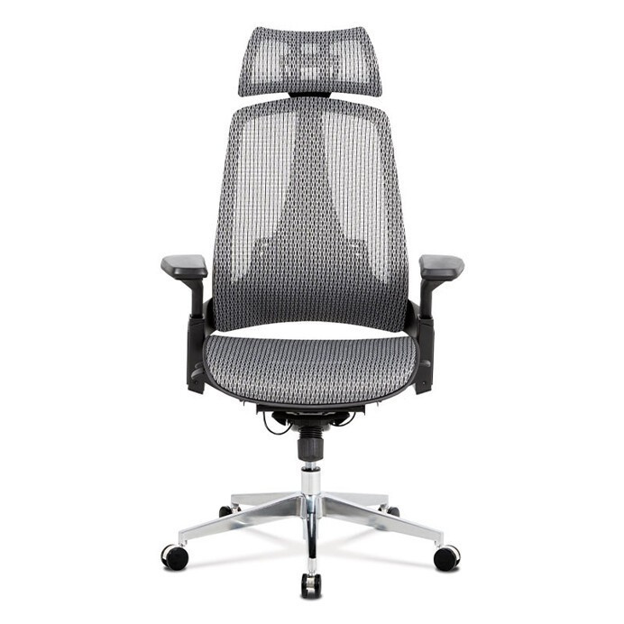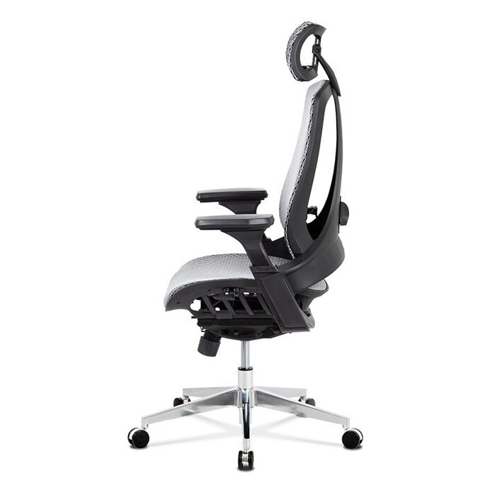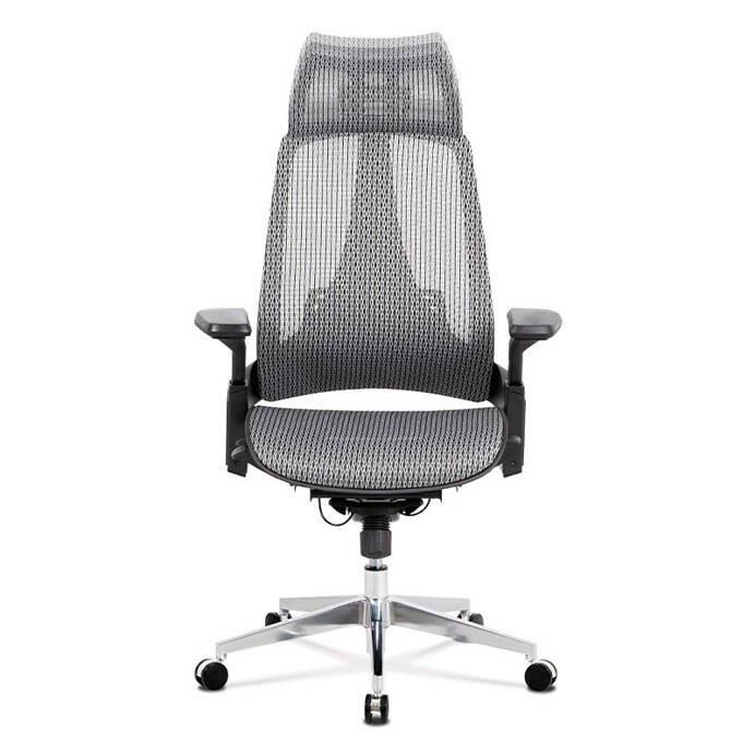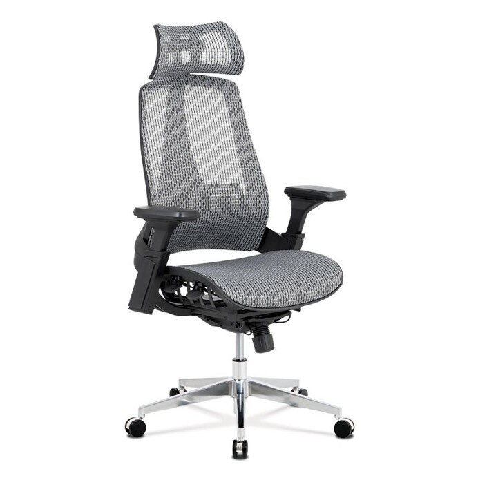 Kancelářská židle s šedou MESH síťovinou nabízí moderní a vzdušný design vhodný pro dlouhodobé sezení. Lankový synchronní mechanismus umožňuje plynulé nastavení opěráku i sedáku, včetně posuvu sedáku pro optimální ergonomii. Opěrák je vybaven výškově nastavitelnou bederní opěrkou a opěrkou hlavy, které podporují správné držení těla a snižují únavu během práce. Pevný kovový kříž zajišťuje stabilitu a odolnost, zatímco výškově nastavitelné područky přispívají k individuálnímu komfortu. Celkově je židle navržena pro dlouhou životnost a pohodlí v kancelářském prostředí.