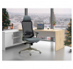 Kancelářská židle s vysokým opěrákem, čalouněným v prodyšném materiálu MESH, s nastavitelnou bederní opěrkou. Sedák je vyměkčený, s potahem v šedé látce. Pro větší pohodlí je židle opatřena synchronní mechanikou s polohovací aretací, podhlavníkem a 4D područkami z vrchní části z PU pěny. Kříž z odolného plastu je opatřen kolečky na tvrdé povrchy.