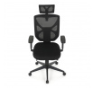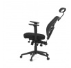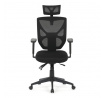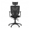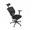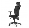 Kancelářská židle s černým prodyšným opěrákem a látkovým měkčeným sedákem nabízí vysoký komfort. Díky ergonomicky tvarovanému opěradlu a integrované opěrce hlavy, podporuje správné držení krční páteře. Sedák je vybaven posuvnou a balanční funkcí pro individuální nastavení hloubky a sklonu sezení, což zvyšuje pohodlí při dlouhodobé práci. Asynchronní mechanismus umožňuje plynulé naklápění opěradla s možností aretace v několika polohách, čímž přispívá k ergonomii a podpoře správného držení těla. 3D područky lze nastavit ve třech směrech – výškově, do stran i dopředu – pro maximální přizpůsobení uživateli. Plastový kříž zajišťuje stabilitu a lehkost celé židle, která je vhodná pro kancelářské prostředí i domácí pracovny.