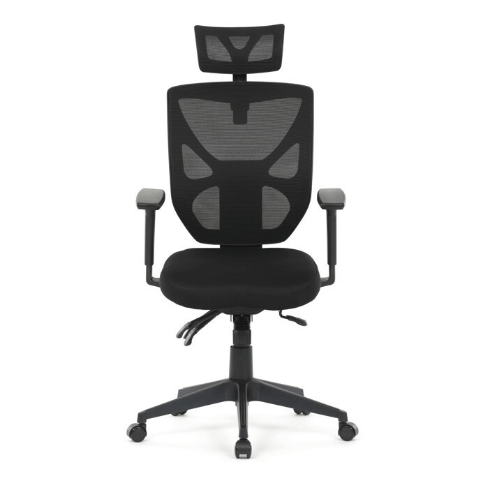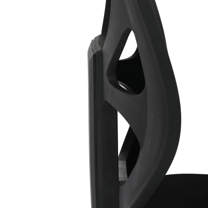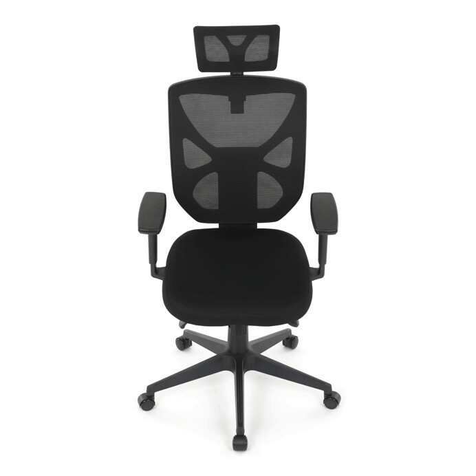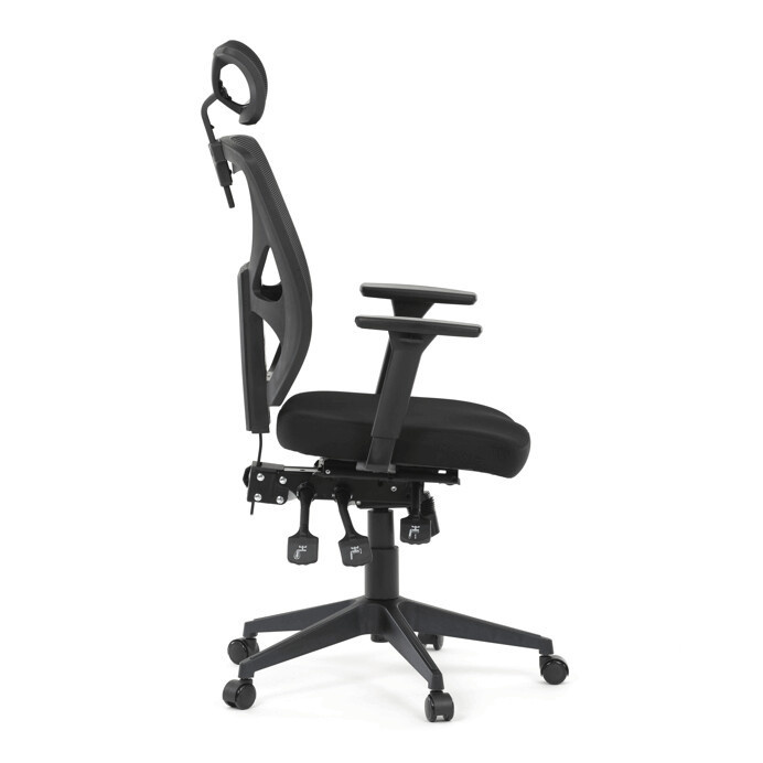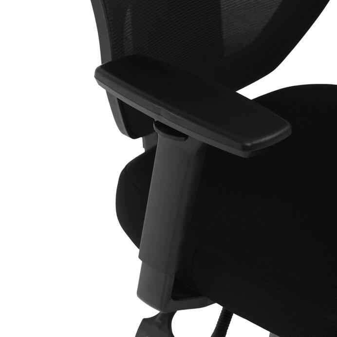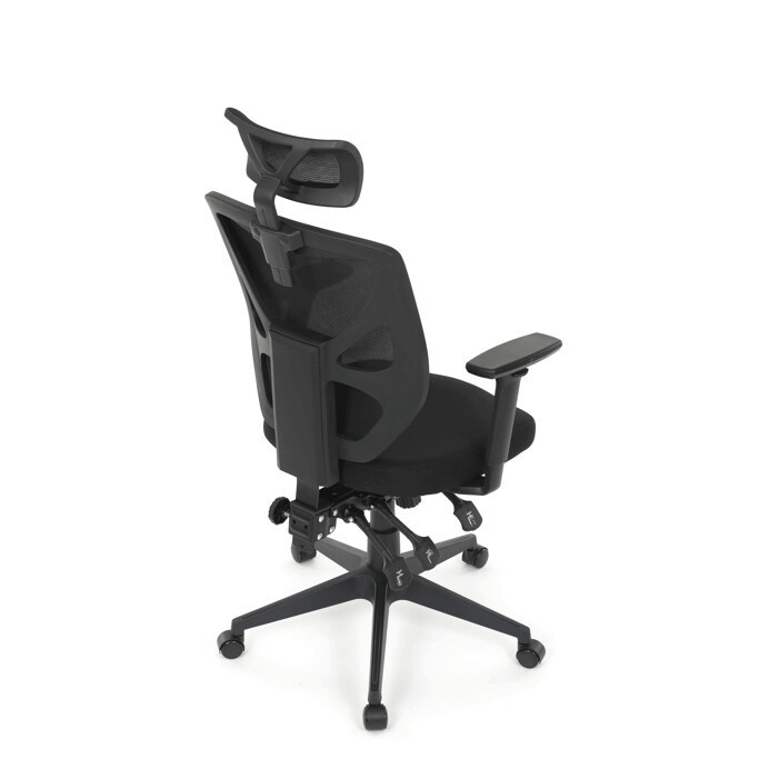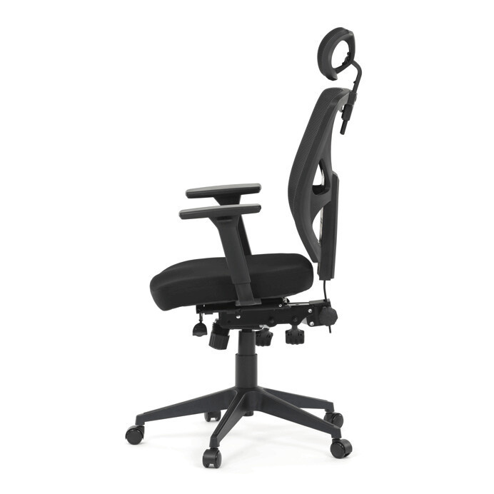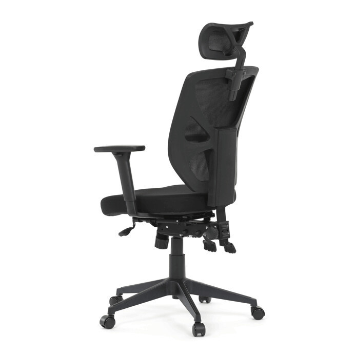 Kancelářská židle s černým prodyšným opěrákem a látkovým měkčeným sedákem nabízí vysoký komfort. Díky ergonomicky tvarovanému opěradlu a integrované opěrce hlavy, podporuje správné držení krční páteře. Sedák je vybaven posuvnou a balanční funkcí pro individuální nastavení hloubky a sklonu sezení, což zvyšuje pohodlí při dlouhodobé práci. Asynchronní mechanismus umožňuje plynulé naklápění opěradla s možností aretace v několika polohách, čímž přispívá k ergonomii a podpoře správného držení těla. 3D područky lze nastavit ve třech směrech – výškově, do stran i dopředu – pro maximální přizpůsobení uživateli. Plastový kříž zajišťuje stabilitu a lehkost celé židle, která je vhodná pro kancelářské prostředí i domácí pracovny.