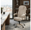 Kancelářské křeslo v béžovém provedení kombinuje komfort s praktickým designem vhodným pro dlouhodobé sezení. Čalounění z kvalitní látky zajišťuje příjemný povrch a snadnou údržbu, zatímco pevné područky s měkkým polstrováním podporují pohodlí paží. Vysoký opěrák je doplněn pevnou opěrkou hlavy s vyměkčenou vrchní částí, která přispívá k lepší podpoře krční páteře. Houpací mechanismus umožňuje nastavení polohy sedáku a výšková nastavitelnost zajišťuje ergonomické přizpůsobení uživateli. Stabilní základna z plastu v odstínu champagne je vybavena kolečky vhodnými pro tvrdé povrchy, což usnadňuje mobilitu a zároveň chrání podlahu.
