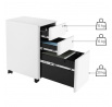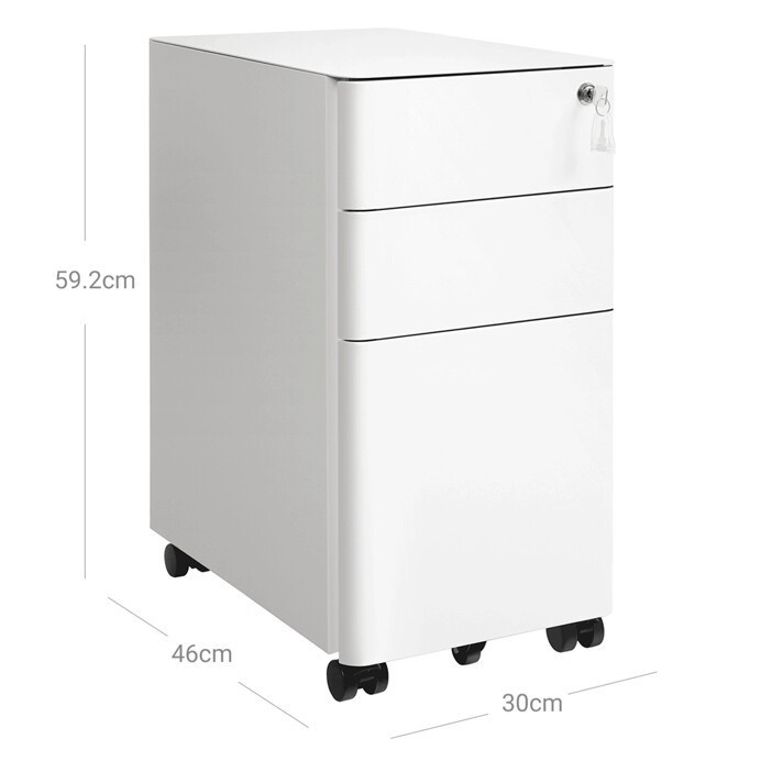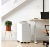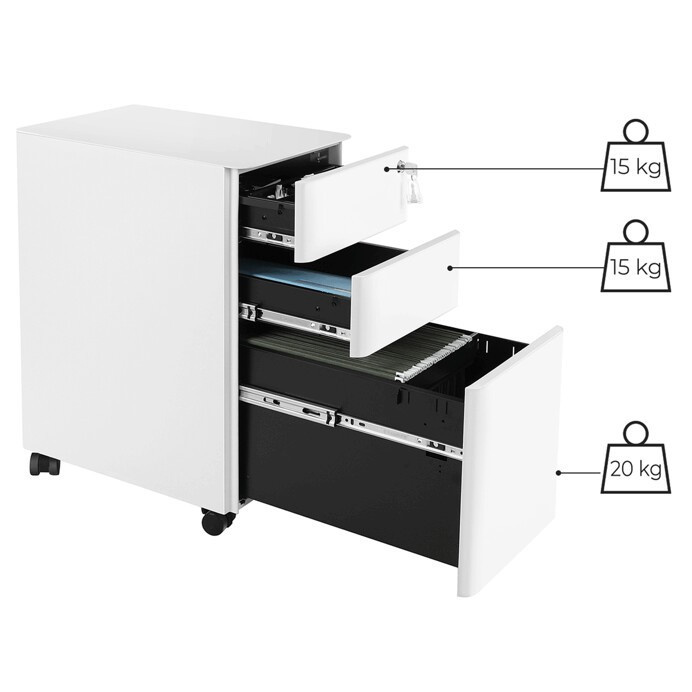 Pojízdné zásuvky v bílém provedení jsou vyrobeny z pevného kovu, který zajišťuje stabilitu a dlouhou životnost. Kompaktní komoda nabízí tři zásuvky s hladkým výsuvem, přičemž horní zásuvka je vybavena zámkem pro bezpečné uložení důležitých dokumentů či osobních věcí. Díky přídavným kolečkům je možné zásuvky snadno přesouvat podle potřeby, což přispívá k flexibilitě pracovního prostoru. Povrchová úprava v bílé barvě ladí s moderním kancelářským interiérem a usnadňuje údržbu. Rozměry a praktické uspořádání úložného prostoru umožňují efektivní organizaci kancelářských potřeb.