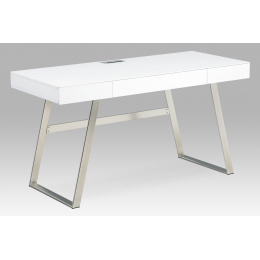 Moderní kancelářský stůl, který skloubí moderní design a precizní provedení. Jednoduchost, funkčnost a elegance. Deska stolu je z MDF lakovaná matnou bílou barvou. Tloušťka vrchní desky je 1,5 cm, ale celkový výška pracovní desky je 10 cm. Součástí pracovní desky jsou tři výsuvné šuplíky, které svým designem zbytečně nevyčnívají, nepřekáží a nenabourávají tak skvělý vzhled stolu. Dva užší šuplíky mají vnitřní rozměr 27,5x33,5 cm s výškou 5 cm a delší prostřední šuplík má vnitřní rozměr 63x33,5 cm s výškou 5 cm. Nedílnou součástí pracovní desky je i otvor na vedení kabeláže k monitoru, PC, notebook atd. Podnož je tvořena z broušeného niklu a je ztělesněním dokonalé symbiózy moderního designu a skvělého zpracování.