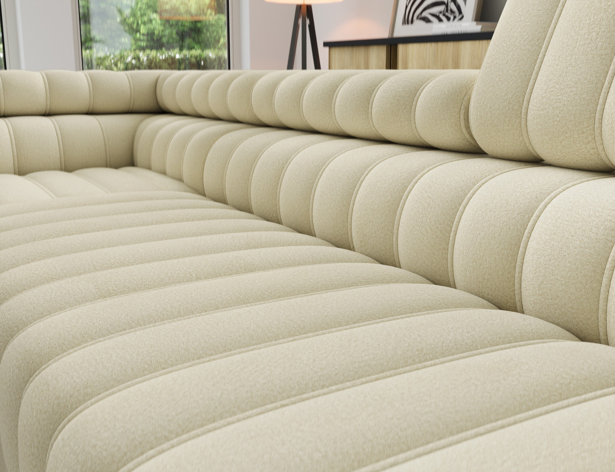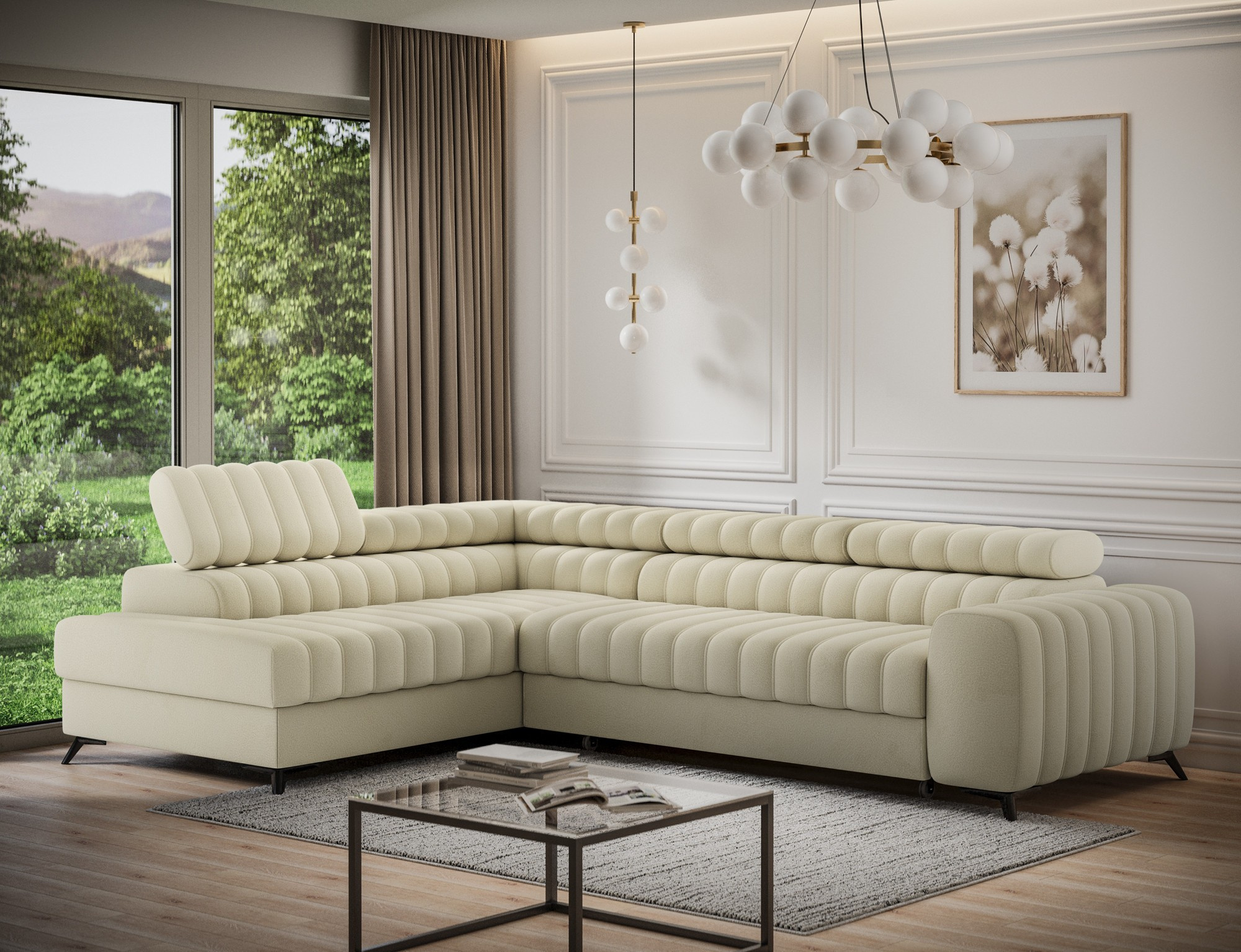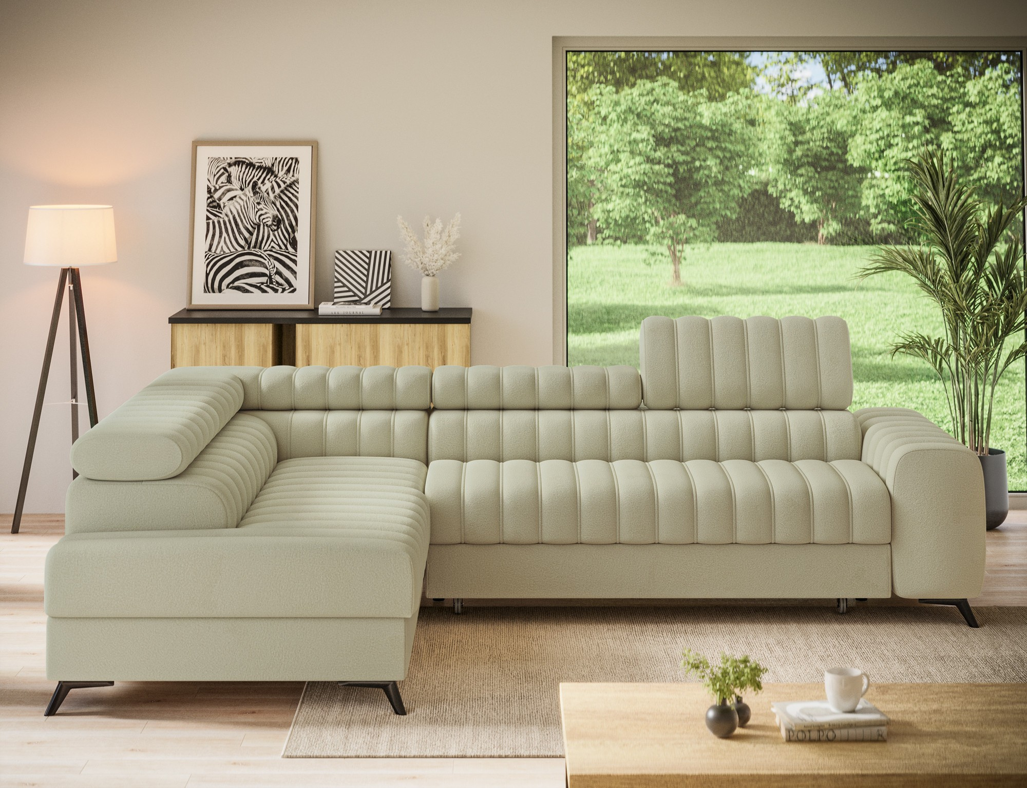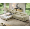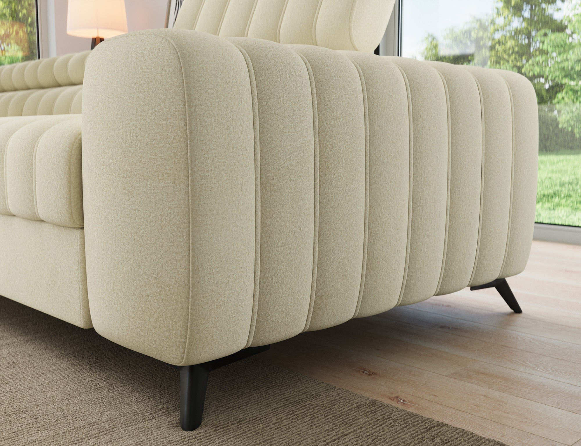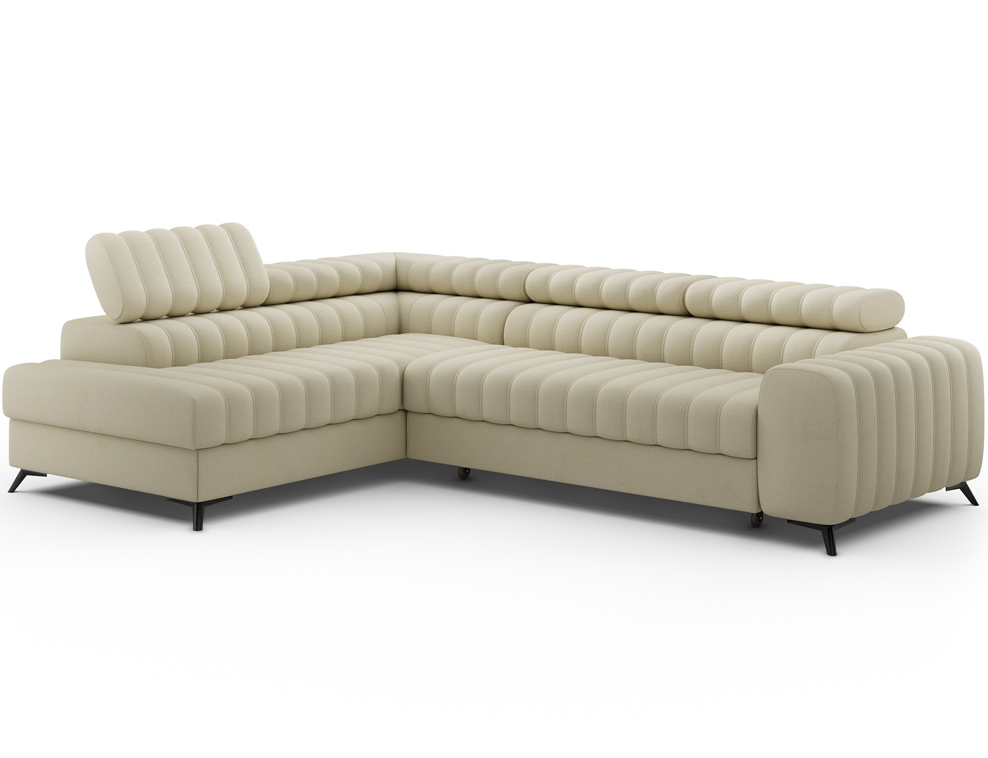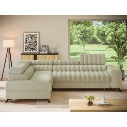 The Kanedo corner sofa is a designer and highly functional upholstered piece that combines modern aesthetics with exceptional comfort, making it an ideal choice for a spacious living room or relaxation area. With overall dimensions of 269 × 204 × 86 cm and a weight of 146.2 kg, this model stands out for its solid construction and carefully profiled elements that provide ergonomic body support and outstanding relaxation. The seat is equipped with Type B wave springs and a combination of T3030 foam and profiled HR3030 high-resilience foam, ensuring optimal elasticity, durability, and long-lasting seating comfort even with intensive use. The backrest, filled with T2130 polyurethane foam, offers stable support and enhances everyday comfort. The Kanedo corner sofa features a practical sleeping function with a surface of 194 × 124 cm, while the Dolphin mechanism allows for quick and effortless unfolding. An additional advantage is the spacious bedding storage compartment measuring 180 × 92 × 17 cm, providing convenient storage for textiles and making the Kanedo corner sofa an excellent choice for those looking for a modern corner sofa with a sleeping function, storage space, and durable, high-quality filling.