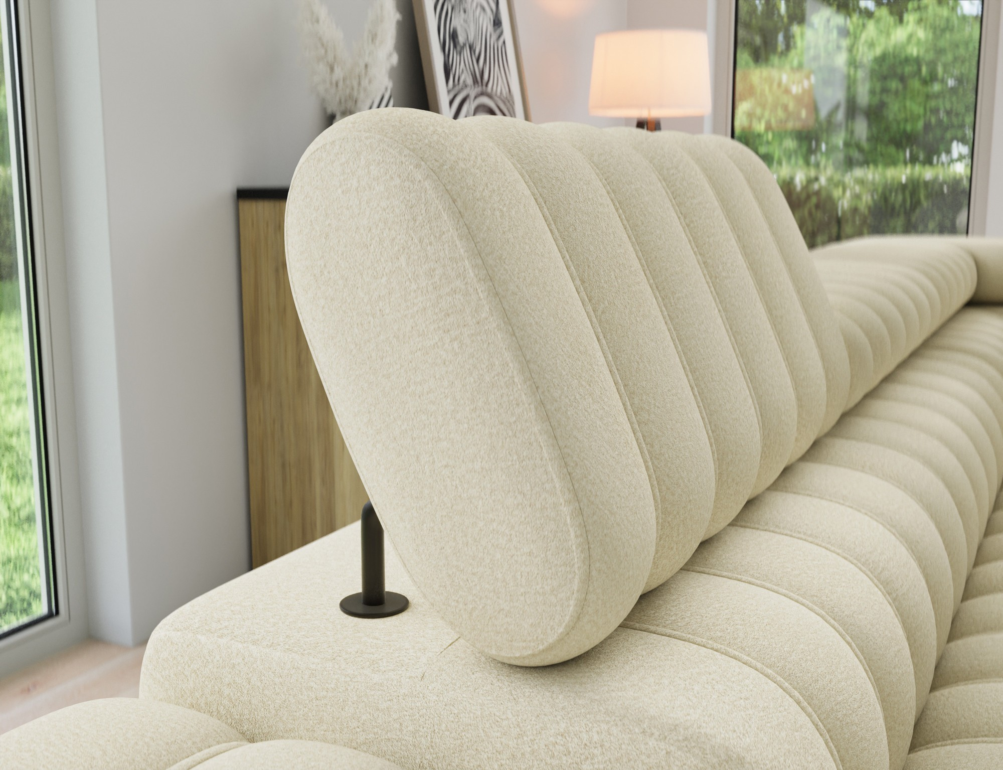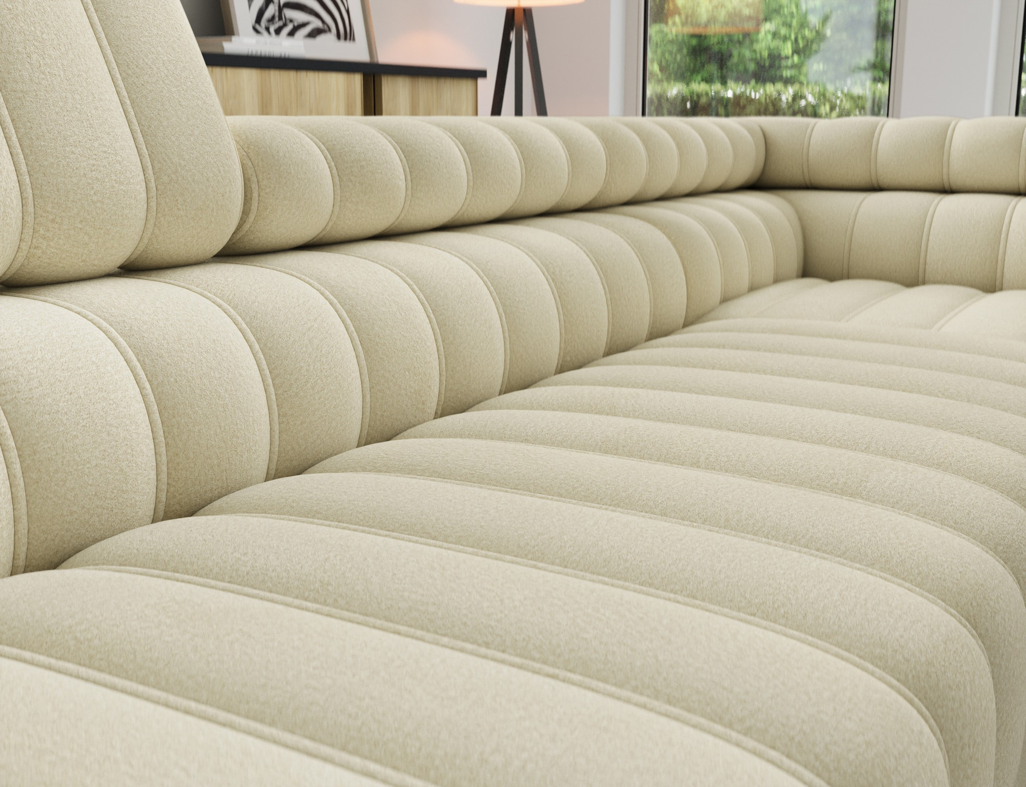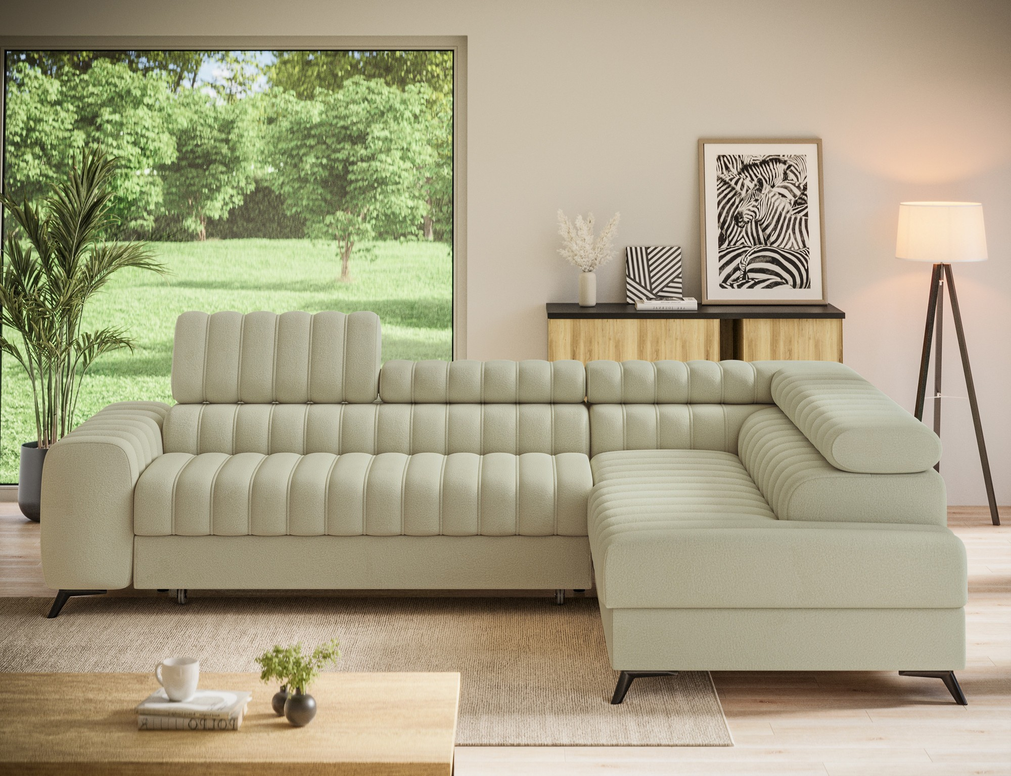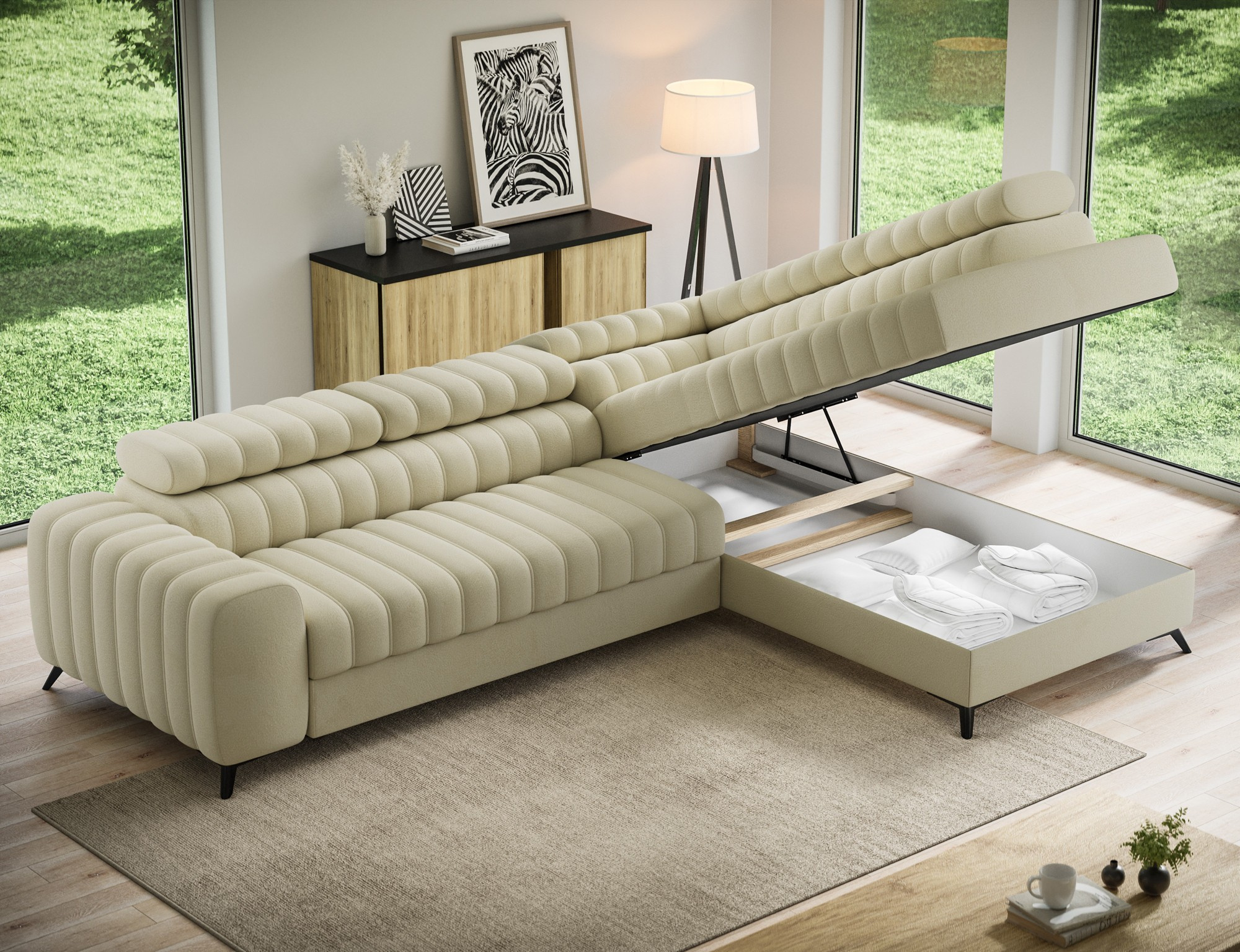 The Kanedo corner sofa is a designer and highly functional upholstered piece that combines modern aesthetics with exceptional comfort, making it an ideal choice for a spacious living room or relaxation area. With overall dimensions of 269 × 204 × 86 cm and a weight of 146.2 kg, this model stands out for its solid construction and carefully profiled elements that provide ergonomic body support and outstanding relaxation. The seat is equipped with Type B wave springs and a combination of T3030 foam and profiled HR3030 high-resilience foam, ensuring optimal elasticity, durability, and long-lasting seating comfort even with intensive use. The backrest, filled with T2130 polyurethane foam, offers stable support and enhances everyday comfort. The Kanedo corner sofa features a practical sleeping function with a surface of 194 × 124 cm, while the Dolphin mechanism allows for quick and effortless unfolding. An additional advantage is the spacious bedding storage compartment measuring 180 × 92 × 17 cm, providing convenient storage for textiles and making the Kanedo corner sofa an excellent choice for those looking for a modern corner sofa with a sleeping function, storage space, and durable, high-quality filling.
