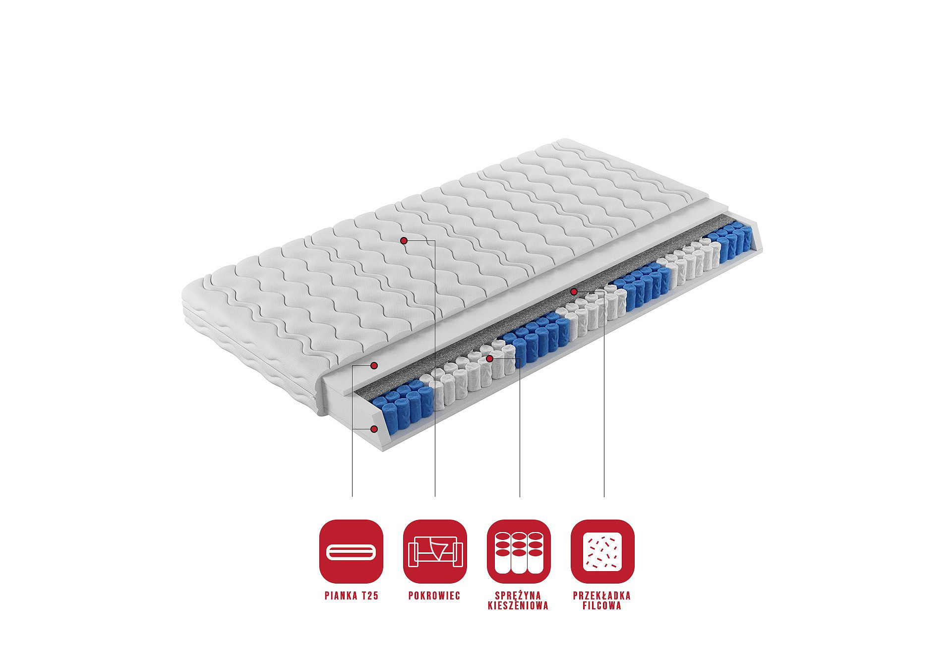 Matrace s kapsami MONTI se vyznačuje vysokou pružností a bodovou podporou těla během spánku, což způsobuje, že tato matrace odlehčuje páteř a zajišťuje lepší odpočinek. Výplň matrace byla vyrobena z vysoce kvalitní polyuretanové pěny T25 s tvrdostí H3 - středně tvrdá. Antialergický, prošívaný potah nepřitahuje prach, roztoče ani jiné alergeny, což z něj činí oblíbenou volbu pro osoby se sklonem k alergiím a podráždění pokožky. Navíc jej lze prát v pračce na 40 stupňů Celsia, což ještě více usnadňuje udržování správné hygieny spánku. Povlak má zip, díky čemuž ho lze snadno sundat a nasadit.