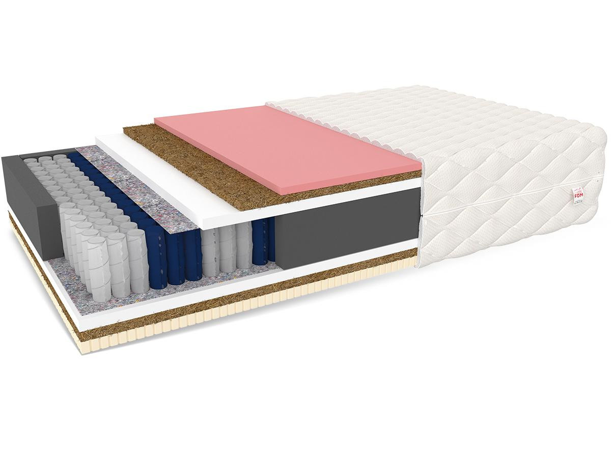 Model NARNI MAX patří do skupiny taštičkových matrací. Kapesní pružiny jsou vyrobeny technologií NanoHARD, jejíž drát tvrzený pod vodou výrazně prodlužuje jejich životnost. Díky použití 7 zón s různou tvrdostí poskytuje matrace ergonomickou polohu těla při odpočinku. Nezávislá práce pružin eliminuje vliv ohýbání velké plochy matrace při tlaku na její malou plochu. Tímto způsobem druhá osoba nepocítí žádné otáčení nebo vrtání. Vložka kapsy je obklopena polyuretanovou pěnou T25, která je odolná proti deformaci. Na obou stranách je použita kokosová vrstva, která zajišťuje zvýšenou tuhost povrchu. Na jedné straně je použita termoplastická pěna VISCO, která se vlivem teploty přizpůsobuje tvaru těla. Poskytuje páteři přirozenou polohu a oporu. Na druhé straně je použita latexová vložka, která se vyznačuje vysokou elasticitou a vynikající propustností vzduchu. Trvale se nedeformuje a zachovává si svůj původní tvar. Specifikace: tvrdost: H4 hard, tloušťka: 29 cm. Složení: kokosová vložka: 1 cm, perforovaný latex: 2 cm, polyuretanová pěna T25: 2 cm, potah: 1 cm, výška pružiny: 18 cm, termoplastická pěna VISCO: 2 cm, polyuretanová pěna T25: 2 cm, kokosová vložka: 1 cm.