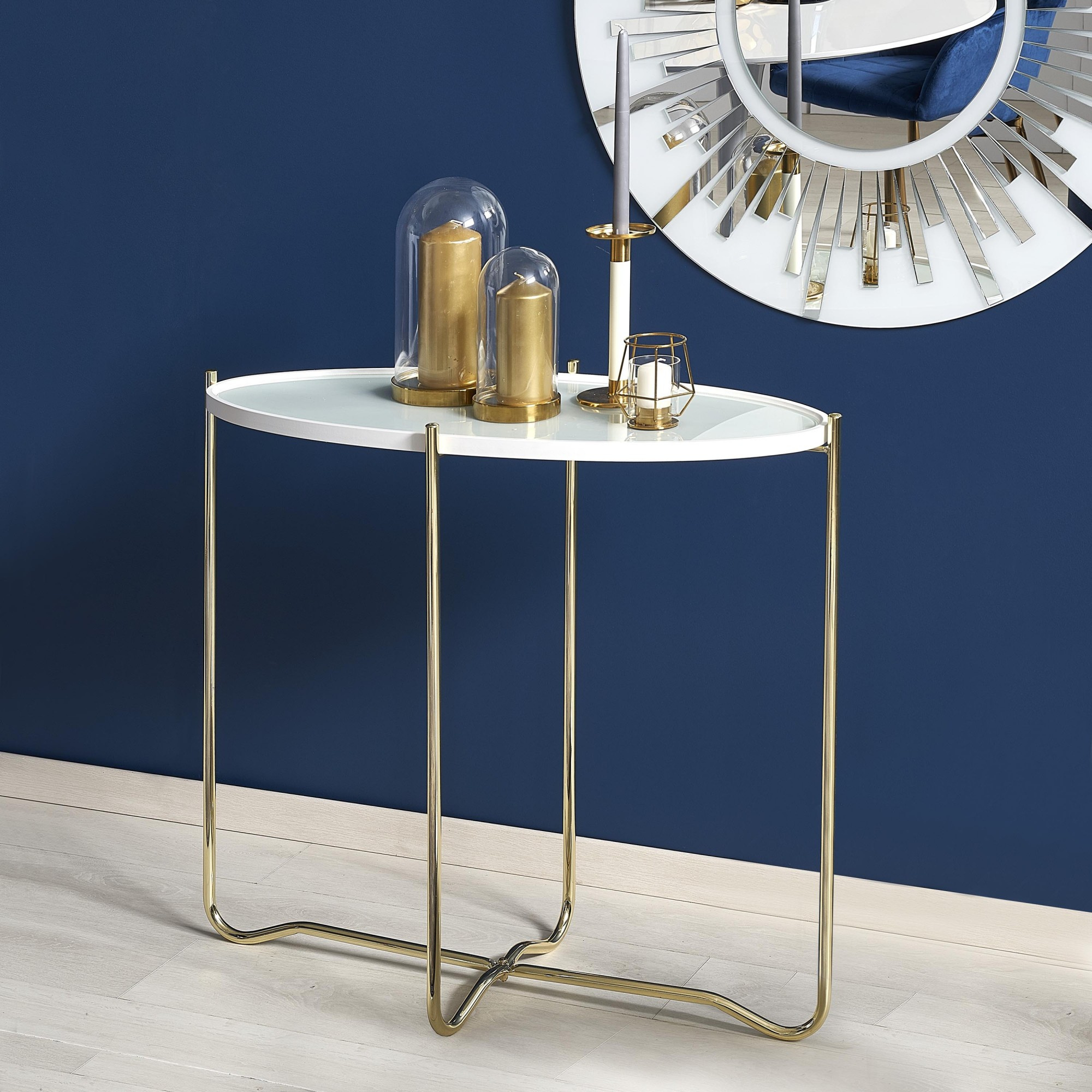 Rozměry: 83/38/74 cm, Materiál: sklo / lakovaná MDF / chromovaná ocel, Barva: bílá - zlatá