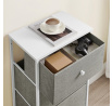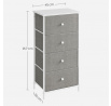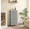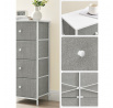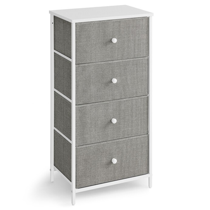 Komoda o rozměrech 45x30x92 cm kombinuje pevnou MDF desku s matnou povrchovou úpravou v bílé barvě a stabilní kovovou konstrukci nohou. Čtyři prostorné zásuvky z netkané textilie v šedém odstínu poskytují praktický úložný prostor pro různé drobnosti a zároveň usnadňují organizaci. Jednoduchý design s decentními bílými úchytkami ladí s moderním i skandinávským stylem interiéru. Komoda je navržena tak, aby byla lehká a zároveň dostatečně pevná pro každodenní použití. Díky kompaktním rozměrům se hodí do menších prostor, kde je potřeba efektivně využít místo.