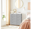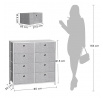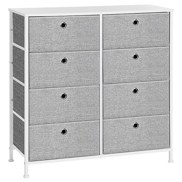 Komoda o rozměrech 80x30x82 cm kombinuje pevnou kovovou konstrukci s deskou z MDF v matném bílém provedení, která zajišťuje stabilitu a snadnou údržbu. Osm látkových zásuvek v šedé barvě nabízí praktický úložný prostor pro různé drobnosti a textilní materiál zásuvek přispívá k lehkému a vzdušnému vzhledu. Kovové nohy jsou vybaveny plastovými krytkami, které chrání podlahu před poškozením. Komoda je vhodná do moderních i minimalistických interiérů, kde oceníte kombinaci funkčnosti a jednoduchého designu.