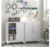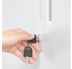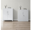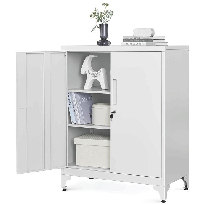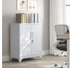 Úložná skříňka o rozměrech 80x40x100 cm je vyrobena z pevného kovu s práškovou povrchovou úpravou v bílé barvě, která zajišťuje odolnost proti poškození a snadnou údržbu. Skříňka nabízí tři vnitřní police, které poskytují dostatek prostoru pro organizaci různých předmětů, a je vybavena dvěma dveřmi s vestavěnými úchytkami pro pohodlné otevírání. Kovové nožky s nastavitelnými patkami zaručují stabilitu i na nerovném povrchu. Praktický zámek na pravých dveřích umožňuje bezpečné uzamčení obsahu. Díky svému jednoduchému designu a neutrální bílé barvě se skříňka hodí do kanceláří i domácích prostor.