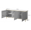 komoda Rozměry: š/s/g- 75,5/180/40 Horní deska: matná 16 mm laminovaná dřevotříska, zlatá kartáčovaná hrana Čelo a boky: 16 mm matná MDF s viditelným frézováním Úchyt: kov ve zlaté barvě Nohy: kov ve zlaté barvě