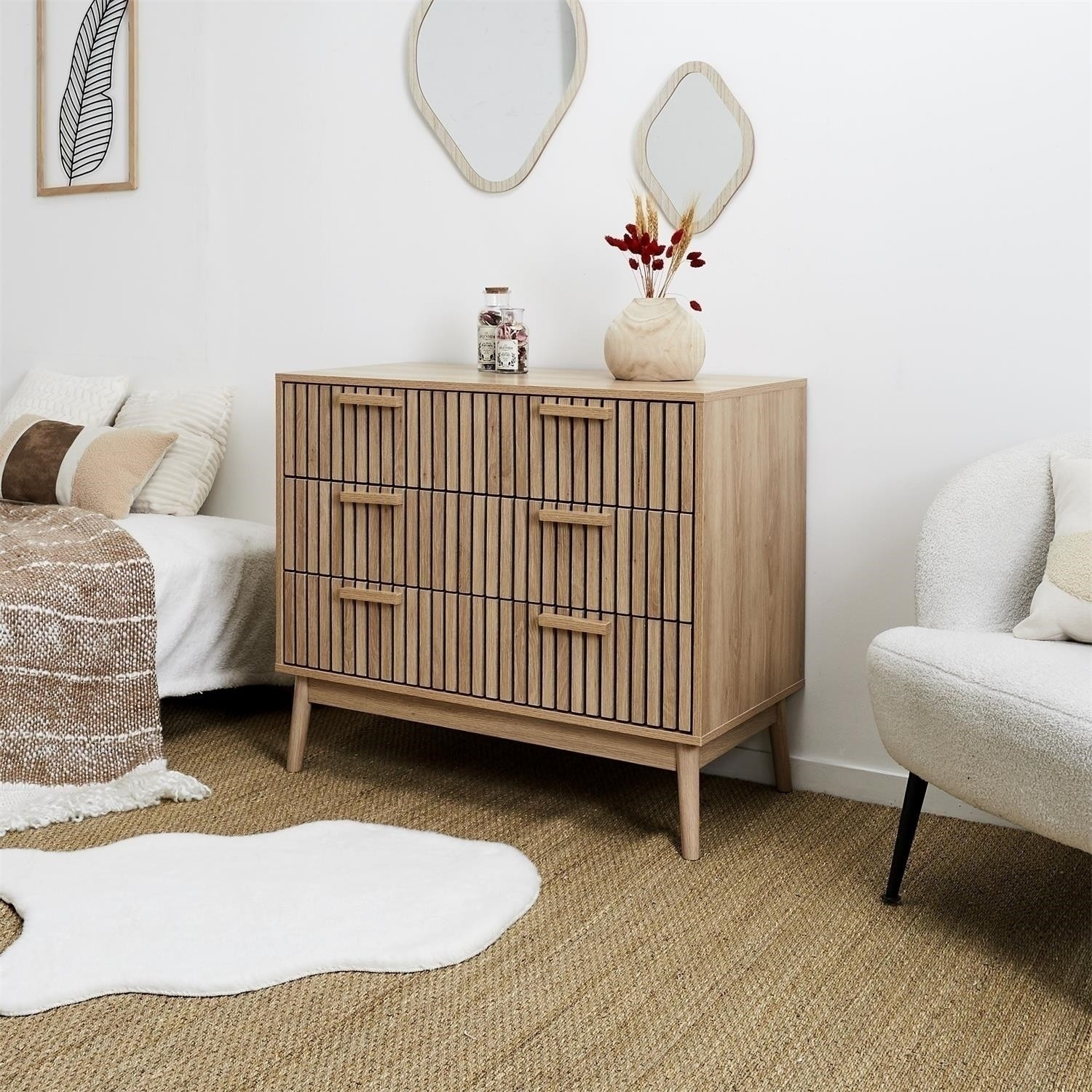 Komoda Klaus je kombinací módní barvy dýhy imitující přírodní barvu borovicového dřeva a módních a klasických lamel. Korpus a čela komody byly vyrobeny z MDF desky, zatímco nohy komody z borovicového dřeva. Komoda je vybavena třemi zásuvkami, které se vysouvají na kovových lištách. Komoda vyžaduje montáž Rozměry kartonu: 96x19x53cm Hmotnost: 39kg.