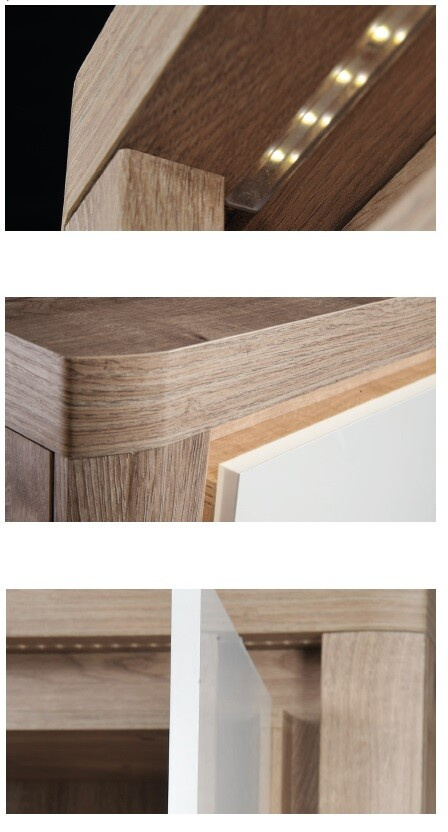 Největší komoda z kolekce LIVINIO. Je velmi široká, až 184cm! Ve střední části nalezneme tři velmi velké zásuvky, posuvné na tichých pojezdech. Stejný systém je použit i ve dveřích šatní skříně. Nábytek je velmi stabilní a prostorný. Použitá kombinace barev předních ploch a korpusu skvěle zapadne do každého interiéru. K osvětlení horní části a boků komody můžeme využít podsvícení, které je v sestavě k dispozici.