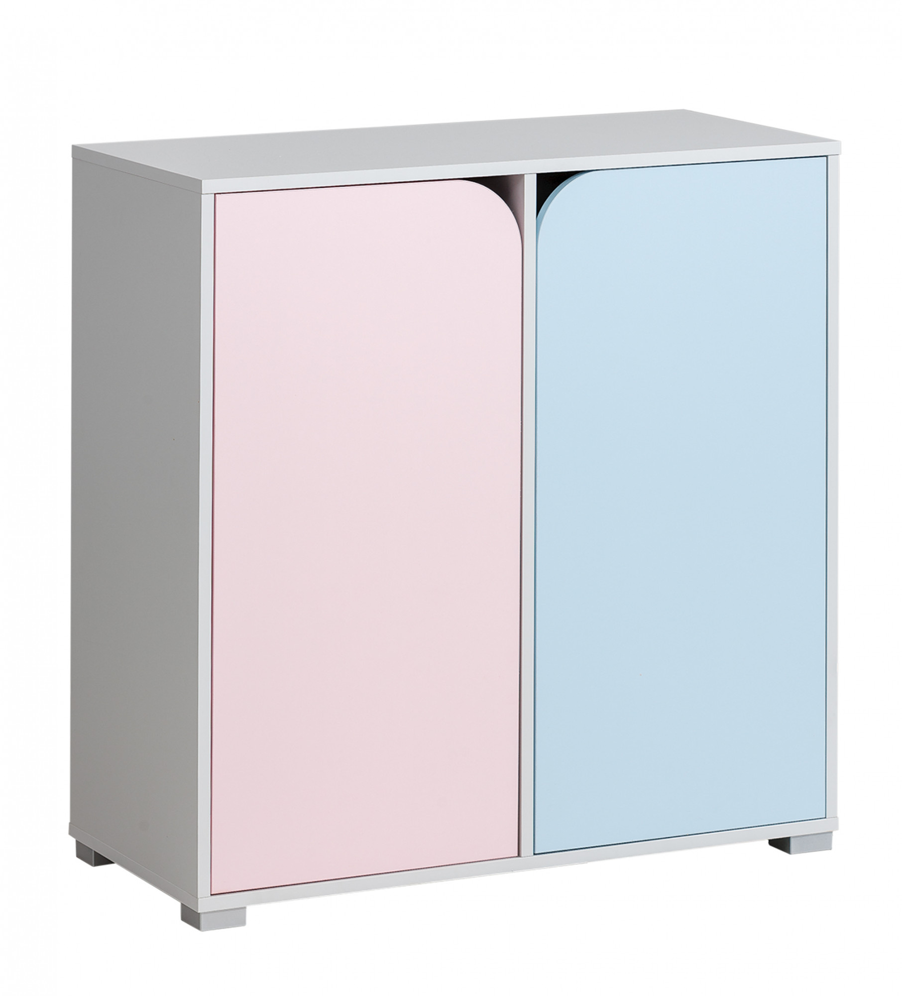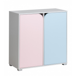 Komoda ze systému Mimo se vyrábí v barevném provedení světlešedé v kombinaci s bledě modrou a růžovou.