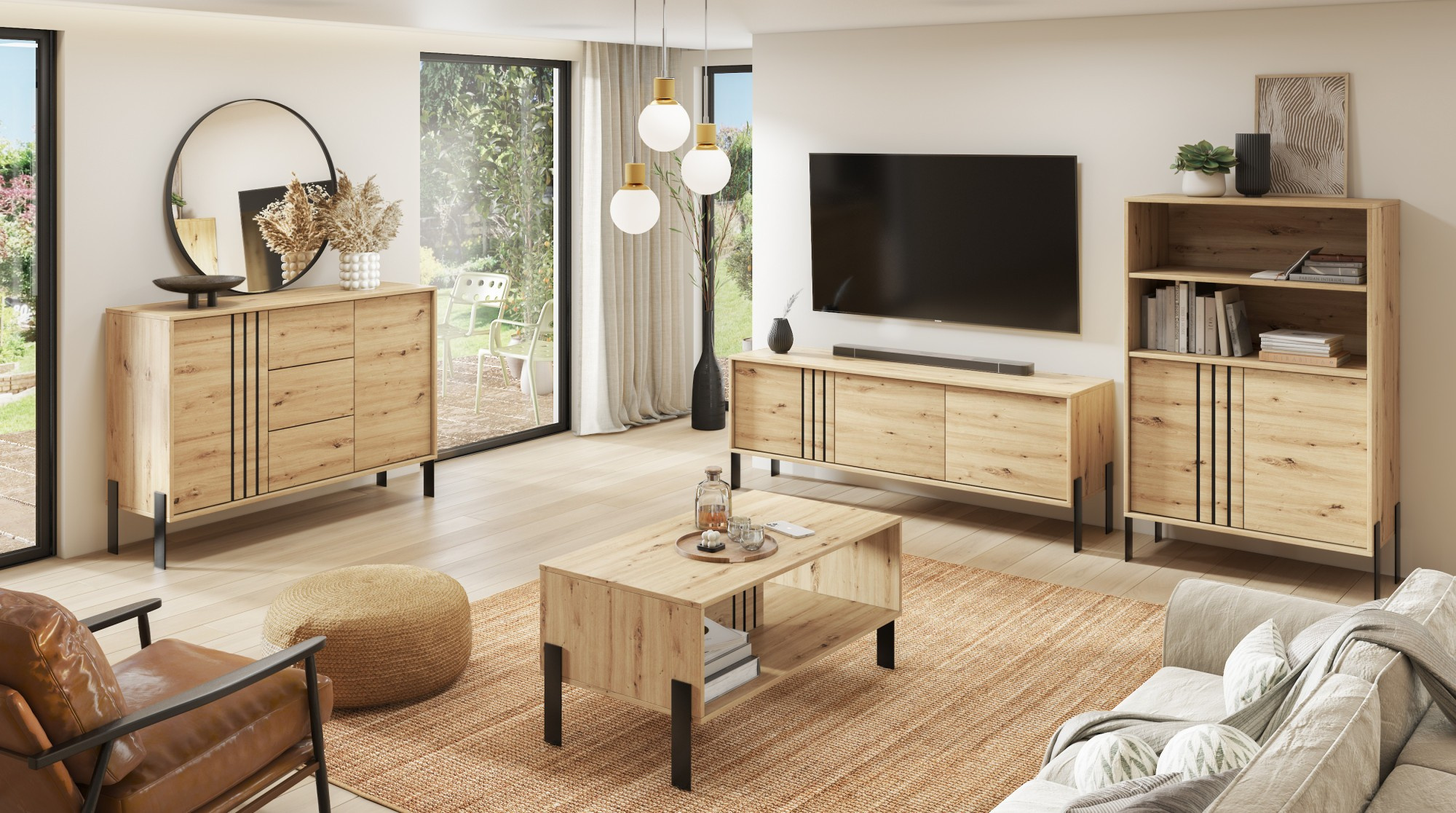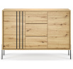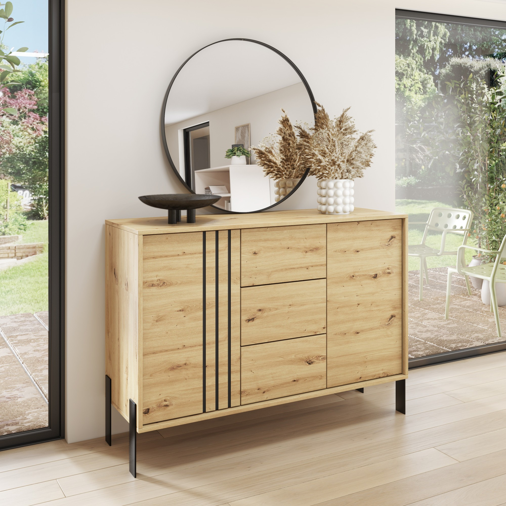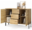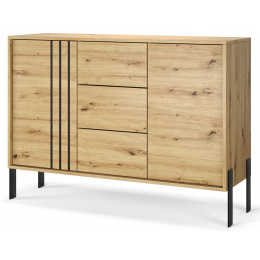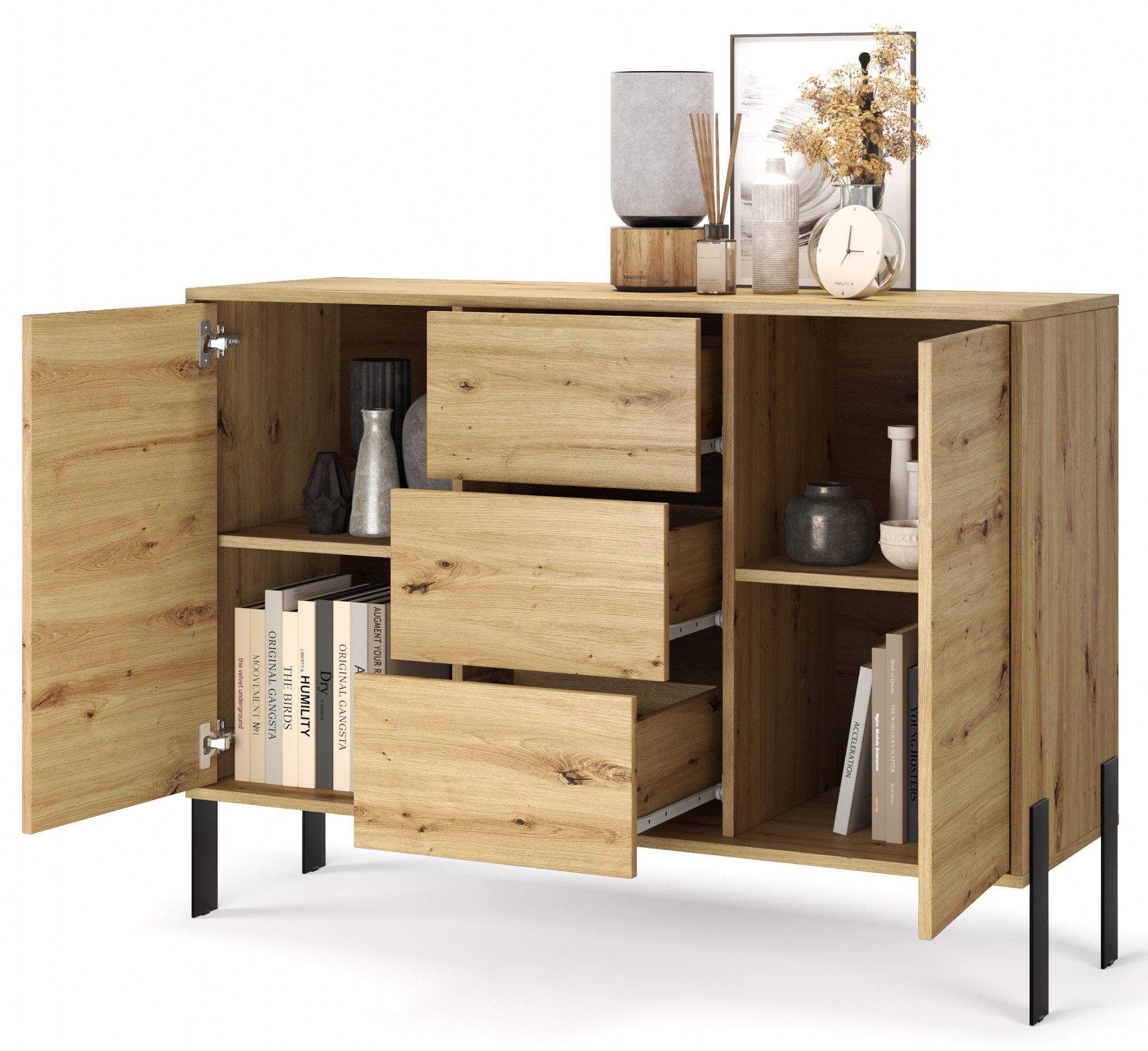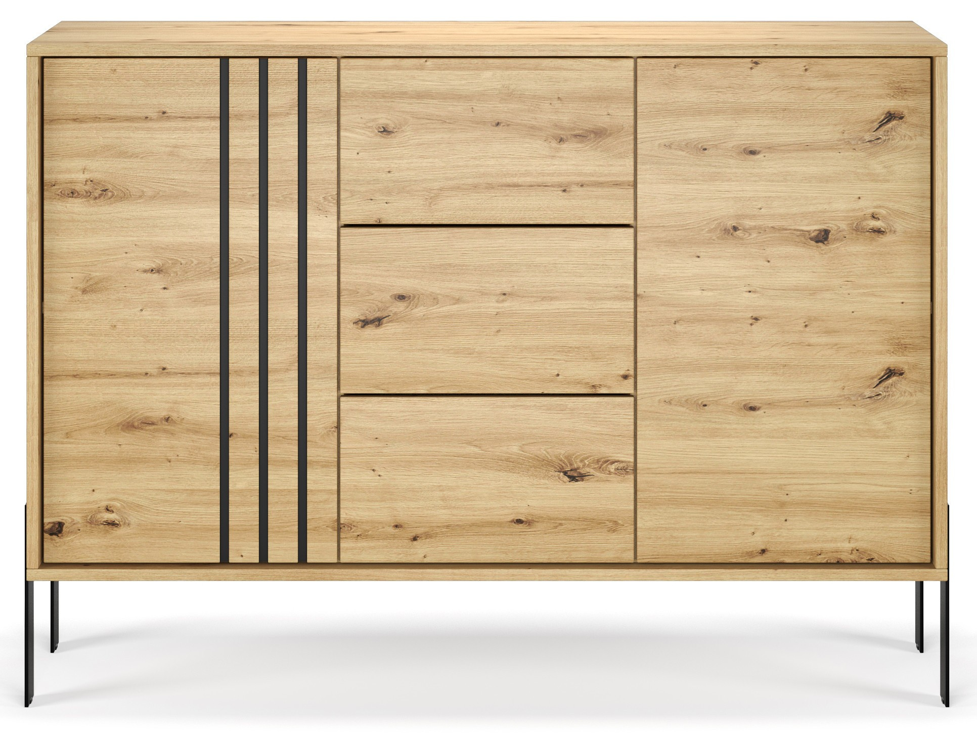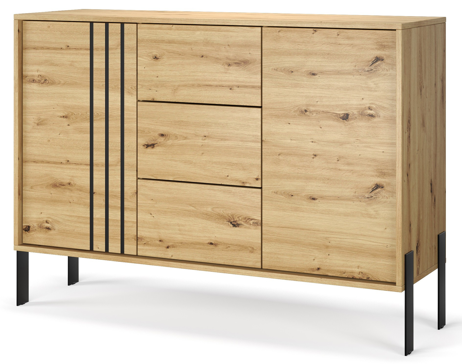 Komoda **Nexo** je moderní a funkční nábytek, který se skvěle hodí do obývacího pokoje, ložnice nebo předsíně. Jednoduchá forma v kombinaci s elegantními detaily způsobuje, že komoda se dokonale hodí do moderních a loftových interiérů. Čela v dekoru **Artisan** odkazují na přirozenou strukturu dřeva, vnášejí do místnosti teplo a útulný charakter. Verze **Kašmír** je naopak elegantní, tlumená barevnost, která se skvěle hodí k moderním interiérům. Charakteristickým prvkem kolekce jsou dekorativní černé lišty na čelní straně a stabilní **kovové nohy**, které dodávají nábytku lehkost a zdůrazňují jeho moderní styl.