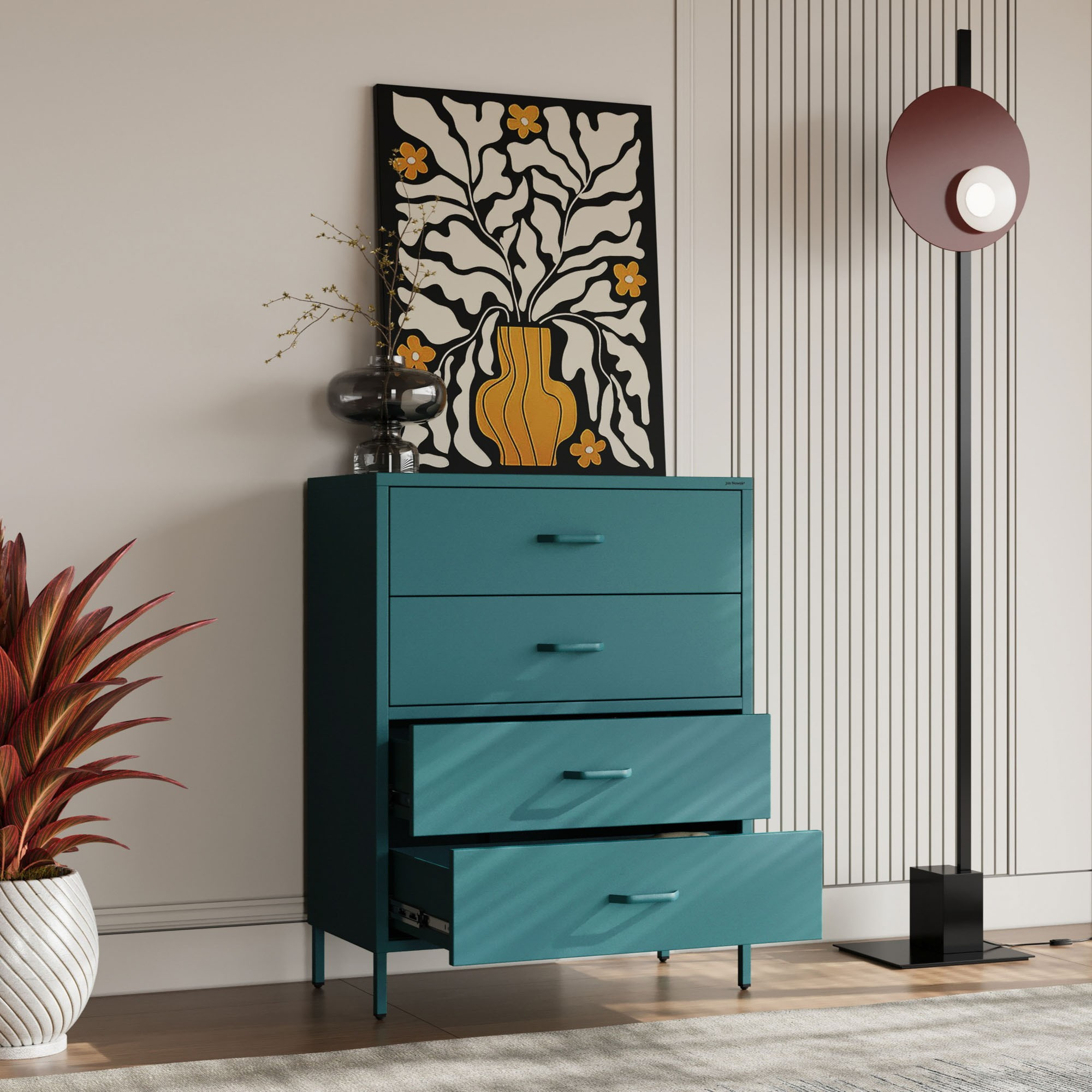 Potřebujete uložit oblečení, doplňky, dokumenty nebo jiné předměty? Komoda CARLA nabízí čtyři prostorné zásuvky, které vám poskytnou dostatek úložného prostoru. Uspořádejte si své věci přehledně a mějte je vždy po ruce.