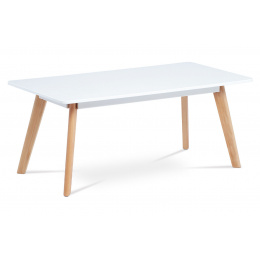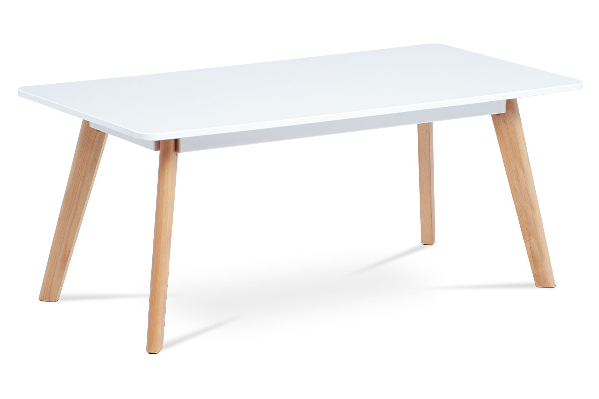 Moderní konferenční stolek s MDF deskou, která je lakovaná matnou bílou barvou a je vysoká 2 cm. Masivní nohy z buku jsou v přírodním odstínu a jsou opatřeny pěnovými kluzáky.