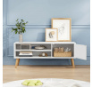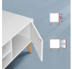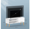 TV stolek o šířce 120 cm je vyroben z MDF desky v bílé barvě, která se snadno udržuje a nabízí hladký povrch. Stabilní nohy z masivního kaučukového dřeva dodávají stolku pevnost a přírodní vzhled, který kontrastuje s moderním bílým korpusem. Stolek disponuje praktickým úložným prostorem rozděleným na dvě otevřené police a jednu uzavíratelnou skříňku, což umožňuje efektivní organizaci elektroniky i doplňků. Otevřená část je vybavena průchodkou pro kabeláž, která usnadňuje zapojení zařízení. Kompaktní rozměry a čistý design činí tento konferenční stolek vhodným doplňkem do moderních obývacích pokojů.