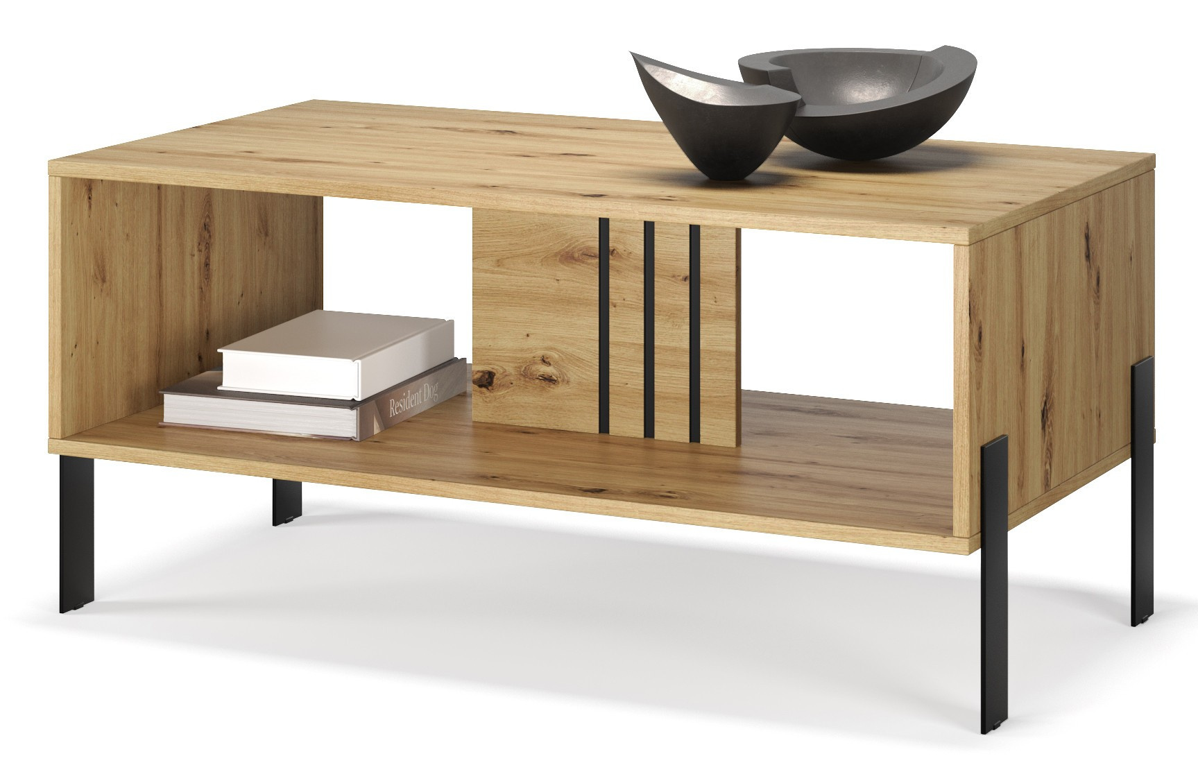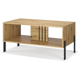 Konferenční stolek **Nexo** je moderní a funkční prvek vybavení obývacího pokoje, který dokonale doplní relaxační prostor. Jednoduchá, minimalistická forma v kombinaci s elegantními detaily způsobuje, že stolek se skvěle hodí jak do moderních, tak do loftových interiérů. Model je dostupný ve dvou stylových barevných variantách: **Artisan**, inspirovaný přirozeným vzhledem dřeva, a **Kašmír**, který interiéru dodává elegantní a jemný charakter. Charakteristickým prvkem kolekce Nexo jsou dekorativní černé lišty a stabilní **kovové nohy**, které dodávají nábytku lehkost a zdůrazňují jeho moderní styl.