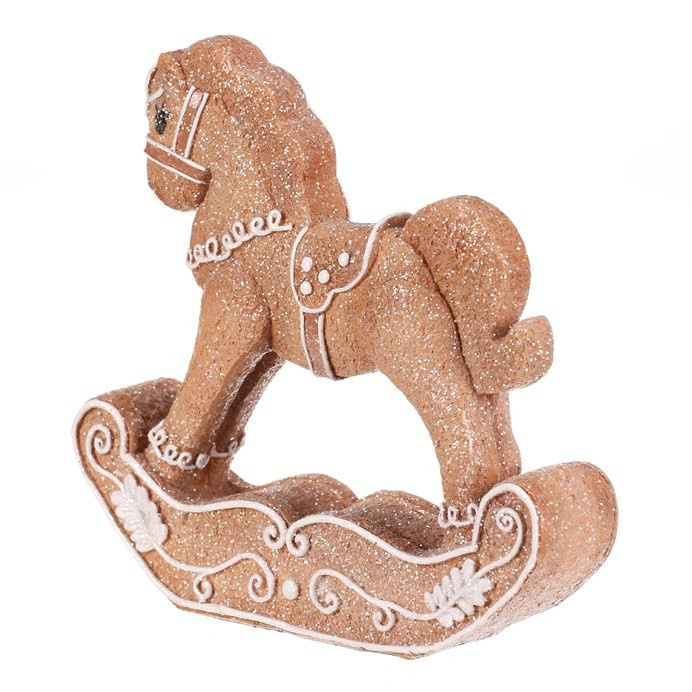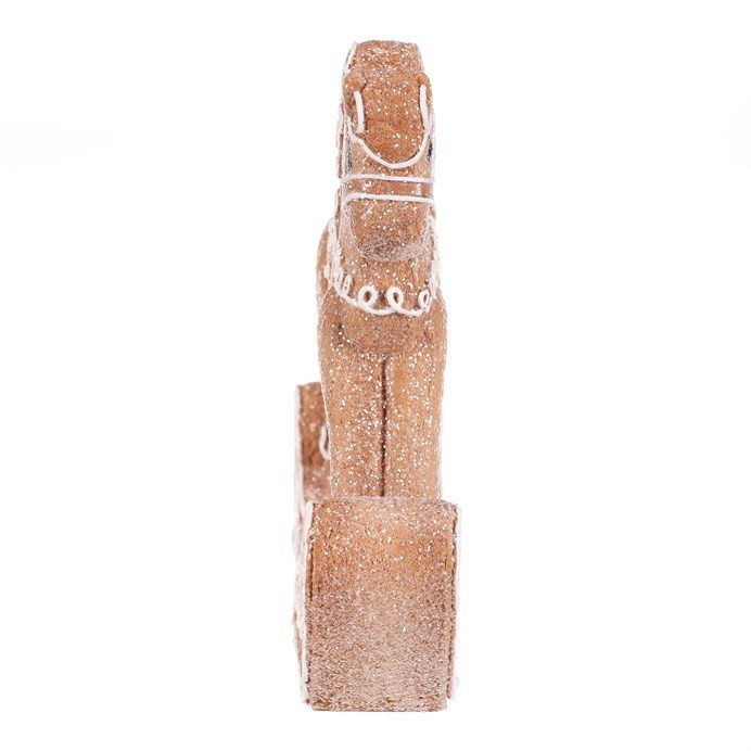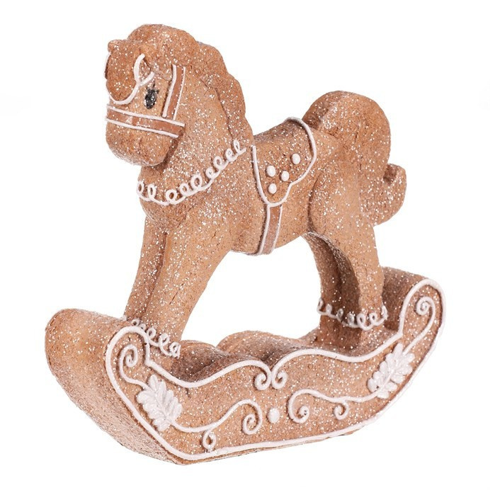 Perníkový koník z polyresinu v hnědém odstínu s bílým zdobením je kouzelnou vánoční ozdobou. Skvěle se hodí na poličku, stůl nebo jiná viditelná místa, kde přinese do vašeho interiéru vánoční pohodu a kouzlo tradic.