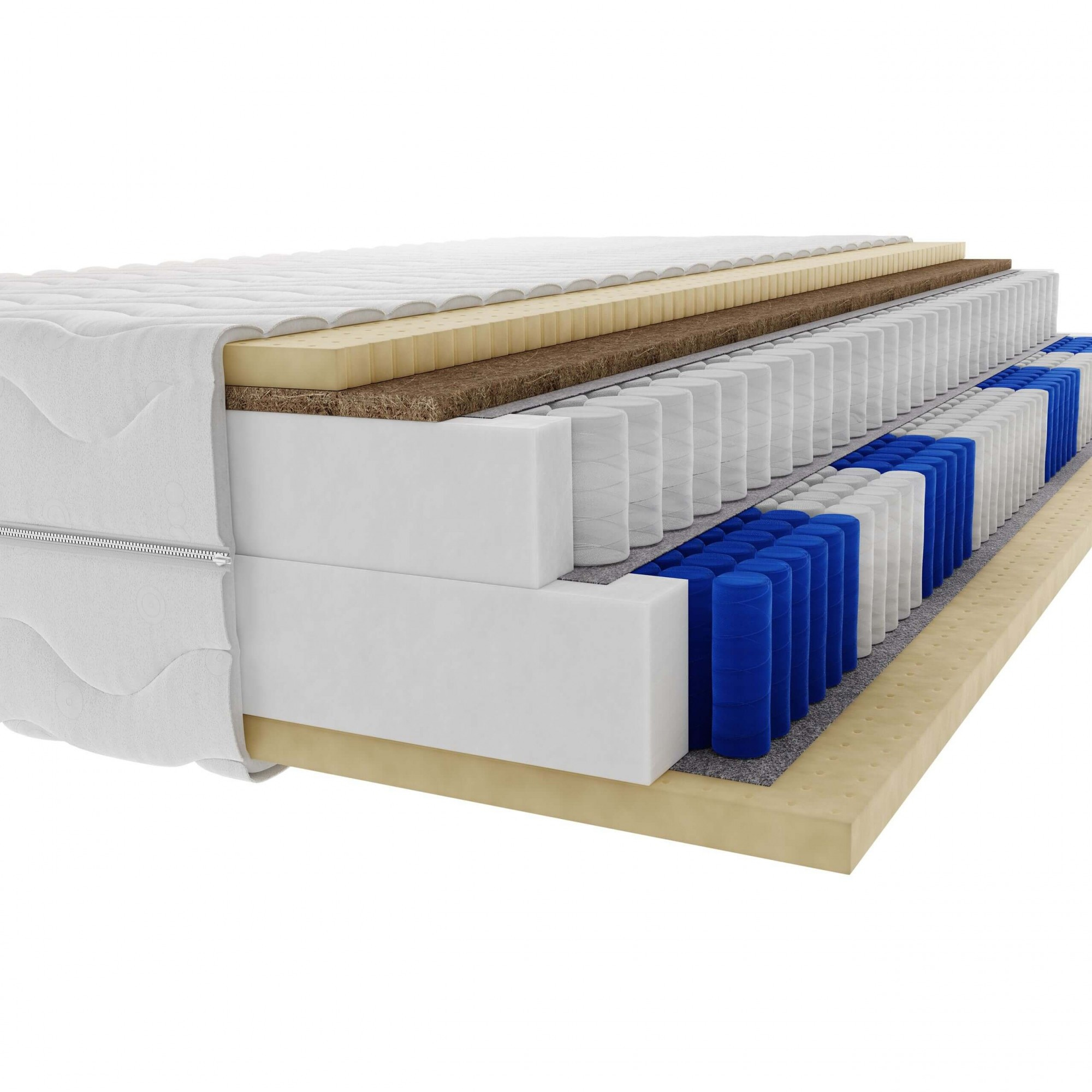 Kontinentální matrace MINT se skládá z několika vrstev, které se vzájemně doplňují a zajišťují dokonalý spánek. Základ tvoří robustní spodní box, který poskytuje pevnou a stabilní základnu. Na něm je umístěna hlavní matrace s kvalitními pružinami, které se dokonale přizpůsobí tvaru vašeho těla a zajistí optimální rozložení váhy. Vrchní vrstvu tvoří topper, tenká matrace, která zvyšuje komfort a prodlužuje životnost hlavní matrace.