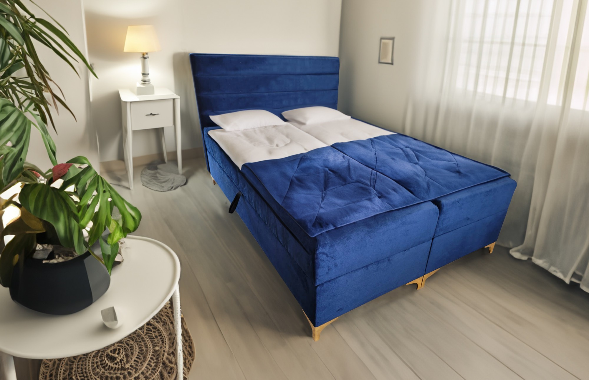 - Spodní boxspring: Pevný základ postele tvoří boxspring, který zajišťuje stabilitu a rovnoměrné rozložení váhy. Tato vrstva také slouží jako pružný podklad pro matraci, čímž zvyšuje její komfort a prodlužuje životnost.