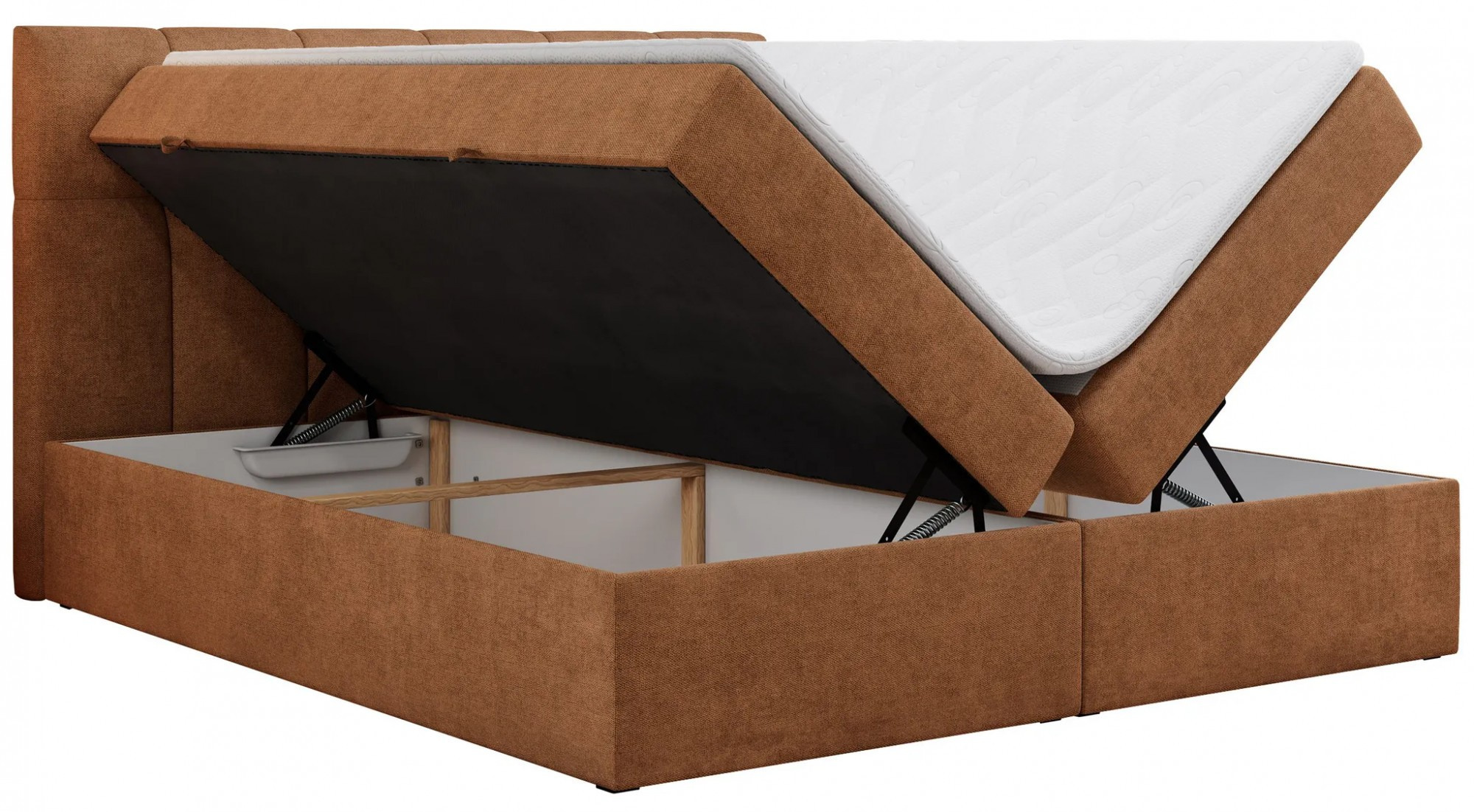 - Spodní boxspring: Pevný základ postele, který poskytuje stabilní podporu a tlumí nárazy.
