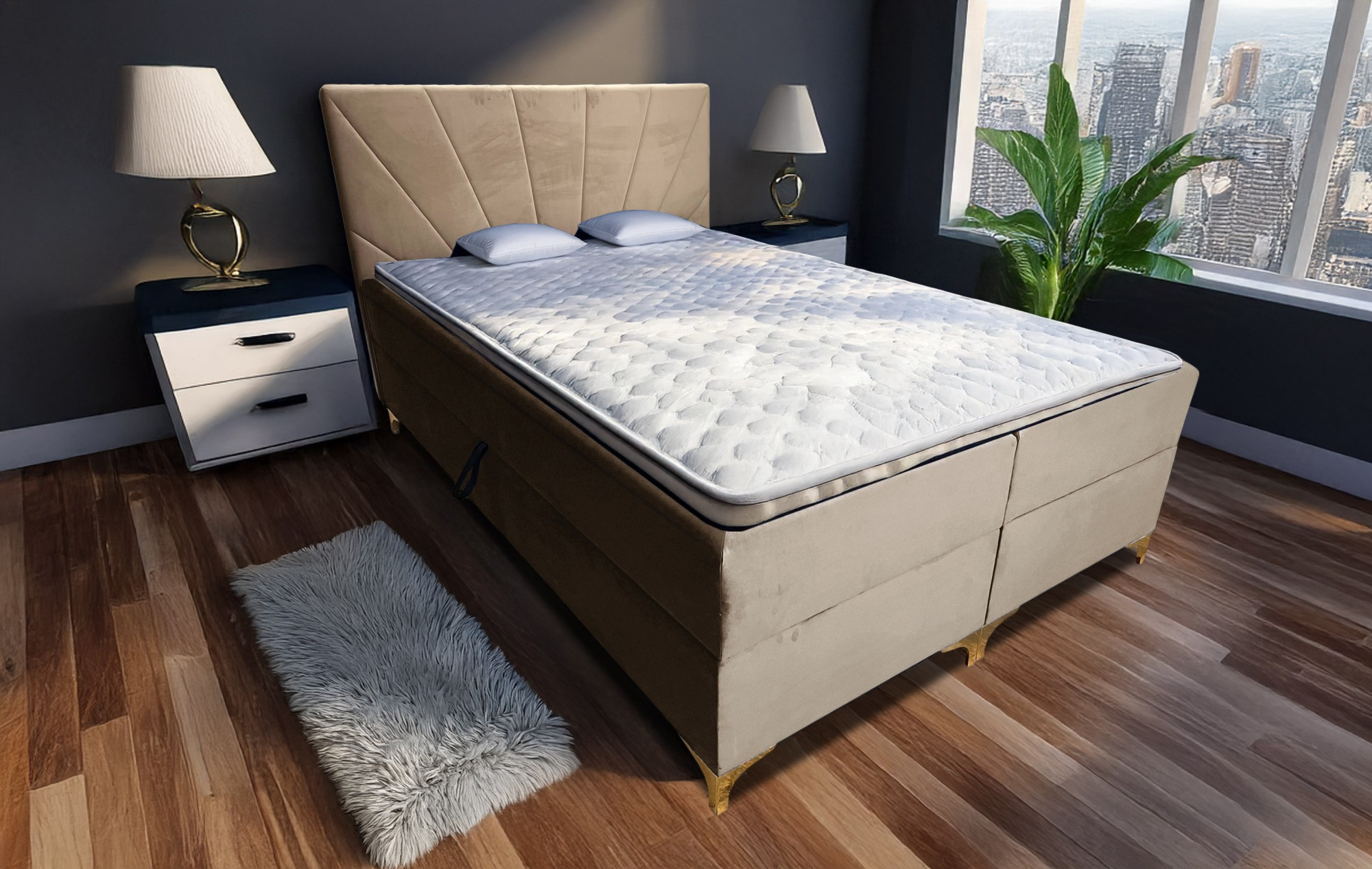 - Trojitá vrstva komfortu: Základ tvoří pevný rám s pružinovým jádrem, na kterém je umístěna kvalitní matrace a topper. Tato kombinace zajišťuje optimální podporu těla a rovnoměrné rozložení váhy.