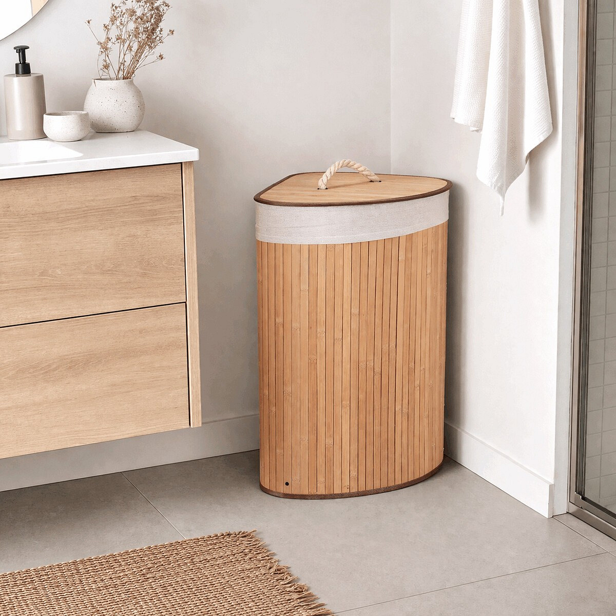 Rohový prádelní koš z bambusu v přírodním odstínu nabízí praktické a estetické řešení pro ukládání prádla. Jeho pevné bambusové lamely jsou uspořádány vertikálně a vytvářejí stabilní a lehkou konstrukci, která zároveň působí vzdušně. Koš je doplněn víkem s praktickým úchytem z pevného provazu, který usnadňuje manipulaci a zároveň zabraňuje úniku pachů. V horní části je lemovaný textilní pás v přírodní barvě, který dodává jemný kontrast a chrání okraje. Díky rohovému tvaru efektivně využívá prostor v místnosti a hodí se zejména do koupelen či šaten.