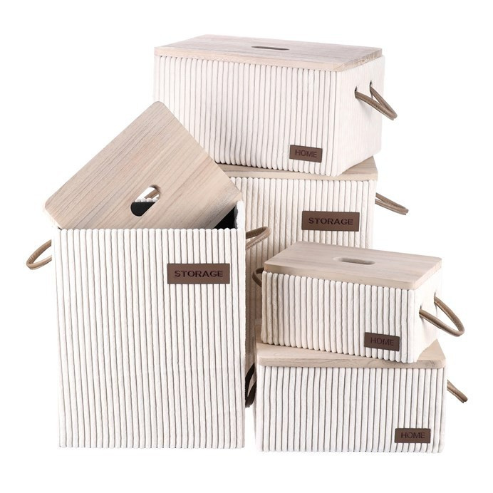 Sada látkových prádelních košů v krémové barvě s elegantním dřevěným víkem a praktickými poutky po stranách. Obsahuje 5 různých velikostí, které jsou nejen estetické, ale i funkční pro váš domov.