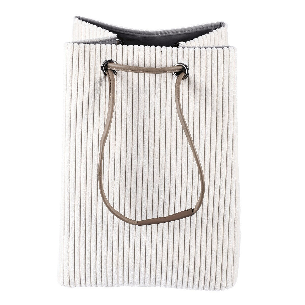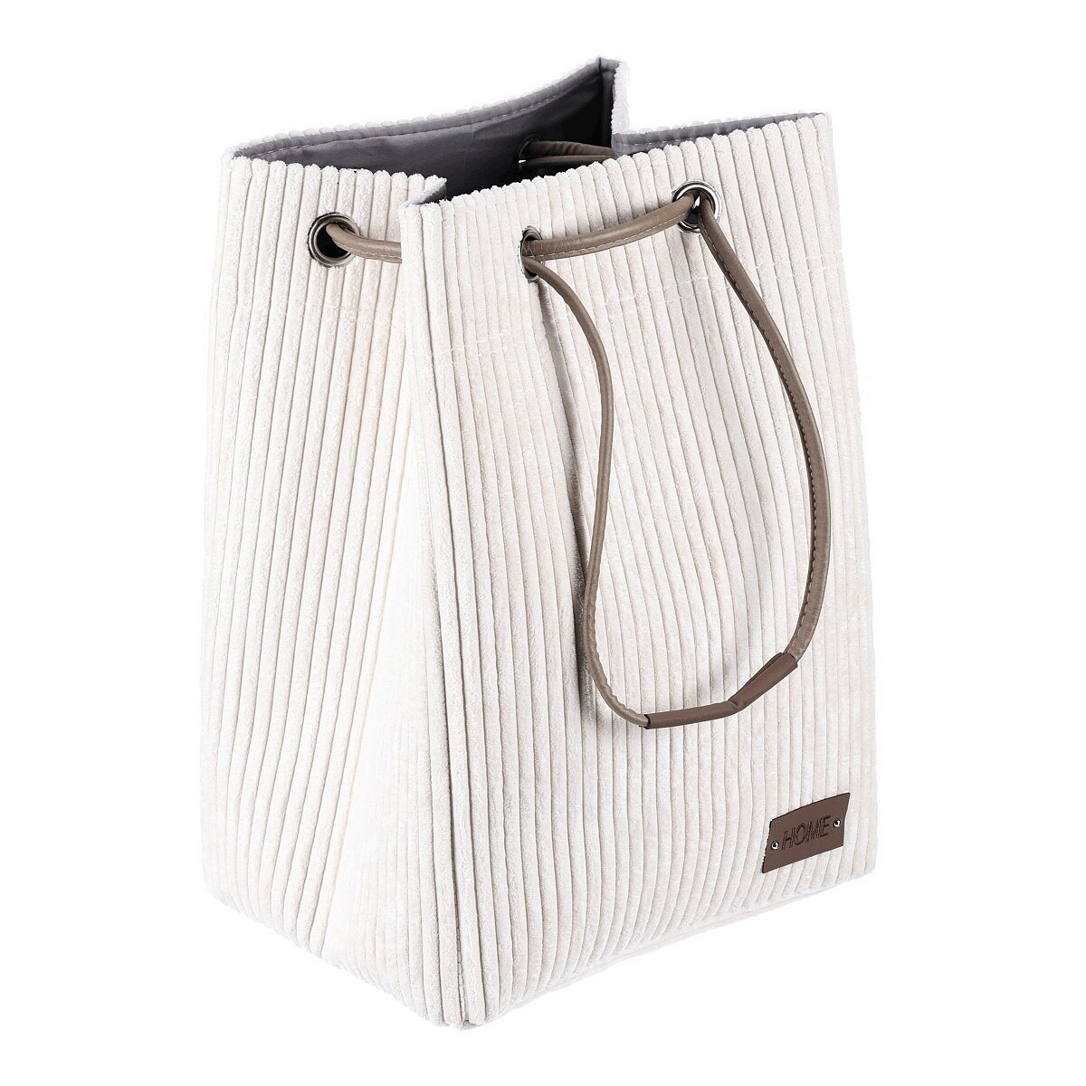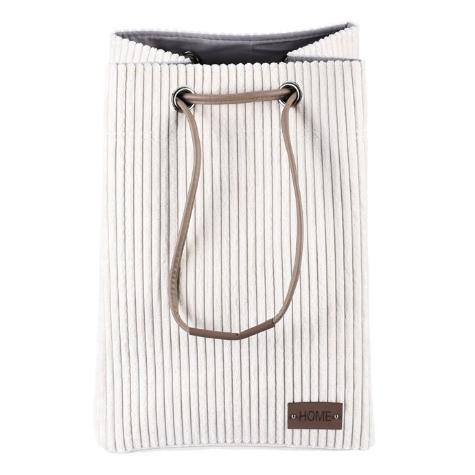 Látkový prádelní koš z manšestru v elegantní světle krémové barvě, se stahovacím uzávěrem pro chytré a efektivní ukrytí prádla. Stylový doplněk, který spojuje praktičnost s estetickým vzhledem.