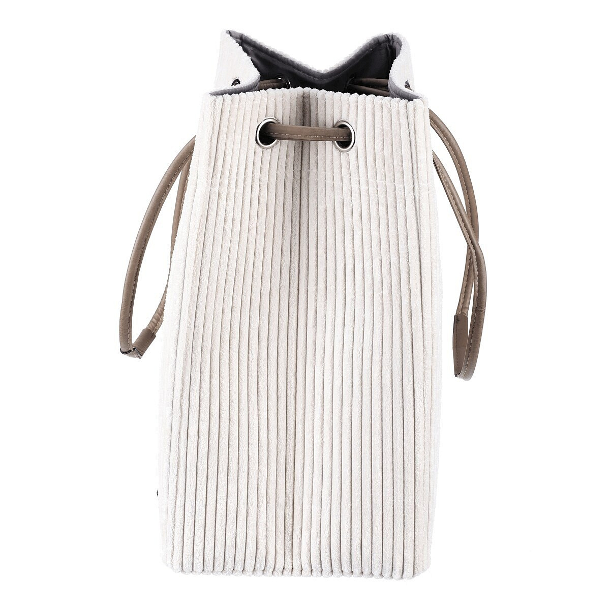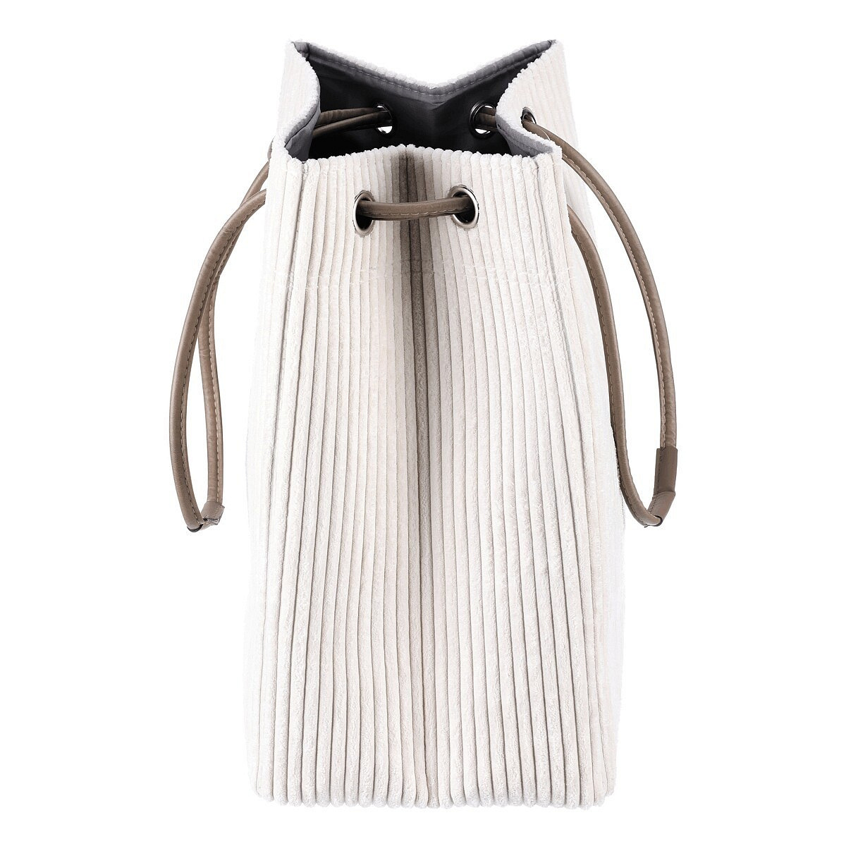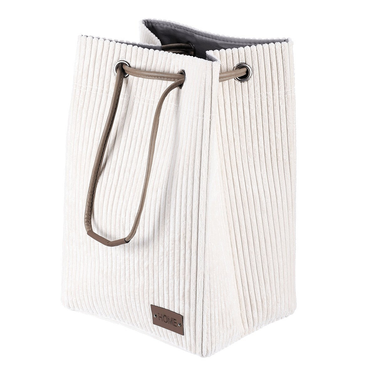Látkový prádelní koš z manšestru v elegantní světle krémové barvě, se stahovacím uzávěrem pro chytré a efektivní ukrytí prádla. Stylový doplněk, který spojuje praktičnost s estetickým vzhledem.