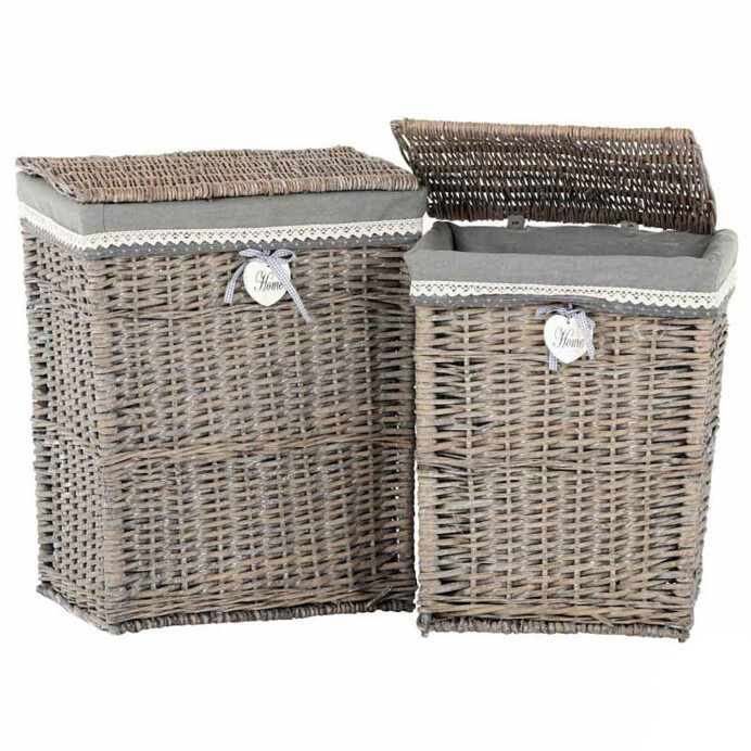 Sada dvou proutěných prádelních košů v šedém odstínu nabízí praktické a zároveň stylové řešení pro ukládání prádla. Koše jsou vyrobeny z pevného proutí s látkovou výstelkou v přírodních tónech, která chrání obsah a usnadňuje údržbu. Každý koš je vybaven víkem, které zajišťuje diskrétní uschování prádla a přispívá k celkovému estetickému dojmu. Dekorativní krajka a srdíčková ozdoba dodávají výrobku jemný rustikální charakter. Vhodné do koupelen, ložnic i prádelních místností pro efektivní organizaci prostoru.