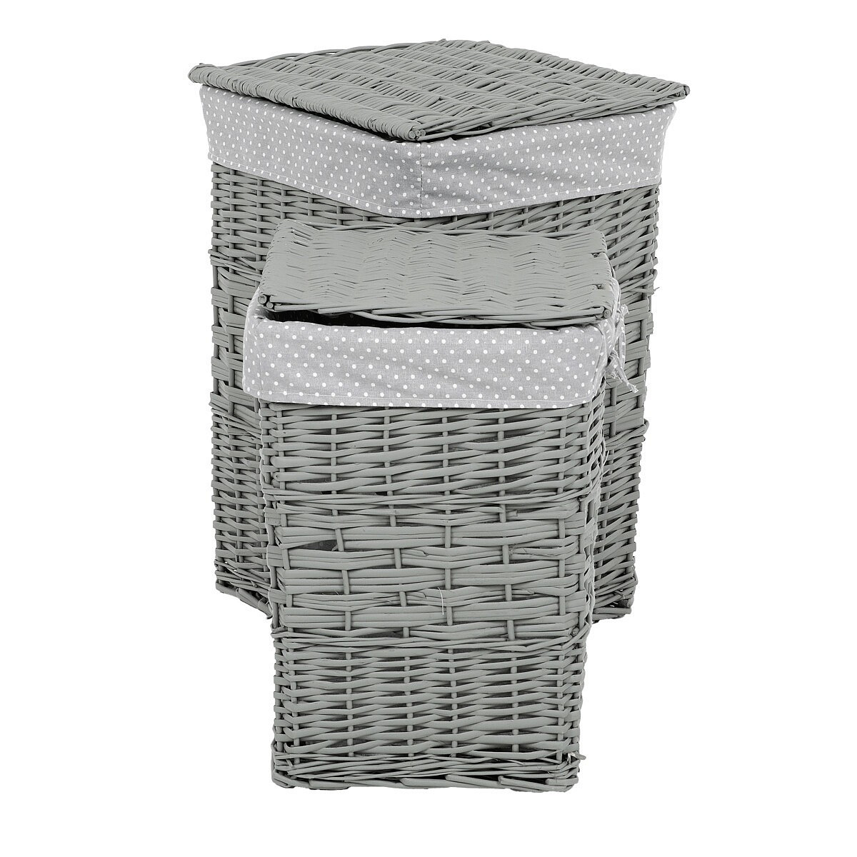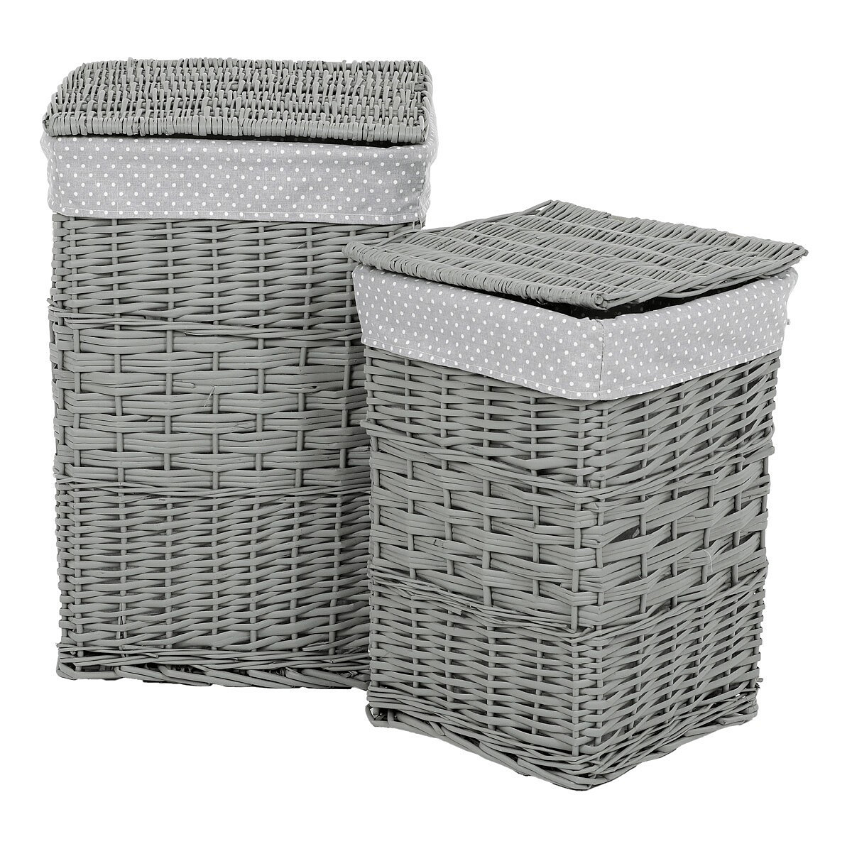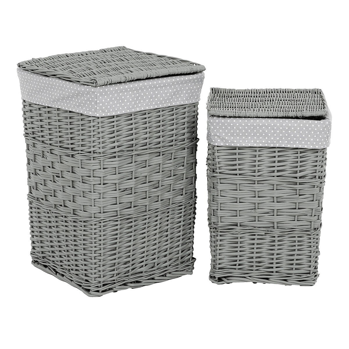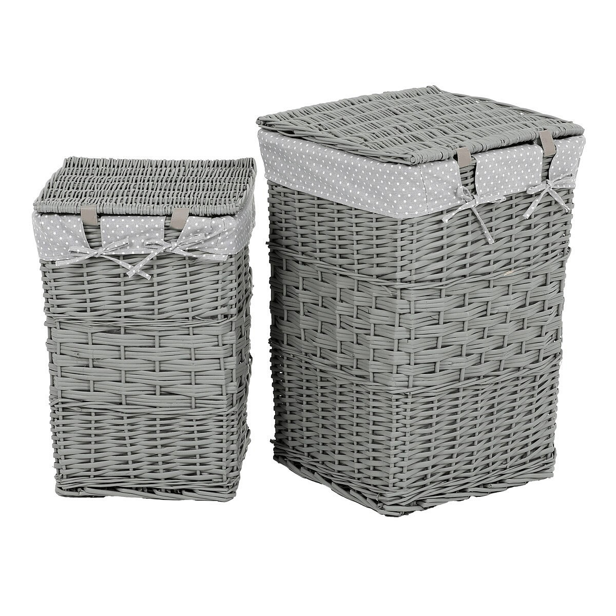 Myslíte si, že obyčejný koš na prádlo nemůže být zároveň i vkusnou dekorací? Pak jste na omylu, neboť naše proutěné v šedé barvě splňují naprosto dokonale funkci praktickou i estetickou. Jejich elegantní design a použití přírodního materiálu činí z těchto košů neodolatelný prostředek pro efektivní uskladňování špinavého prádla. Jsou vystlané látkou a mají sklápěcí víko, díky kterému jejich obsah dokonale schováte. Nabízíme je v sadě dvou kusů stejného stylu a odlišných rozměrů.