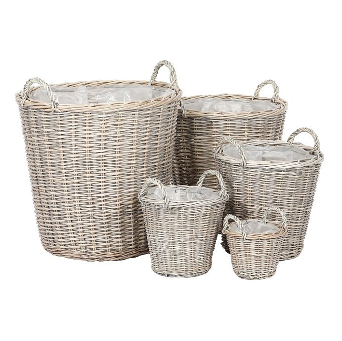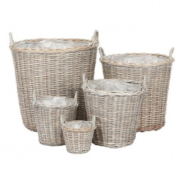 Proutěný koš s kruhovým půdorysem v přírodní našedivělé barvě představuje skvělou variantu obalu pro vaše květiny. Nabízíme vám je v sadě pěti různých velikostí, tak abyste mohli vybrat tu správnou míru pro vaší vybranou rostlinu. Materiál z proutí dodává do interiéru příjemný a rustikální vzhled, který navodí útulnější a atmosféru. Tento koš se dvěma uchy po stranách pro snadnější přemisťování, je navíc vybaven igelitovou vložkou, která zabraňuje prosakování vody, a tím chrání obal samotný včetně jeho bezprostředního okolí.