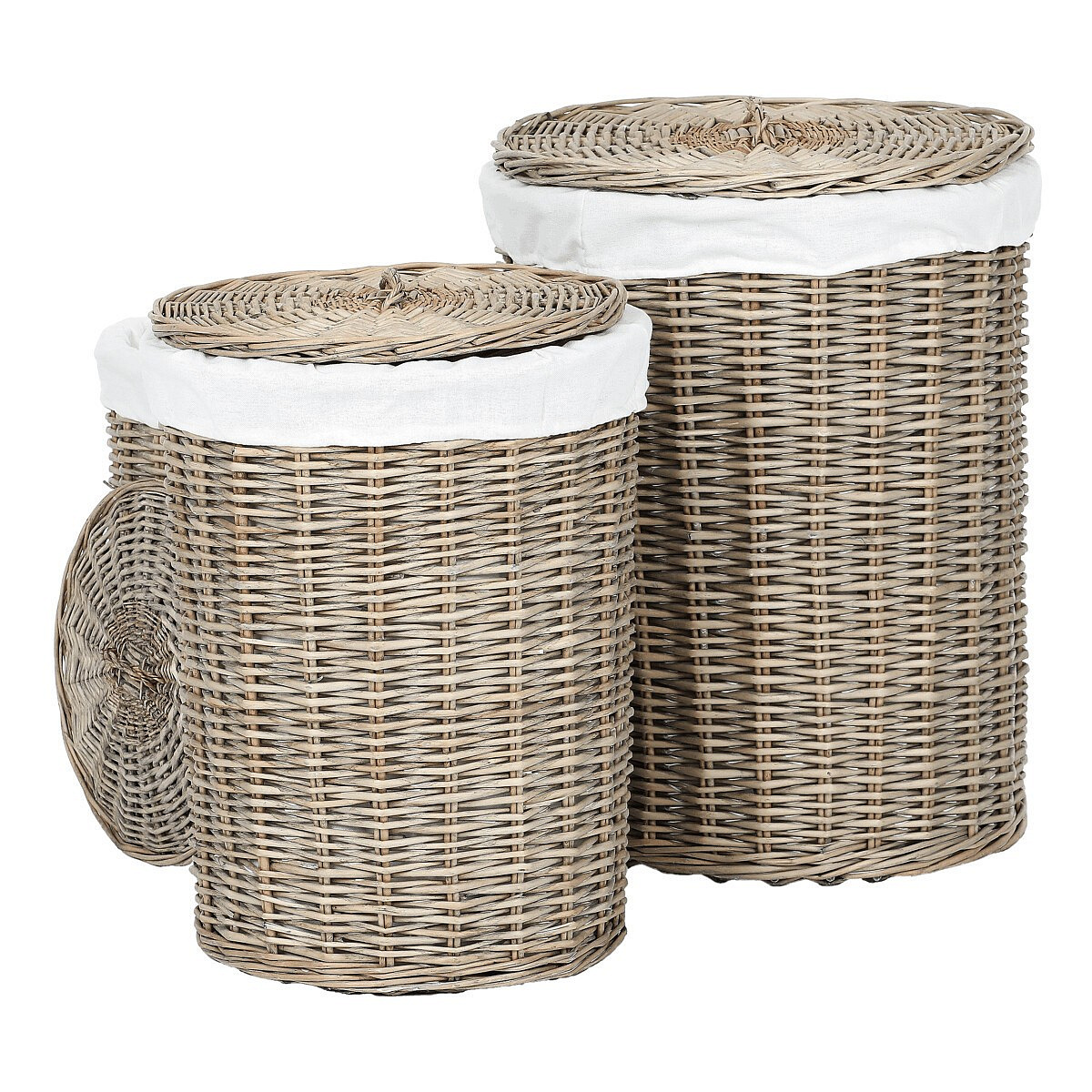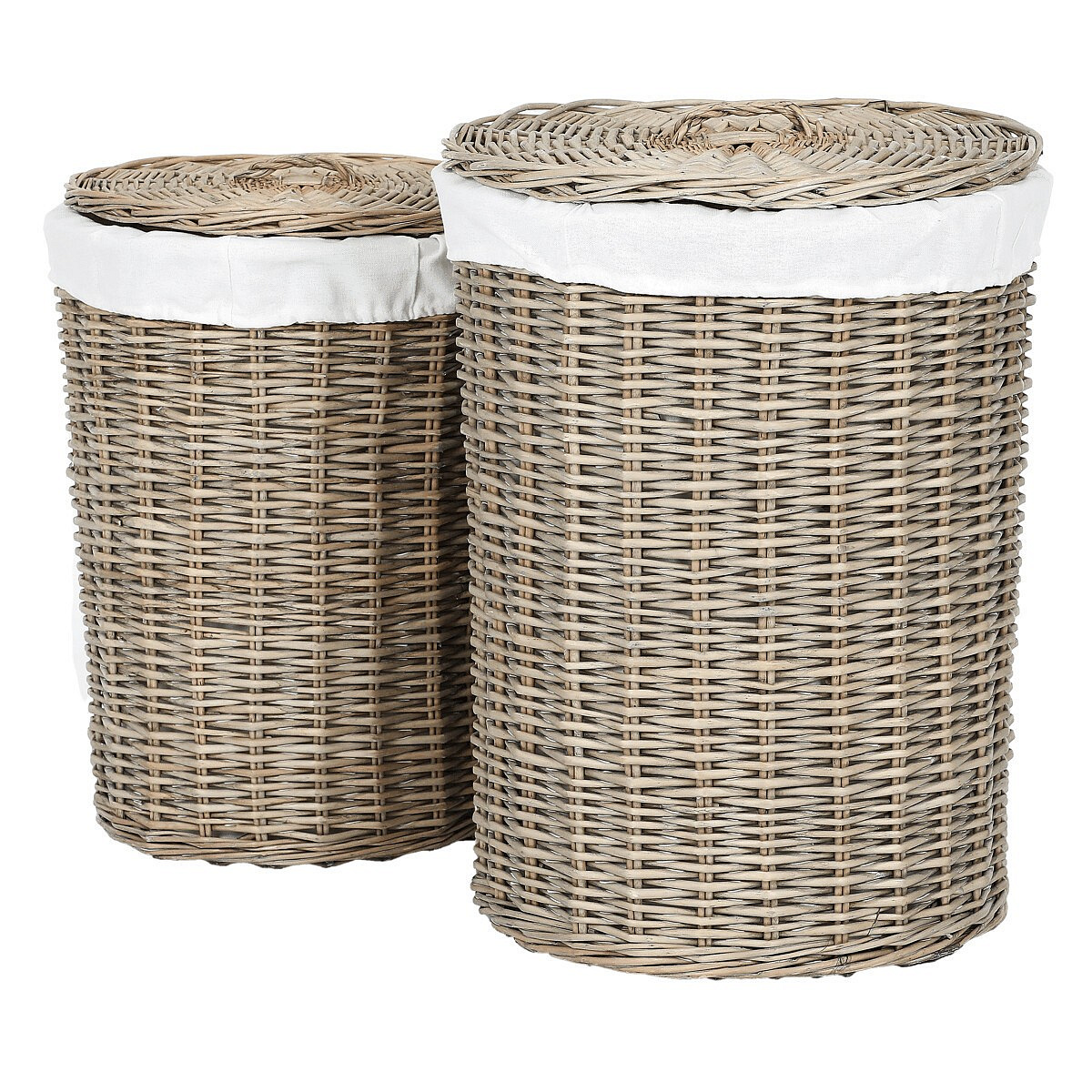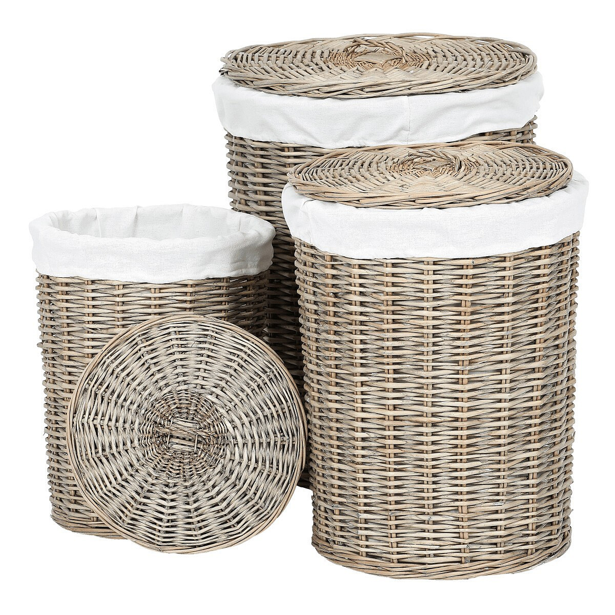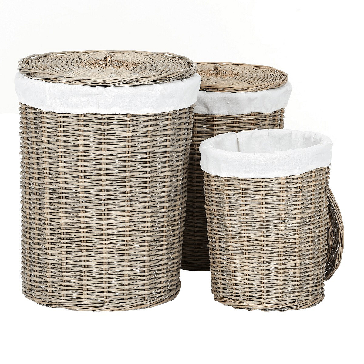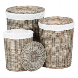 Získejte elegantní a praktické řešení pro sběr špinavého prádla, díky proutěným košům ve tvaru válce. Tato sada obsahuje 3 různě velké koše, každý s víkem a vnitřní výstelkou z látky, což zajišťuje lepší ochranu a diskrétnost obsahu. Barva proutí je šedá až béžová, což tyto koše činí univerzálními pro umístění v různých typech interiérů. Stylový proutěný design se snadno zaintegruje i do vaší domácnosti a zároveň poskytne efektivní řešení pro ukládání špinavého prádla. Udržujte svůj prostor uklizený a patřičně uspořádaný i za přispění těchto proutěných košů na prádlo.