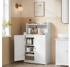 Koupelnová skříňka o rozměrech 60x30x100 cm je vyrobena z MDF desek s matnou bílou povrchovou úpravou, která napodobuje přírodní dřevěný dekor a snadno se udržuje. Skříňka nabízí praktický úložný prostor za dvířky s decentními kovovými úchytkami a otevřenou policí nahoře pro snadný přístup k často používaným předmětům. Stabilní provedení z MDF zajišťuje pevnost a dlouhou životnost nábytku, který je vhodný zejména do koupelen a dalších vlhkých prostor díky odolnosti povrchu. Design s mírně zaoblenými hranami a jednoduchými liniemi přispívá k čistému a svěžímu vzhledu interiéru.