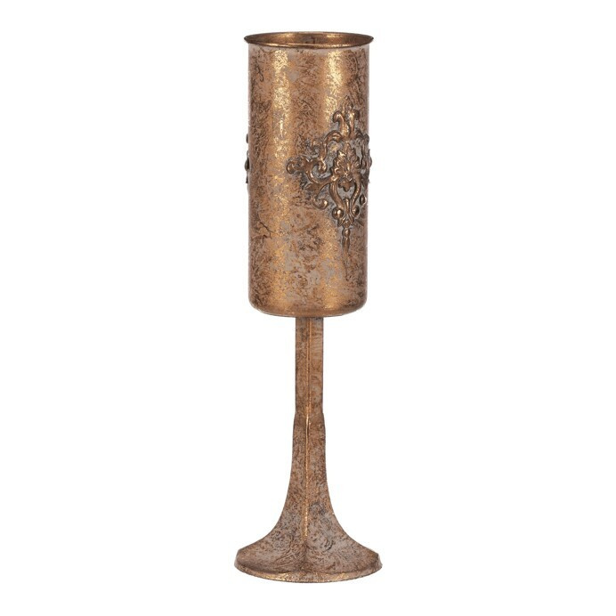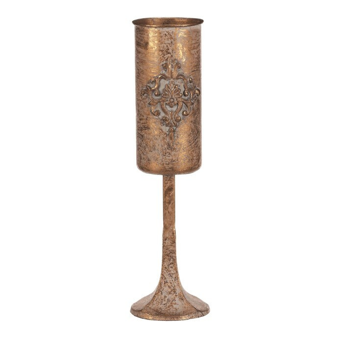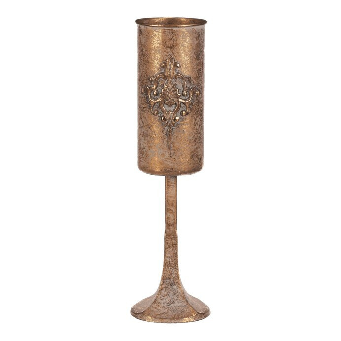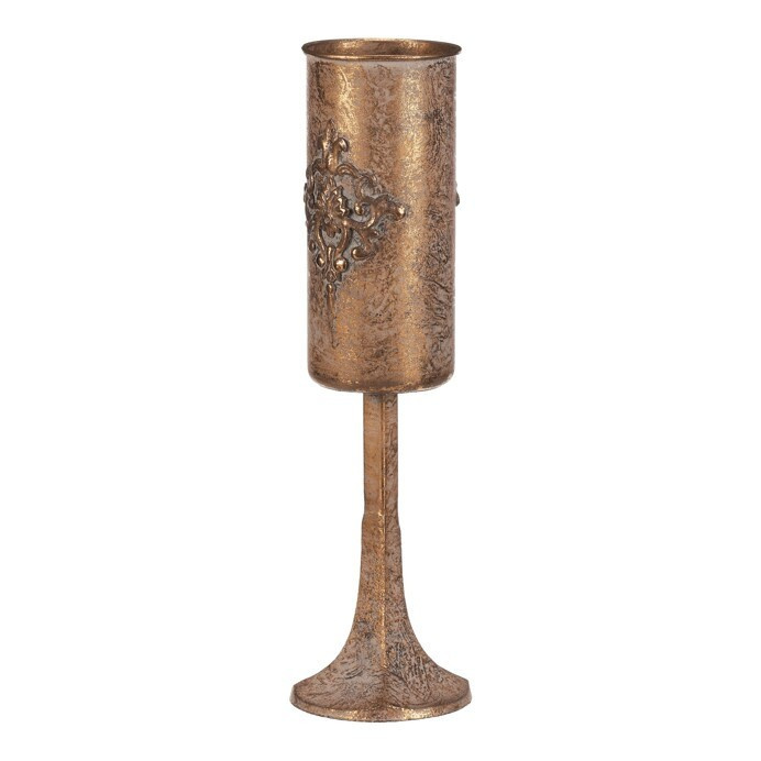 Úzký kovový kalich, z naší přepychové kolekce dekoračního zboží, vám přináší noblesu a eleganci přímo na váš stůl. Zlatá barva a starožitný vzhled povýší vaše každodenní stolování na královskou úroveň. S tímto unikátním artiklem, který věrně připomíná cenný předmět s historickou hodnotou, se budete cítit jako host na královském dvoře, zářící luxusem. Přiveďte si do svého interiéru unikátní ozdobný prvek a proměňte běžné stolování v přepychovou událost plnou romantiky a elegance, na kterou jen tak nezapomenete.