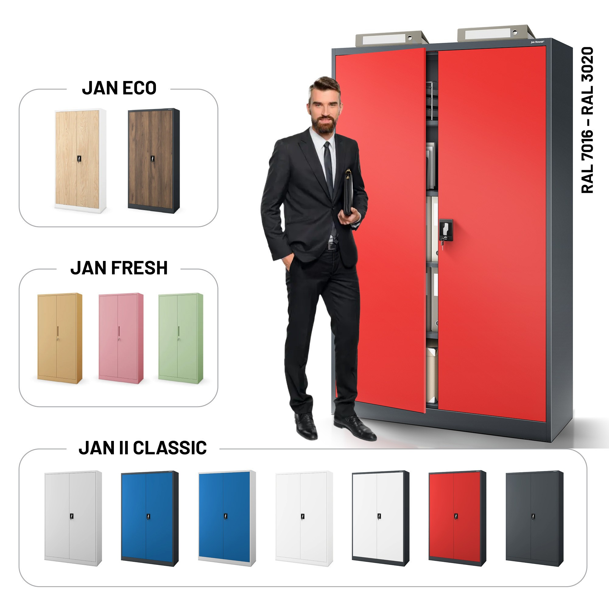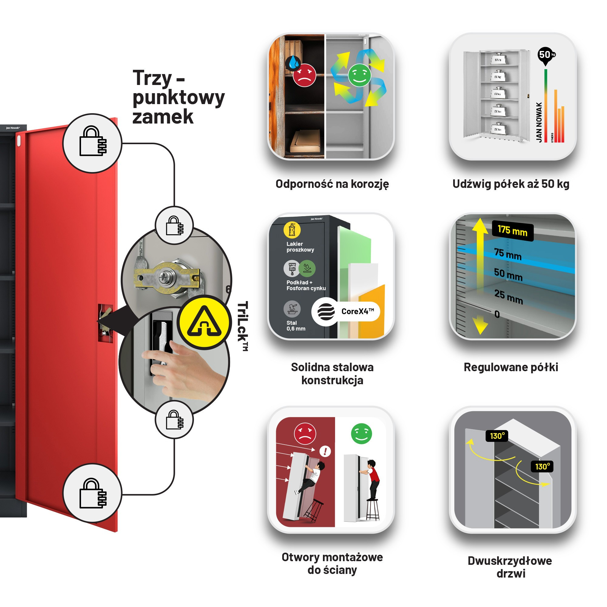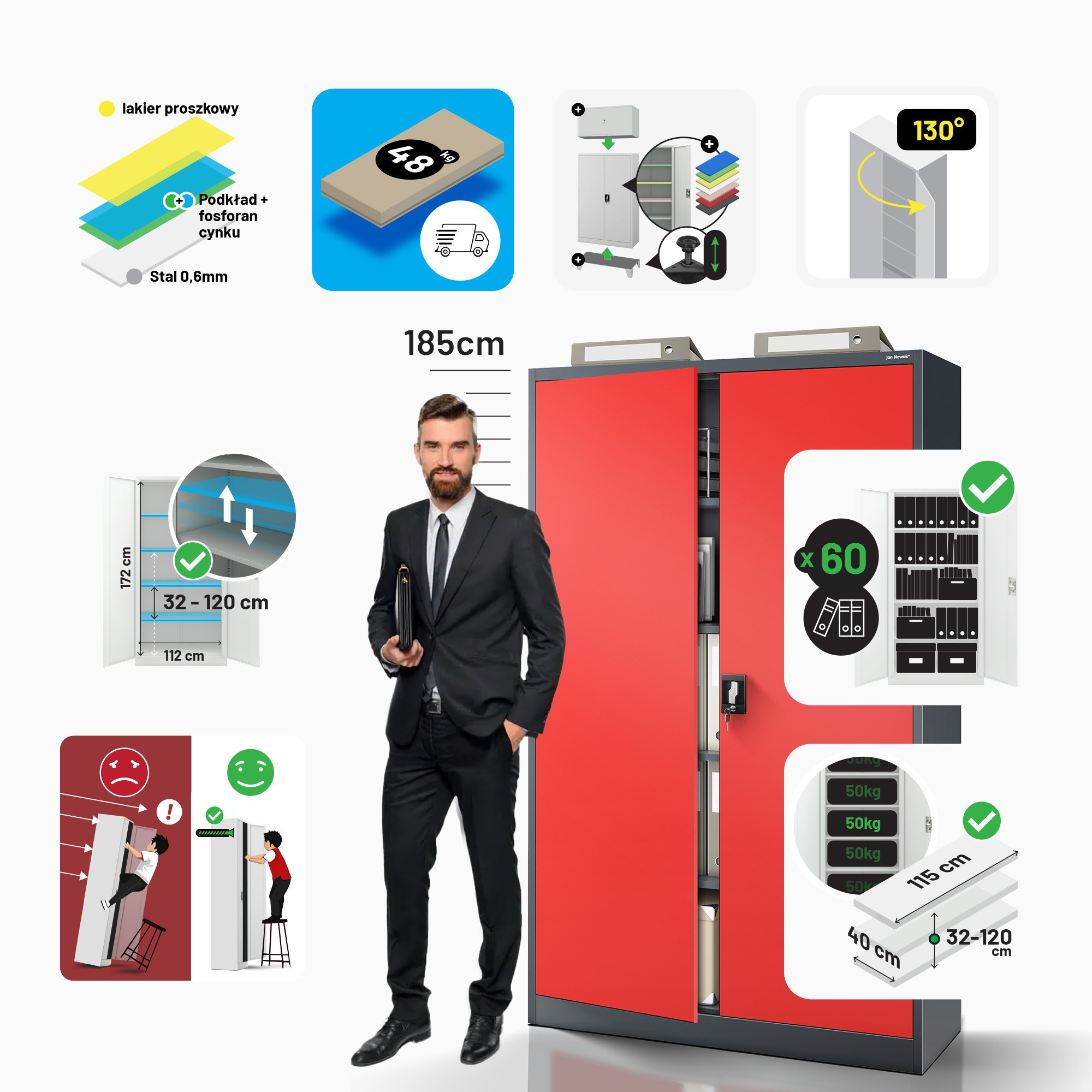 Kancelářská skříň JAN II – antracitově-červená Skříň model JAN II – ocelová, na dokumenty, lékařská, do dílny, antracitově-červená Uzamykatelná kovová skříň JAN II je model z kolekce JAN NOWAK. Překvapí vás maximální propracovanost kancelářského nábytku z hlediska funkčnosti, designu, trvanlivosti a spolehlivosti. S lehkostí v ní uložíte nejen dokumenty, ale i mnoho dalších věcí větších rozměrů, jako jsou nástroje nebo lékařské vybavení. Skříň ideální pro: kanceláře, úřady, firmy, zdravotnická zařízení, dílny, průmyslové závody Pokud hledáte skříň do domácího interiéru v loftovém nebo skandinávském stylu, ocelová uzamykatelná skříň JAN II se také osvědčí díky svému industriálnímu a minimalistickému charakteru. Skříň na dokumenty JAN II – čím se vyznačuje? Skříň na dokumenty JAN II byla práškově lakována v výrazné barevné kombinaci antracitu a červené. Její mimořádně odolná konstrukce bude plnit svou roli po mnoho let a díky plné regulaci polic získáte pro sebe vhodné úložné prostory.Naše kovová skříň byla vybavena otvory na zadní a boční stěně, které umožňují její připevnění ke stěně. Zvýší to bezpečnost každodenního používání. Velmi objemných 60 šanonů je pro ni maličkost! Uzamykatelná na zámek Zámek zajištěný ve 3 bodech (2 klíče v sadě). Solidní a odolná Ocel vysoké kvality o tloušťce 0,6 mm - odolná proti mechanickému poškození, práškově lakovaná. Vysoce funkční 4 police nastavitelné po 25 mm, každá s nosností až 50 kg. Kovová uzamykatelná skříň JAN II: výška 185 cm, šířka 115 cm, hloubka 40 cm, hmotnost 52 kg, barva antracitově-červená RAL 7016 – RAL 3020 Výhodná řešení Záruka kvality! Solidní provedení a nejlepší materiály. To je hodnota, kterou je těžké najít jinde na trhu! Atesty Vyberte skříň s certifikátem PZH. RODO 2018 Zaměřte se na kancelářský nábytek speciálně navržený podle RODO 2018. Stojí za to vědět: skříň je dodávána v částech (vyžaduje vlastní montáž) Vystavujeme faktury DPH Kolekce kancelářského nábytku Vynikající pověst nás zavazuje k ještě většímu úsilí. Jsme jedním z největších dodavatelů ocelových skříní v Evropě a nastavujeme si laťku výše než ostatní!