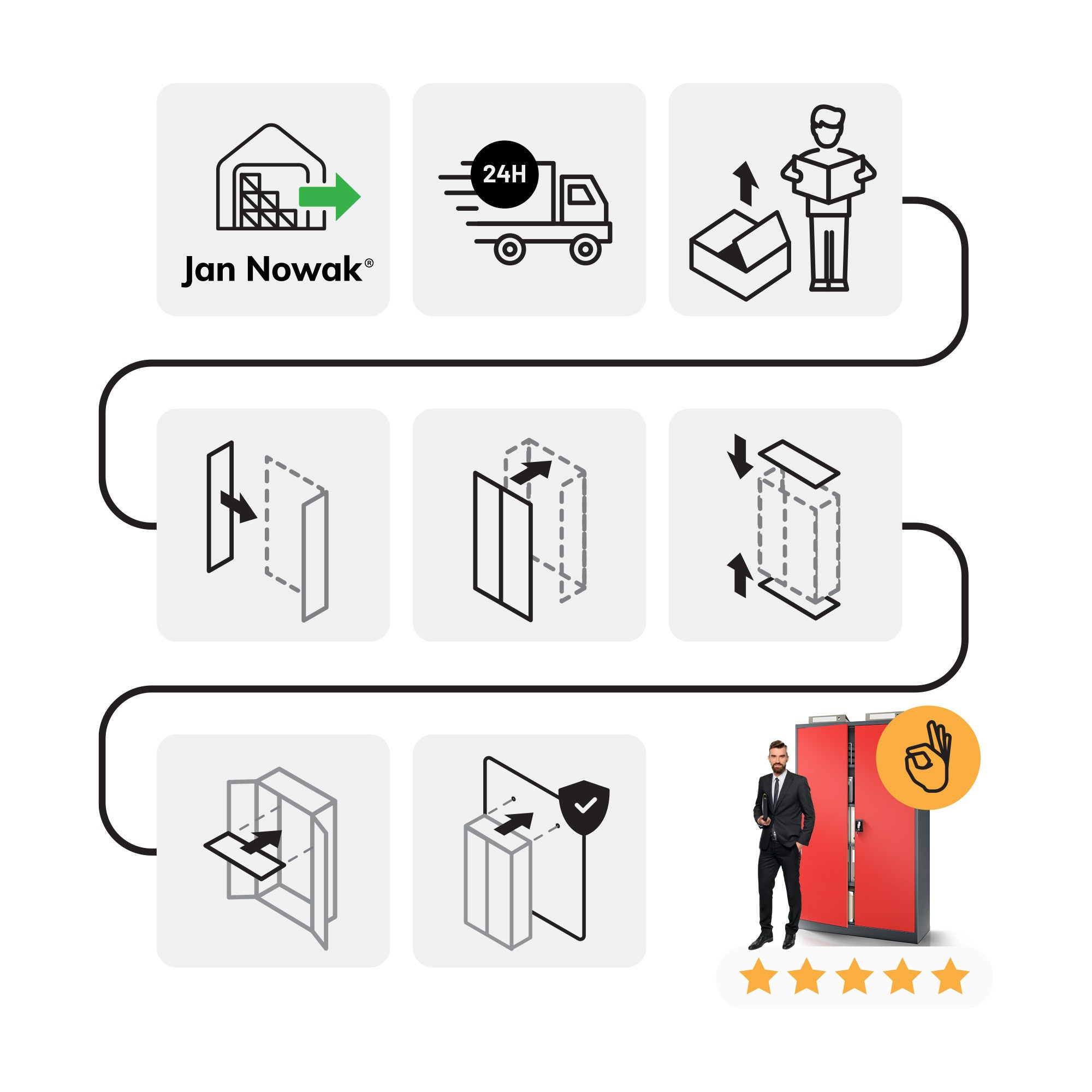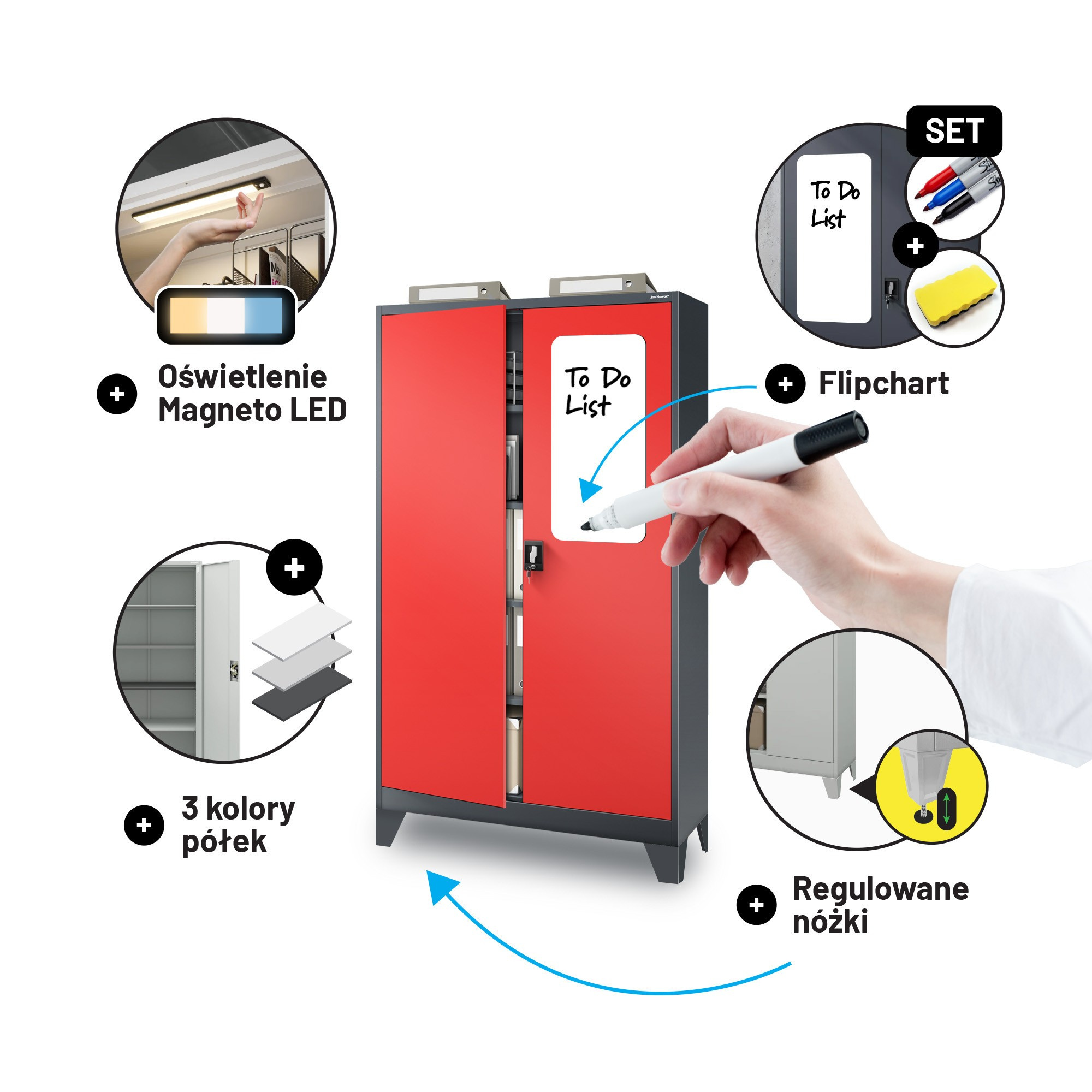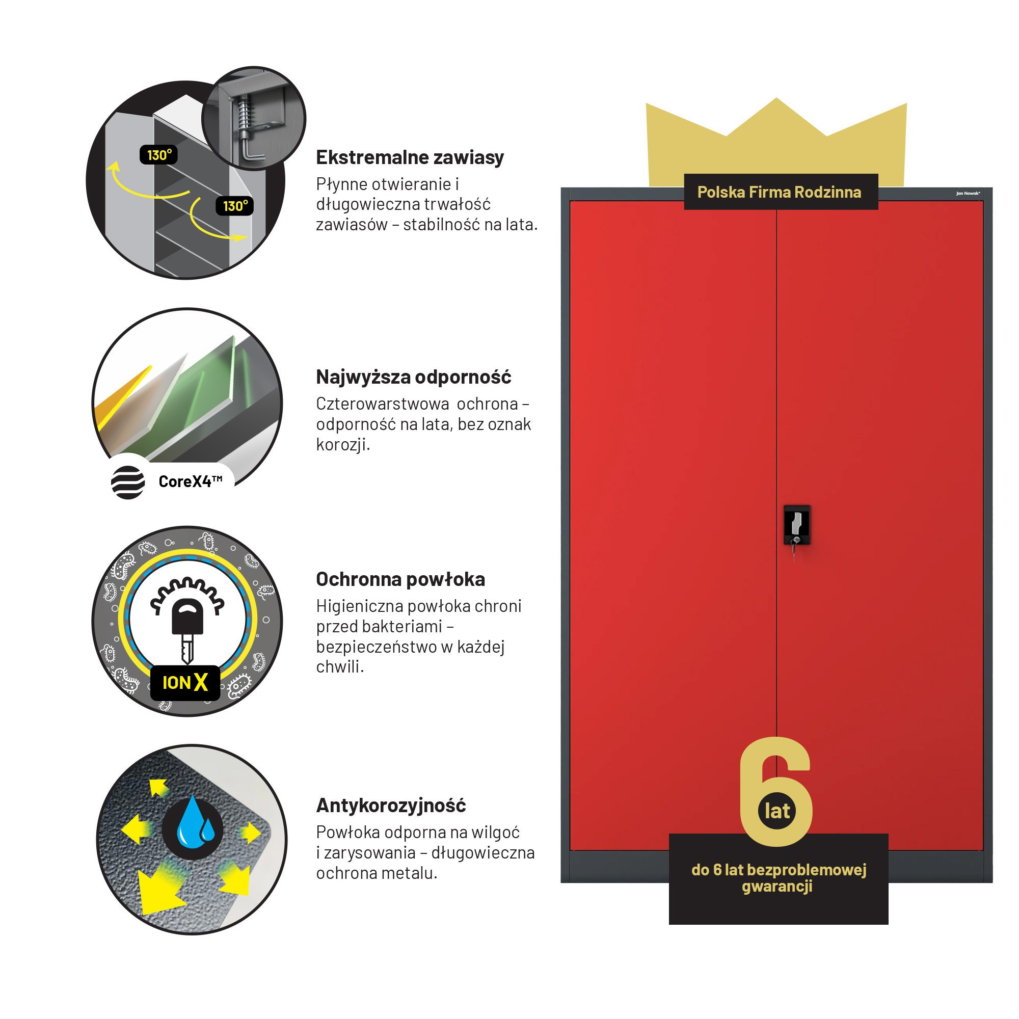 Kancelářská skříň JAN II – antracitově-červená Skříň model JAN II – ocelová, na dokumenty, lékařská, do dílny, antracitově-červená Uzamykatelná kovová skříň JAN II je model z kolekce JAN NOWAK. Překvapí vás maximální propracovanost kancelářského nábytku z hlediska funkčnosti, designu, trvanlivosti a spolehlivosti. S lehkostí v ní uložíte nejen dokumenty, ale i mnoho dalších věcí větších rozměrů, jako jsou nástroje nebo lékařské vybavení. Skříň ideální pro: kanceláře, úřady, firmy, zdravotnická zařízení, dílny, průmyslové závody Pokud hledáte skříň do domácího interiéru v loftovém nebo skandinávském stylu, ocelová uzamykatelná skříň JAN II se také osvědčí díky svému industriálnímu a minimalistickému charakteru. Skříň na dokumenty JAN II – čím se vyznačuje? Skříň na dokumenty JAN II byla práškově lakována v výrazné barevné kombinaci antracitu a červené. Její mimořádně odolná konstrukce bude plnit svou roli po mnoho let a díky plné regulaci polic získáte pro sebe vhodné úložné prostory.Naše kovová skříň byla vybavena otvory na zadní a boční stěně, které umožňují její připevnění ke stěně. Zvýší to bezpečnost každodenního používání. Velmi objemných 60 šanonů je pro ni maličkost! Uzamykatelná na zámek Zámek zajištěný ve 3 bodech (2 klíče v sadě). Solidní a odolná Ocel vysoké kvality o tloušťce 0,6 mm - odolná proti mechanickému poškození, práškově lakovaná. Vysoce funkční 4 police nastavitelné po 25 mm, každá s nosností až 50 kg. Kovová uzamykatelná skříň JAN II: výška 185 cm, šířka 115 cm, hloubka 40 cm, hmotnost 52 kg, barva antracitově-červená RAL 7016 – RAL 3020 Výhodná řešení Záruka kvality! Solidní provedení a nejlepší materiály. To je hodnota, kterou je těžké najít jinde na trhu! Atesty Vyberte skříň s certifikátem PZH. RODO 2018 Zaměřte se na kancelářský nábytek speciálně navržený podle RODO 2018. Stojí za to vědět: skříň je dodávána v částech (vyžaduje vlastní montáž) Vystavujeme faktury DPH Kolekce kancelářského nábytku Vynikající pověst nás zavazuje k ještě většímu úsilí. Jsme jedním z největších dodavatelů ocelových skříní v Evropě a nastavujeme si laťku výše než ostatní!