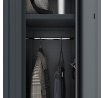 Skříň KACPER II je vybavena praktickými detaily, které usnadňují organizaci a používání. Držáky na štítky na dveřích umožňují snadnou identifikaci obsahu skříně a usnadňují orientaci v šatně. Antracitová barva skříně se hodí do každého interiéru a dodává mu moderní a elegantní vzhled.