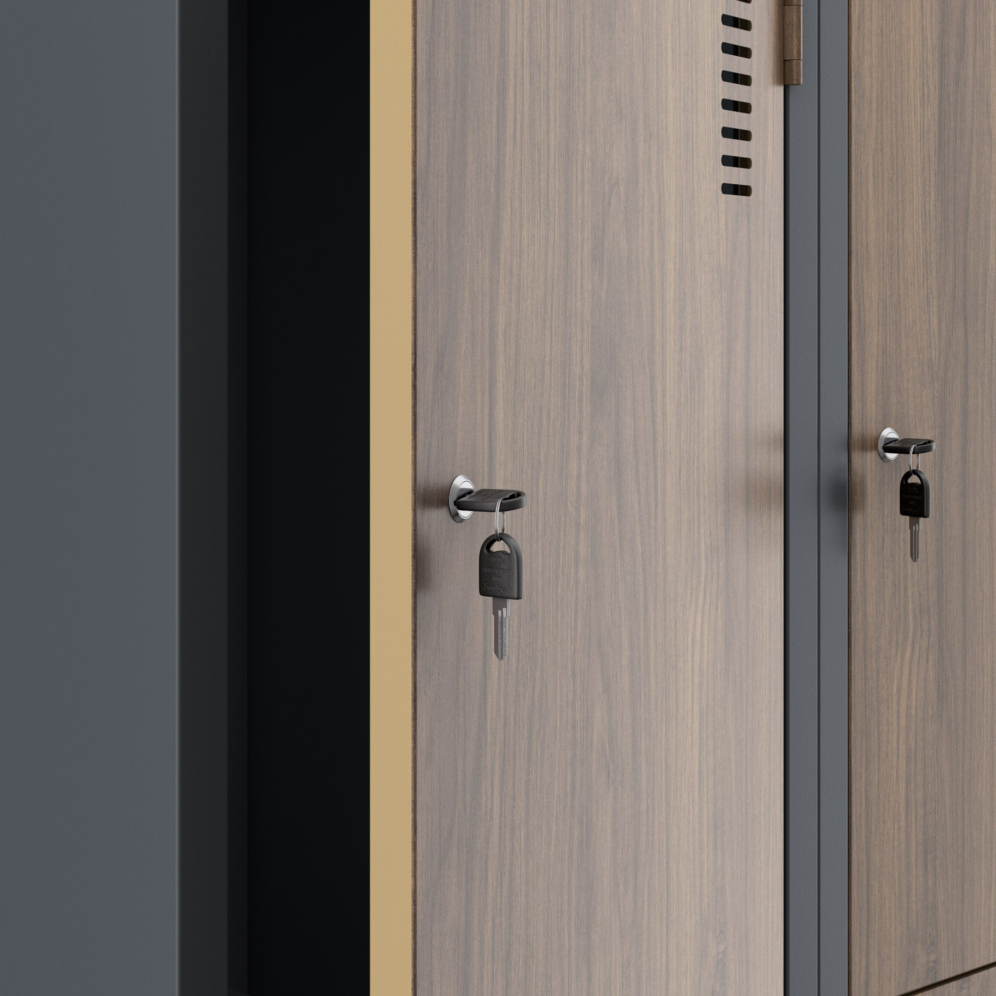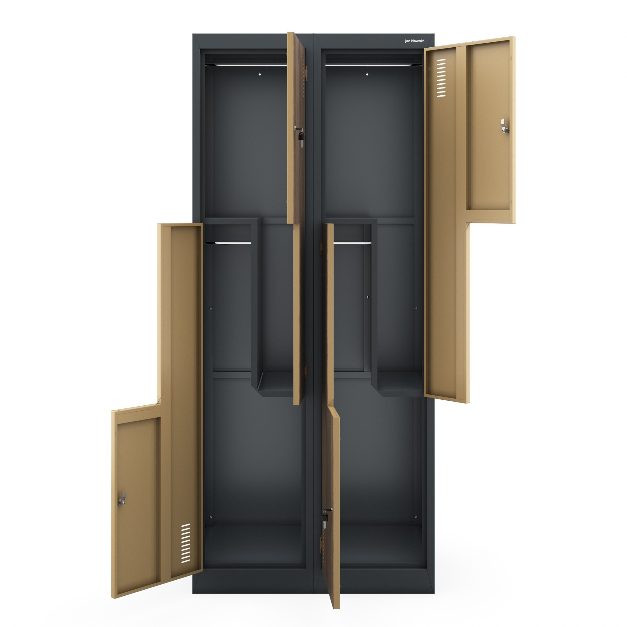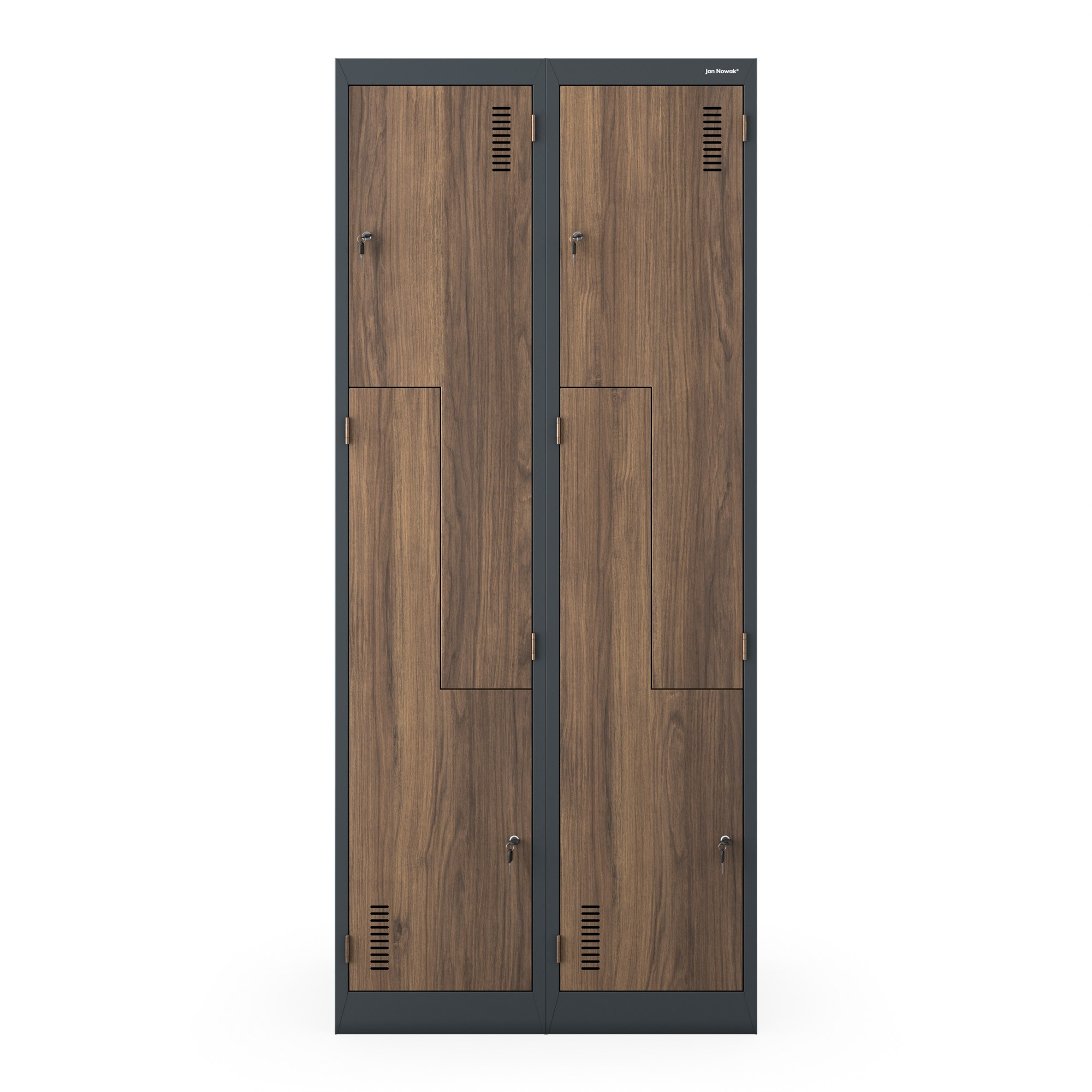 Kovová šatní skříň loft JULIA, EcoDesign antracitová/ořechová Šatní skříň JULIA Eco Design je důkazem, že lze najít elegantní řešení, aniž by se muselo rezignovat na vysokou trvanlivost a odolnost. 4 výklenky v unikátním tvaru zajišťují, že se dovnitř vejde více předmětů než ve standardních modelech, a navíc se na dlouhých oděvech neobjeví záhyby. Model JULIA je díky své solidní konstrukci a skvělému vzhledu nejčastěji vybírán do moderních, loftových prostor. Kovovou skříň JULIA použijete v šatnách: bazénových, sportovních, pracovníků, školních, pro zdravotnický personál. Dbejte na výjimečný styl. Série Eco Design jsou užitkové nábytkové kusy vytvořené zcela z oceli. Jejich zvláštností jsou dveře vypadající, jako by byly vyrobeny z pravého dřeva. Díky inovativnímu, vícefázovému výrobnímu procesu se nám daří získat čela, která jak barvou, tak texturou připomínají ořechové dřevo. V důsledku toho získáte kovovou skříň ve velmi atraktivním provedení, a navíc svými volbami nepřispíváte k kácení stromů. Výhody šatní skříně s přihrádkami ve tvaru písmene L: V kompaktním rámu se nacházejí 4 prostorné přihrádky. Uživatelé pohodlně pověsí oblečení na tyč a nebudou se obávat pomačkání, protože výška skříněk v největším místě je až 114 cm. Umístěné větrací otvory na každé přední straně se postarají o správnou cirkulaci vzduchu a skvělý stav uložených věcí. Jednobodový zámek a zesílené dveře zajistí bezpečnost předmětů během nepřítomnosti majitele. Přidáváme dva klíče ke každému zámku, abyste byli připraveni na všechny neočekávané situace. Nespolehlivý materiál Metalové šatní skříně jsou nejlepším a nejtrvanlivějším řešením zejména pro místa, kde se pohybuje mnoho lidí. Pro výrobu modelu JULIA používáme ocelový plech o tloušťce 0,6 mm, který je chráněn práškovým lakováním. Skříň s ochranným povlakem získává odolnost proti korozi a mechanickému poškození. Nepohlcuje vlhkost a je snadno čistitelná. Určena pro samostatnou montáž Montáž skříně JULIA není složitá, zabere přibližně 30 minut. Pokud chcete, aby celý proces proběhl rychle a bezproblémově, stačí se před zahájením práce seznámit s návodem v papírové nebo video formě (najdete jej v horní části stránky). Po složení skříň ohromuje stabilitou a péčí o nejmenší detaily. Skříň typu L JULIA - informace: Barva: antracitová (RAL 7016) / ořech Výška: 185 cm Šířka: 80 cm Hloubka: 45 cm Hmotnost: 42 kg Záruka kvality